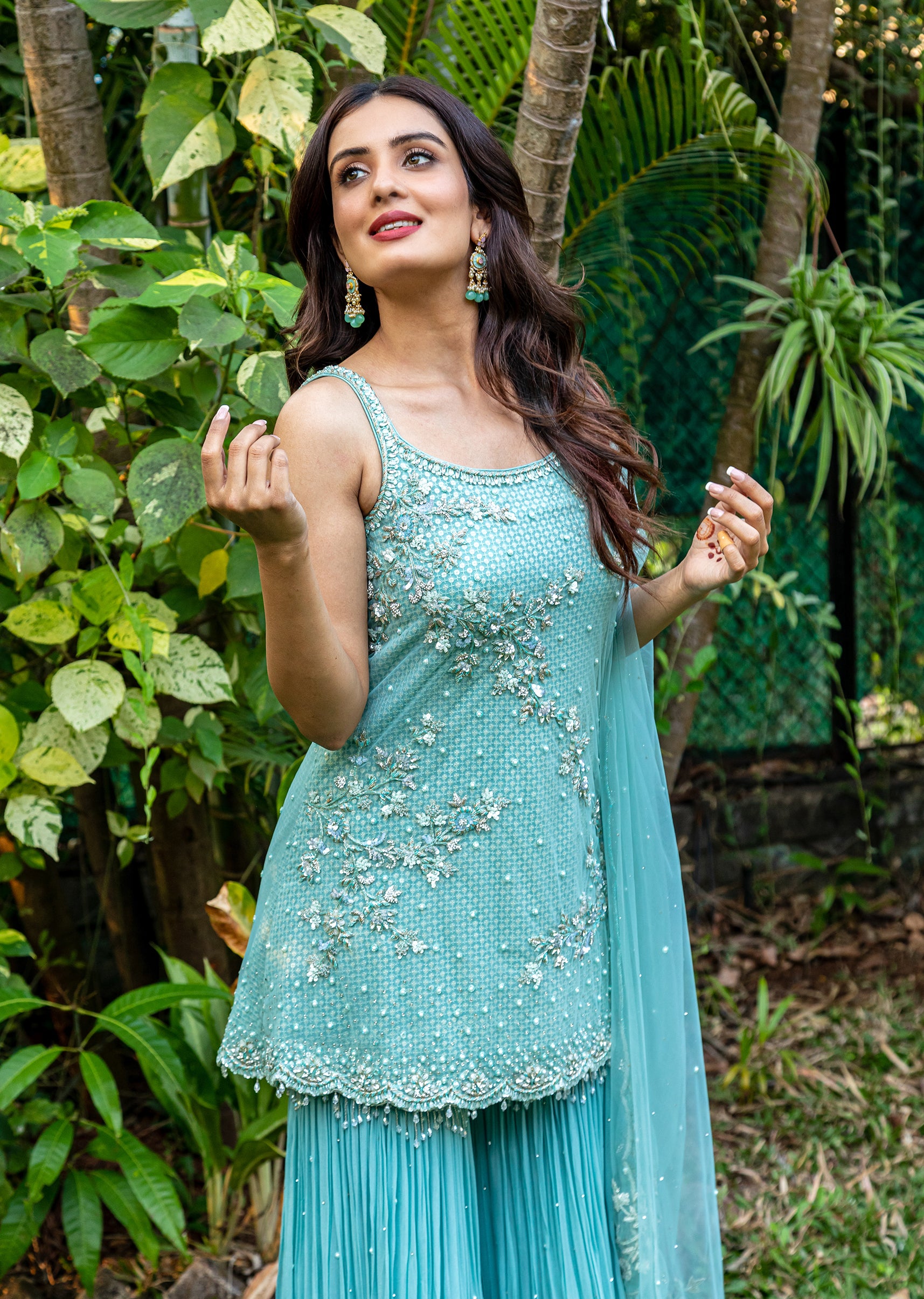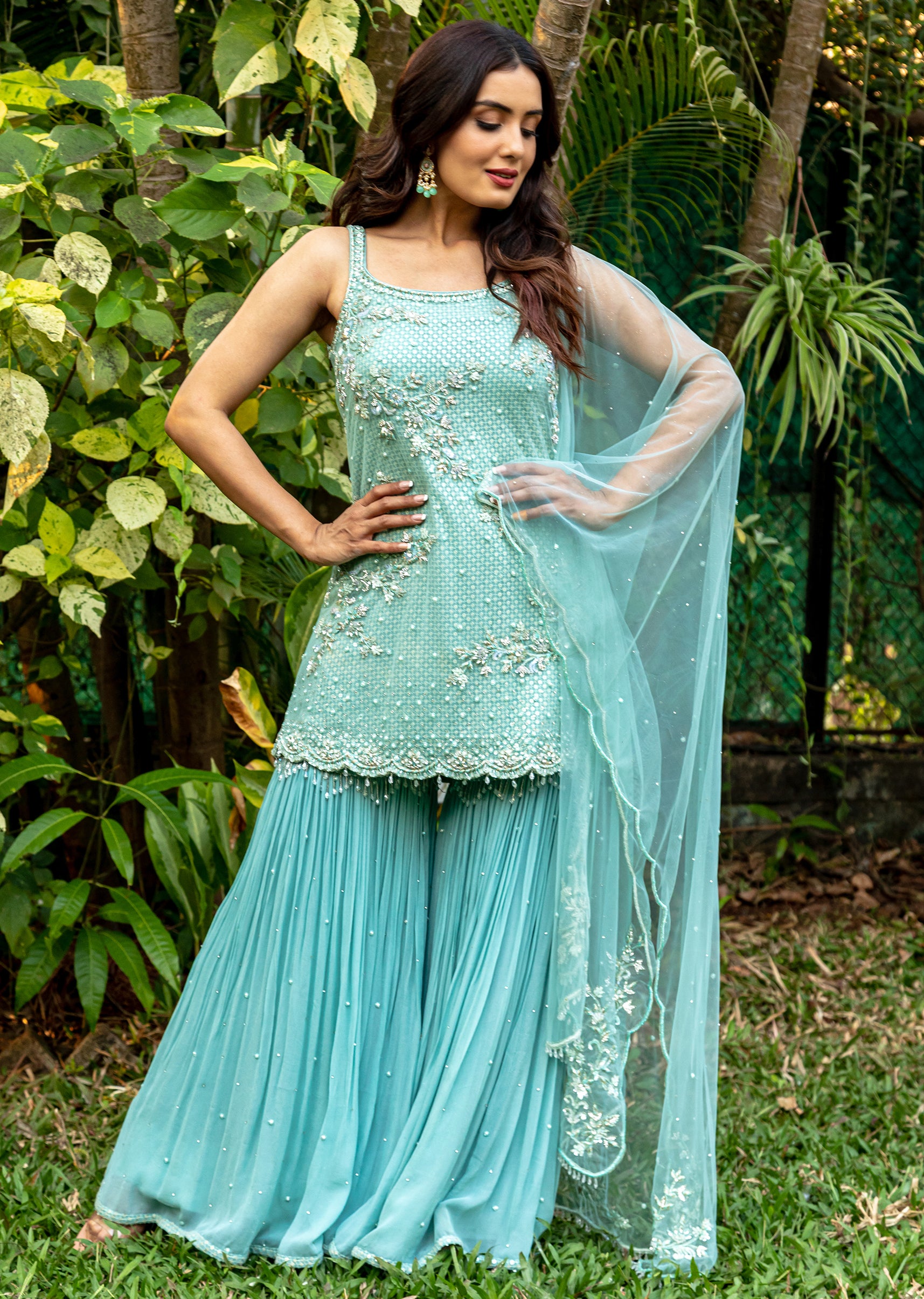 Cerulean blue net kurta and dupatta embroidered in sequins, zardozi and crystal tassels; paired with a pleated georgette garara with dispersed beads and sequins.