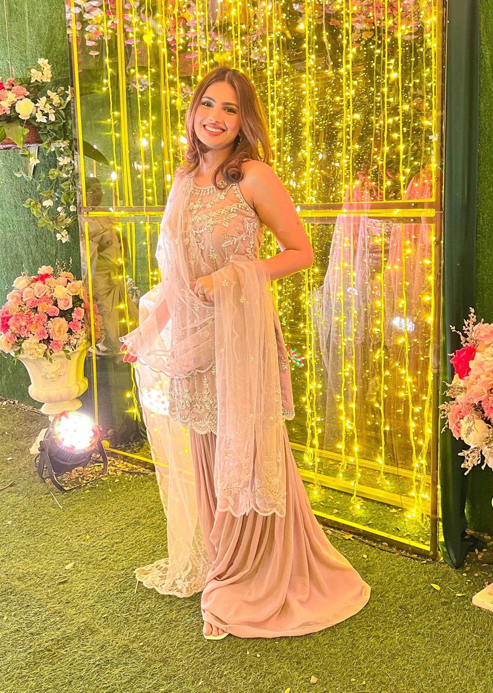 Mauve blush net kurta and dupatta embroidered with crystals, pearls and zardozi paired with a solid mauve georgette garara