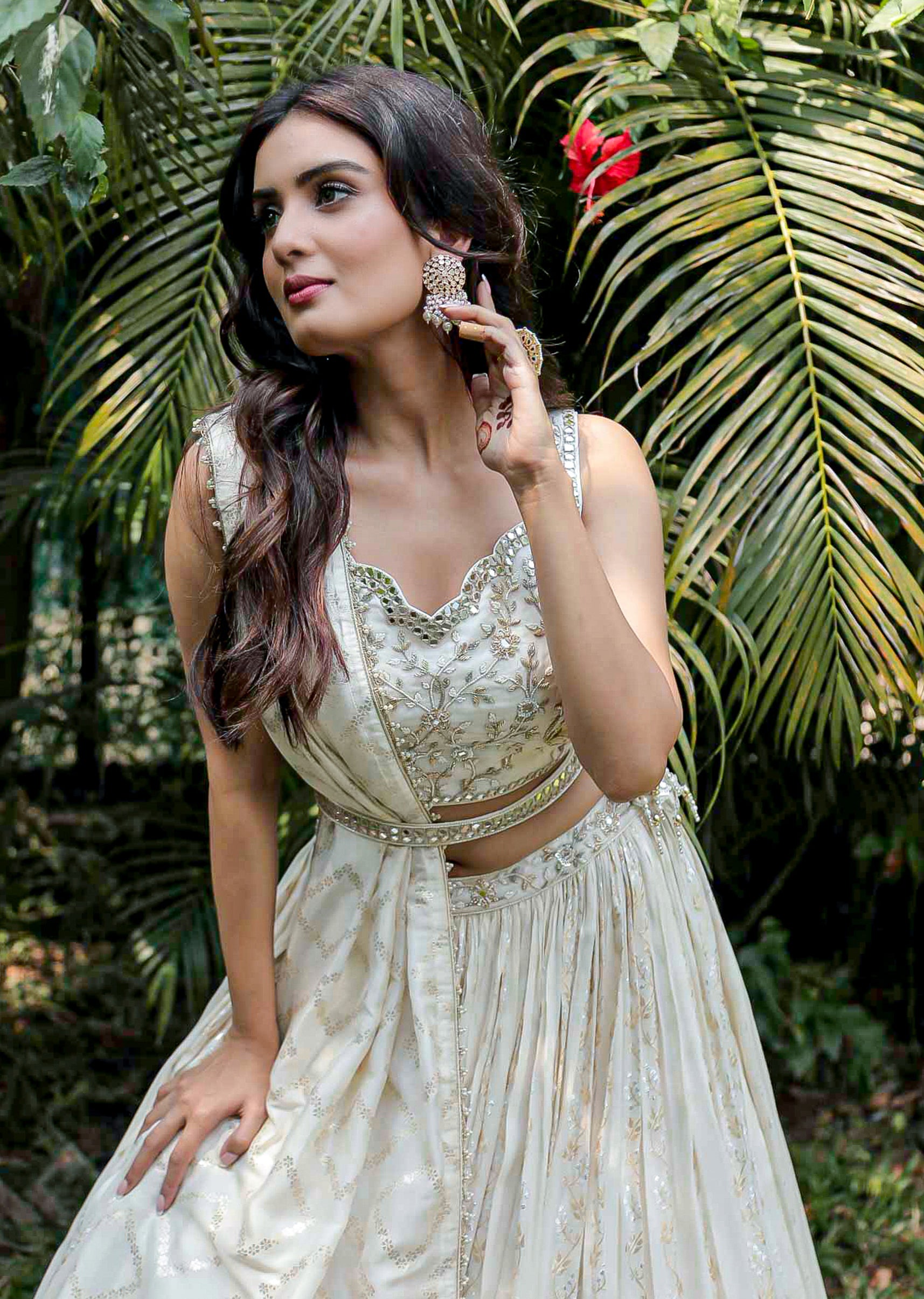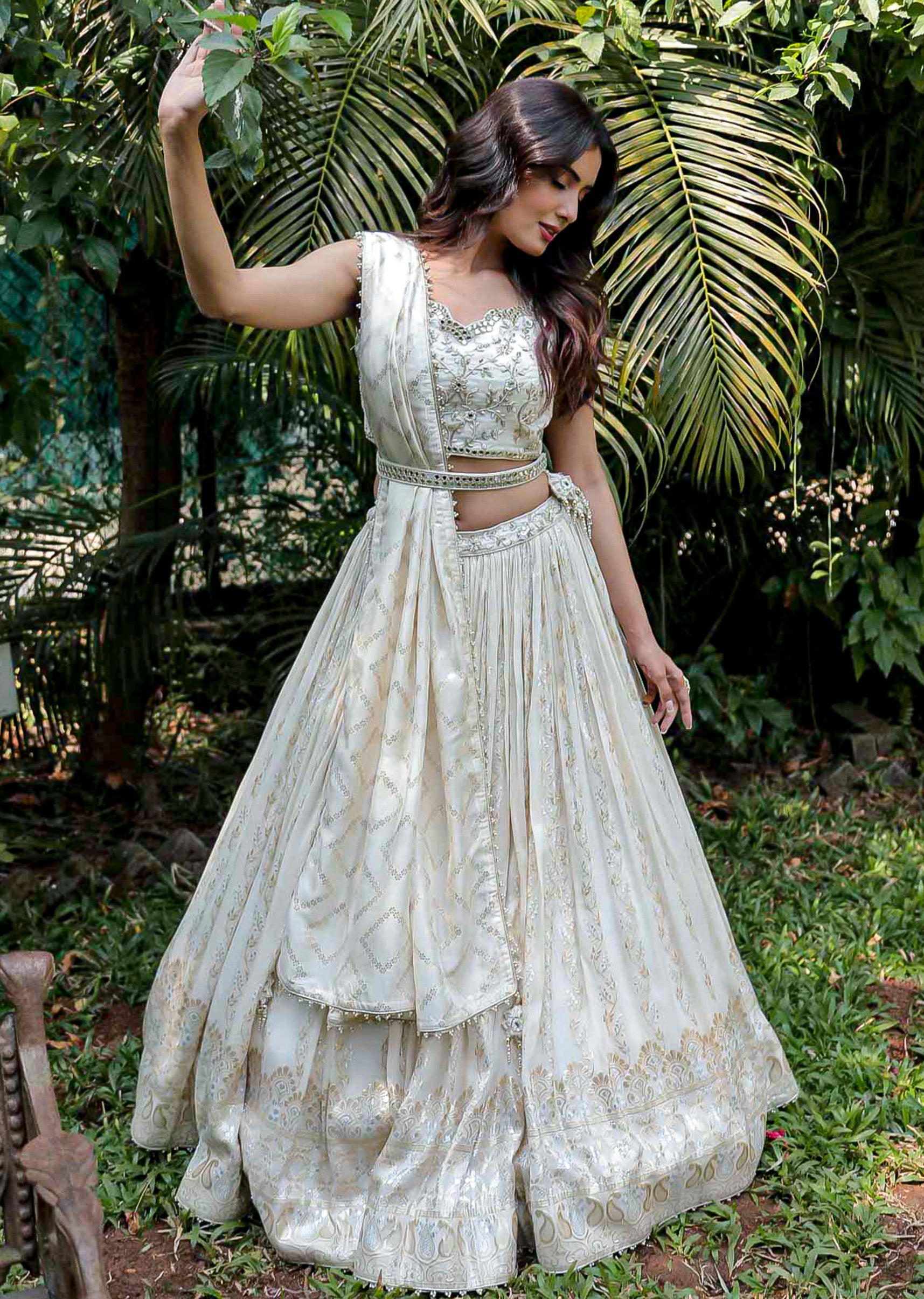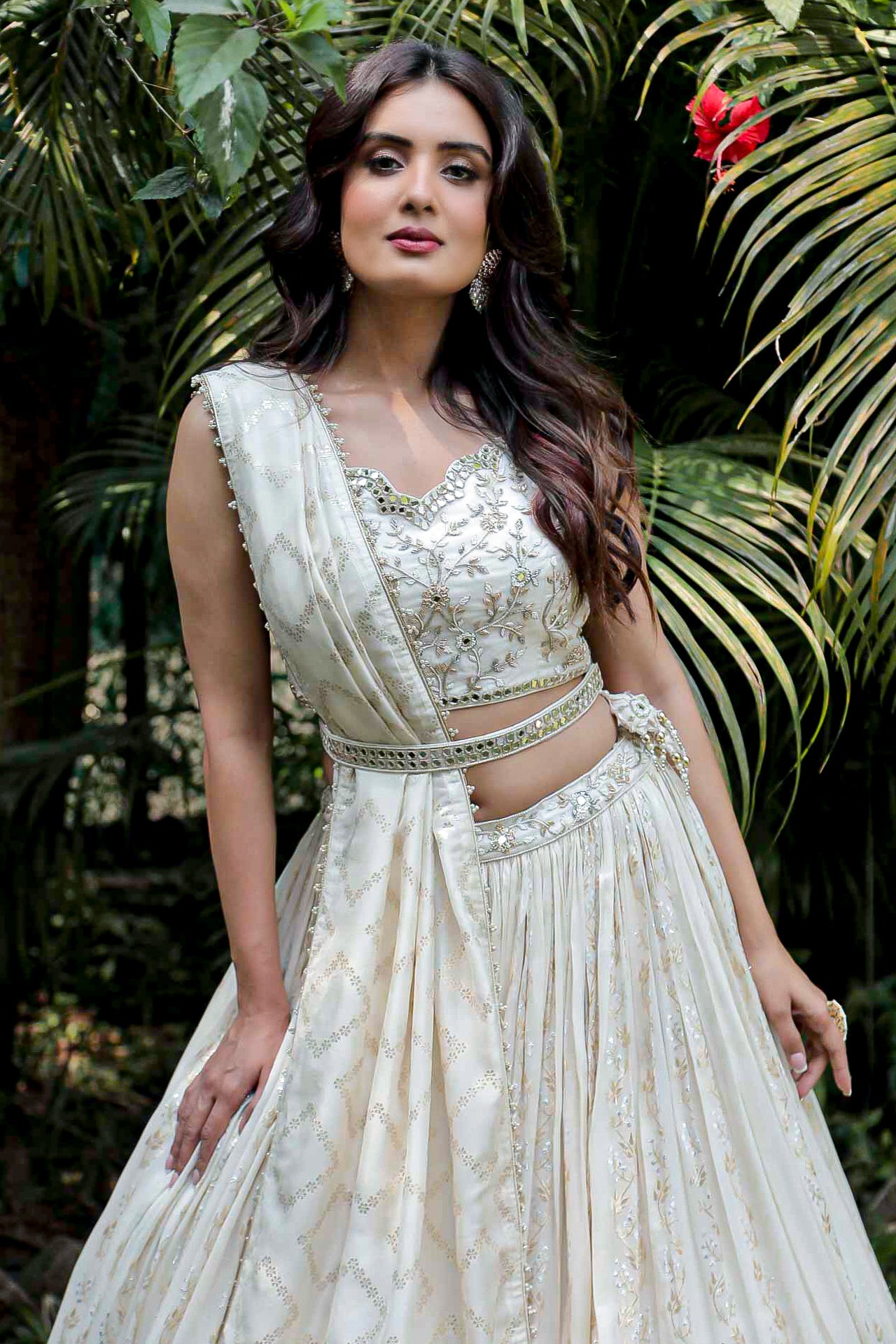 Ivory and antique gold chanderi jacquard silk lehenga and dupatta, ivory organza choli and belt embroidered in zardozi, mirrorwork and beads.