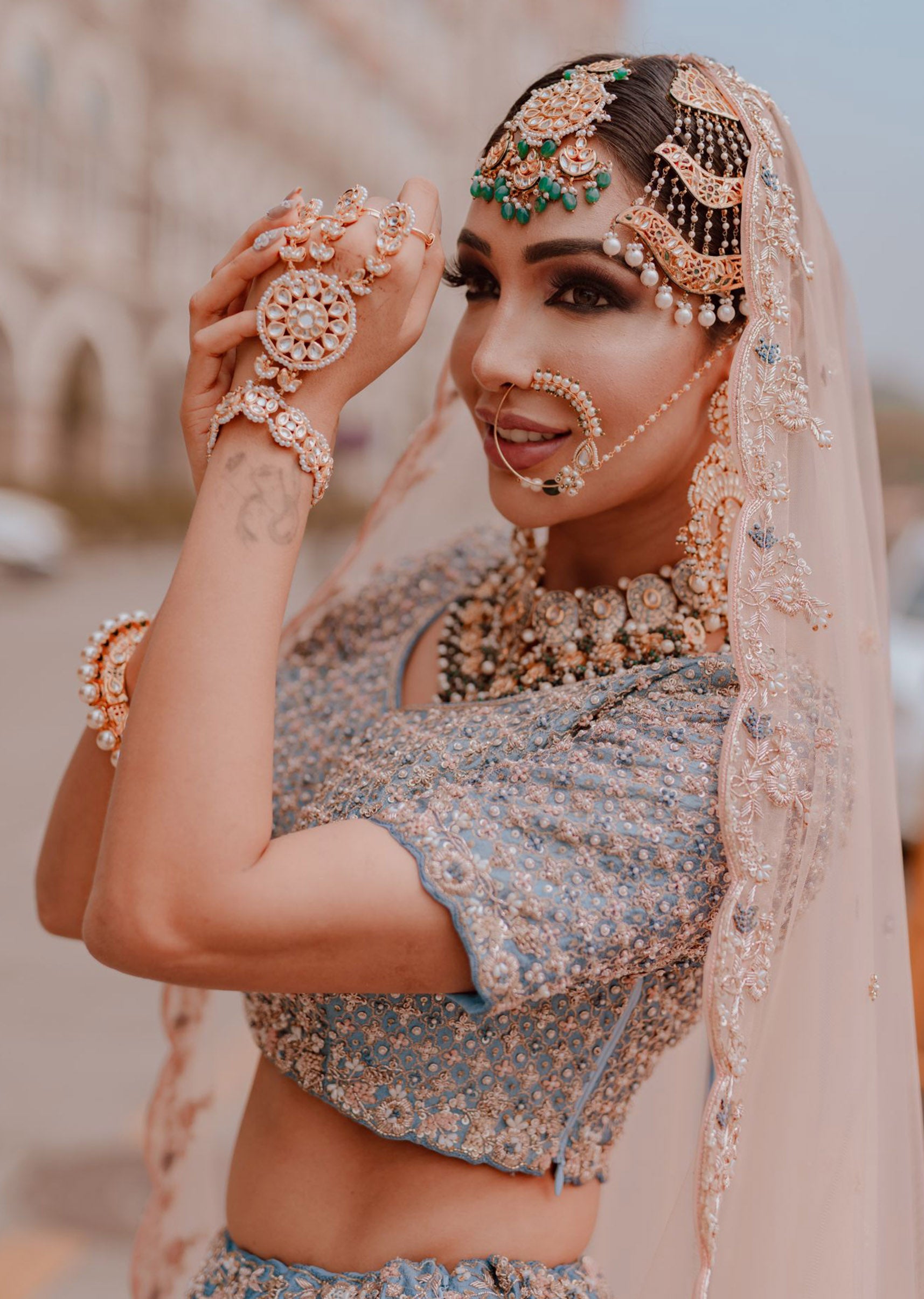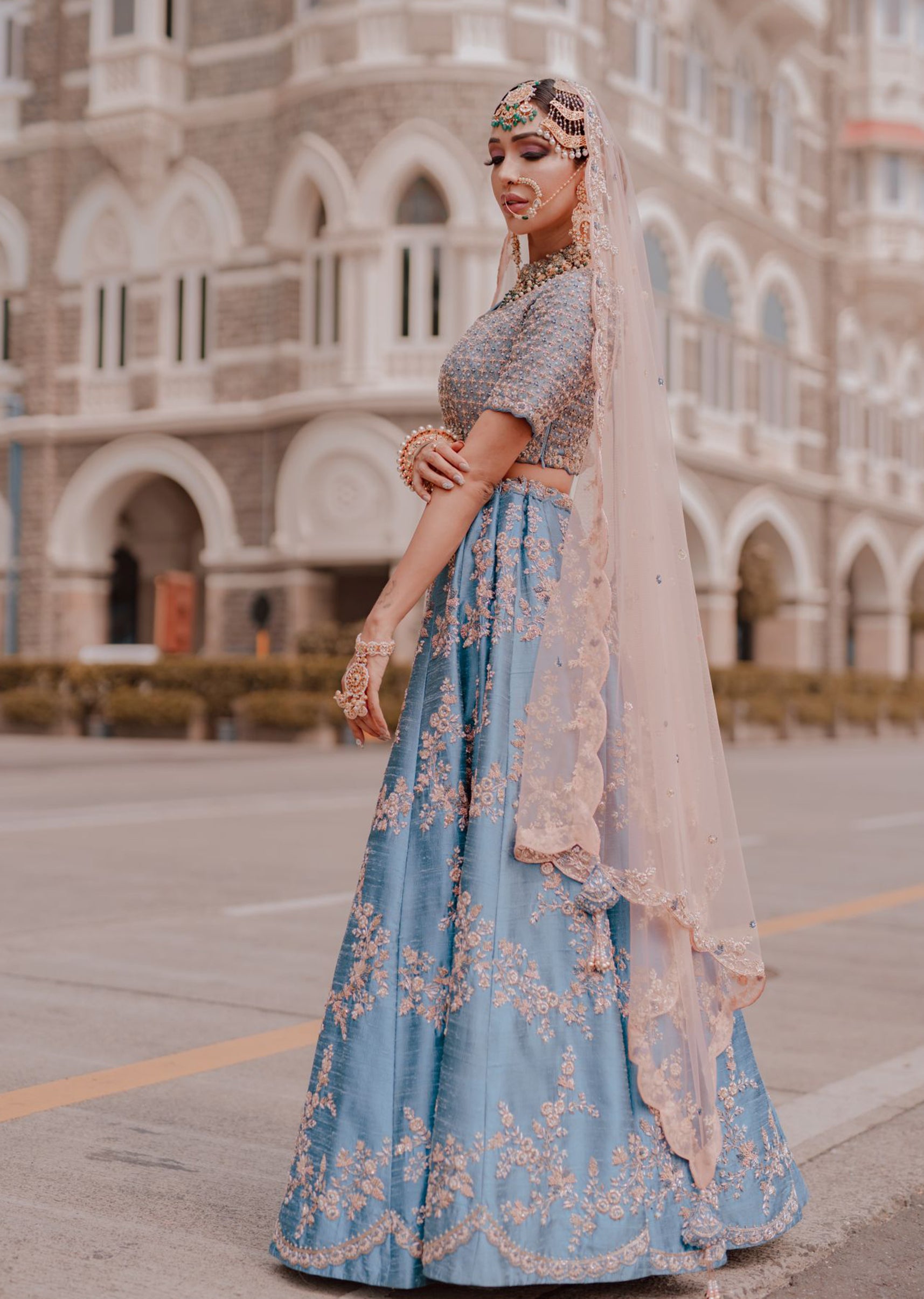 Cobalt Blue silk lehenga choli with pearls and zardozi embroidery; paired with a blush peach net dupatta with scallop hem zardozi embroidery.