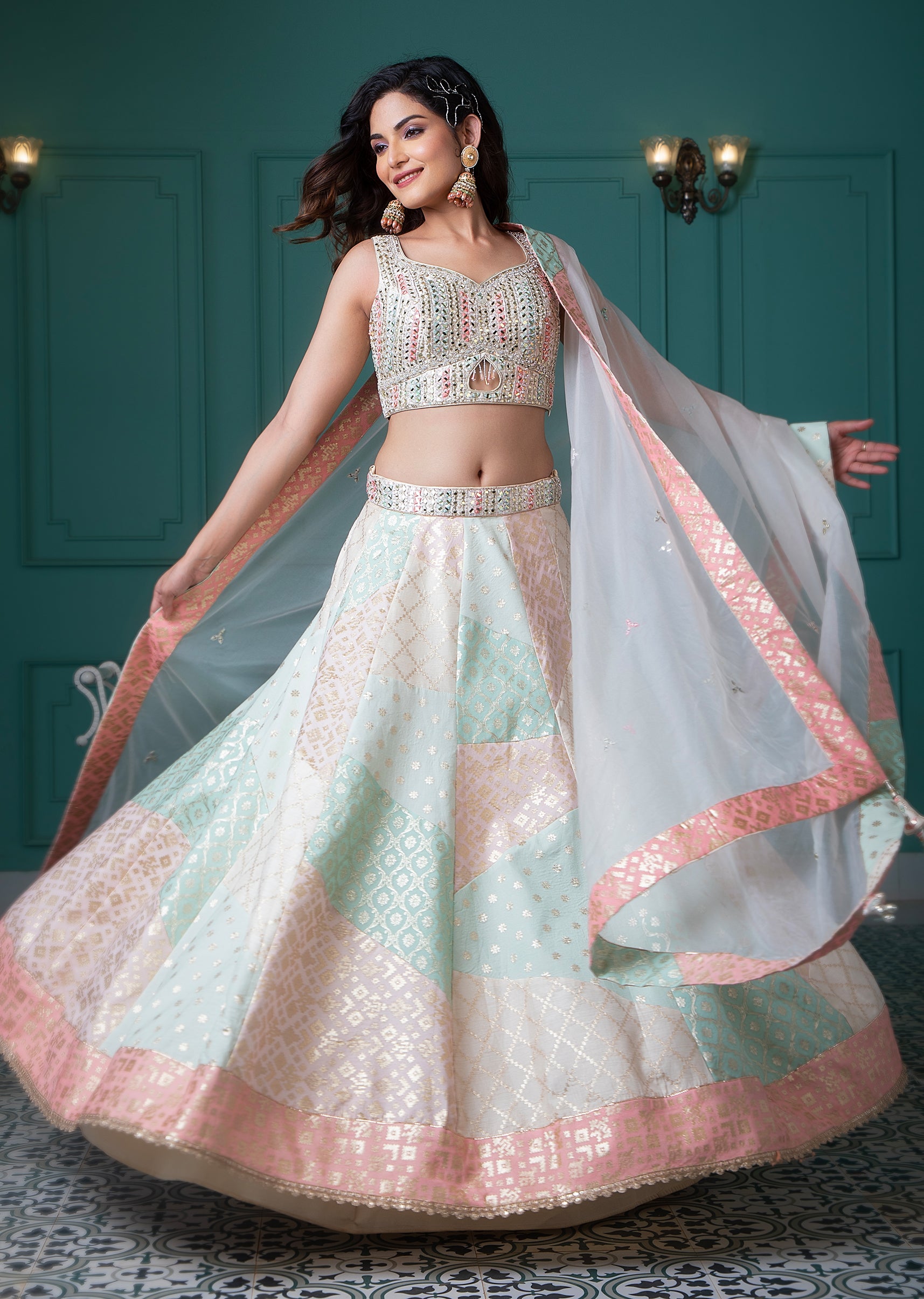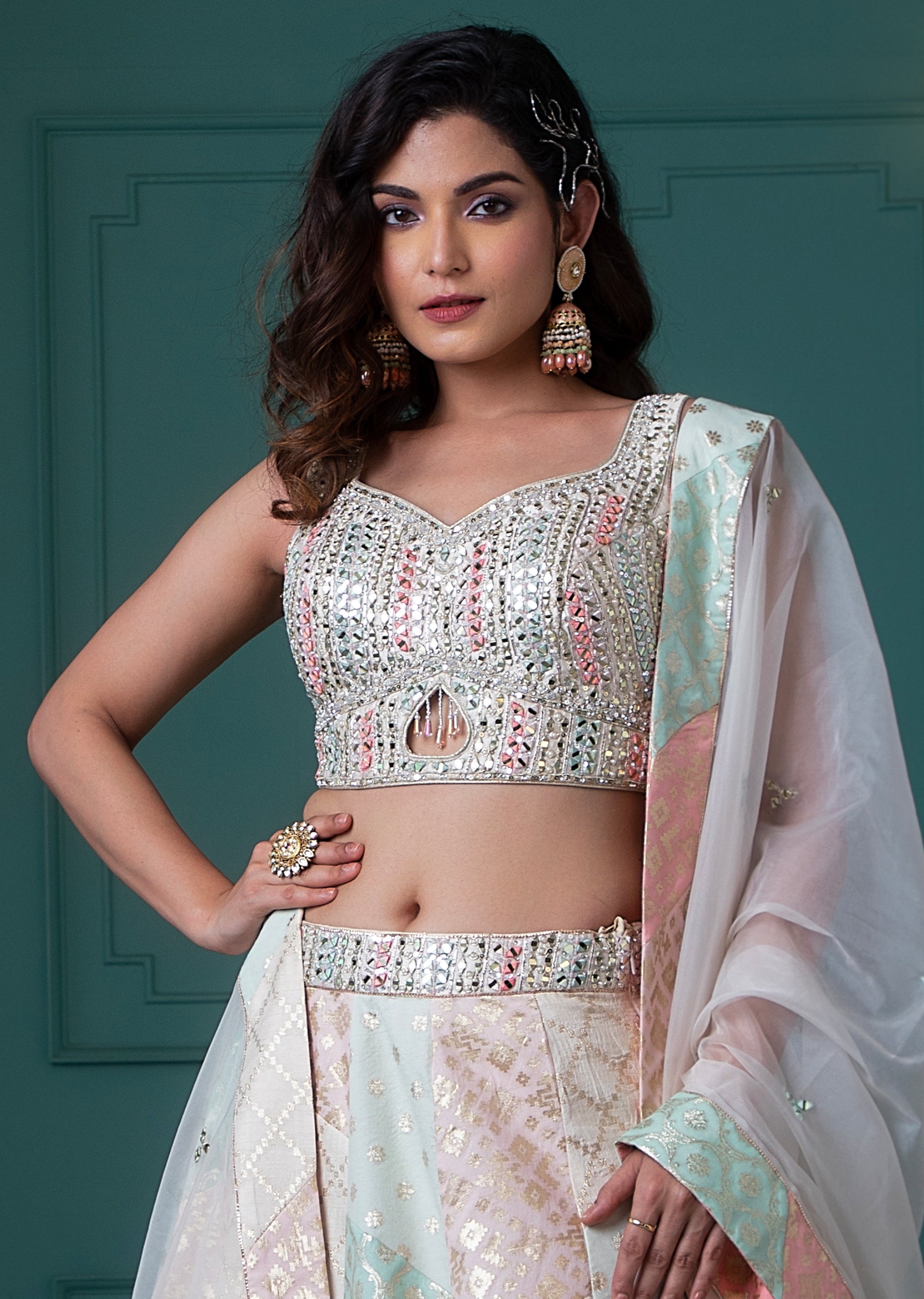 Ivory silk choli with pastel thread embroidery, mirror work, and gold thread, paired with a pastels chanderi skirt and a shaded banarasi dupatta, creates a truly magnificent outfit.
