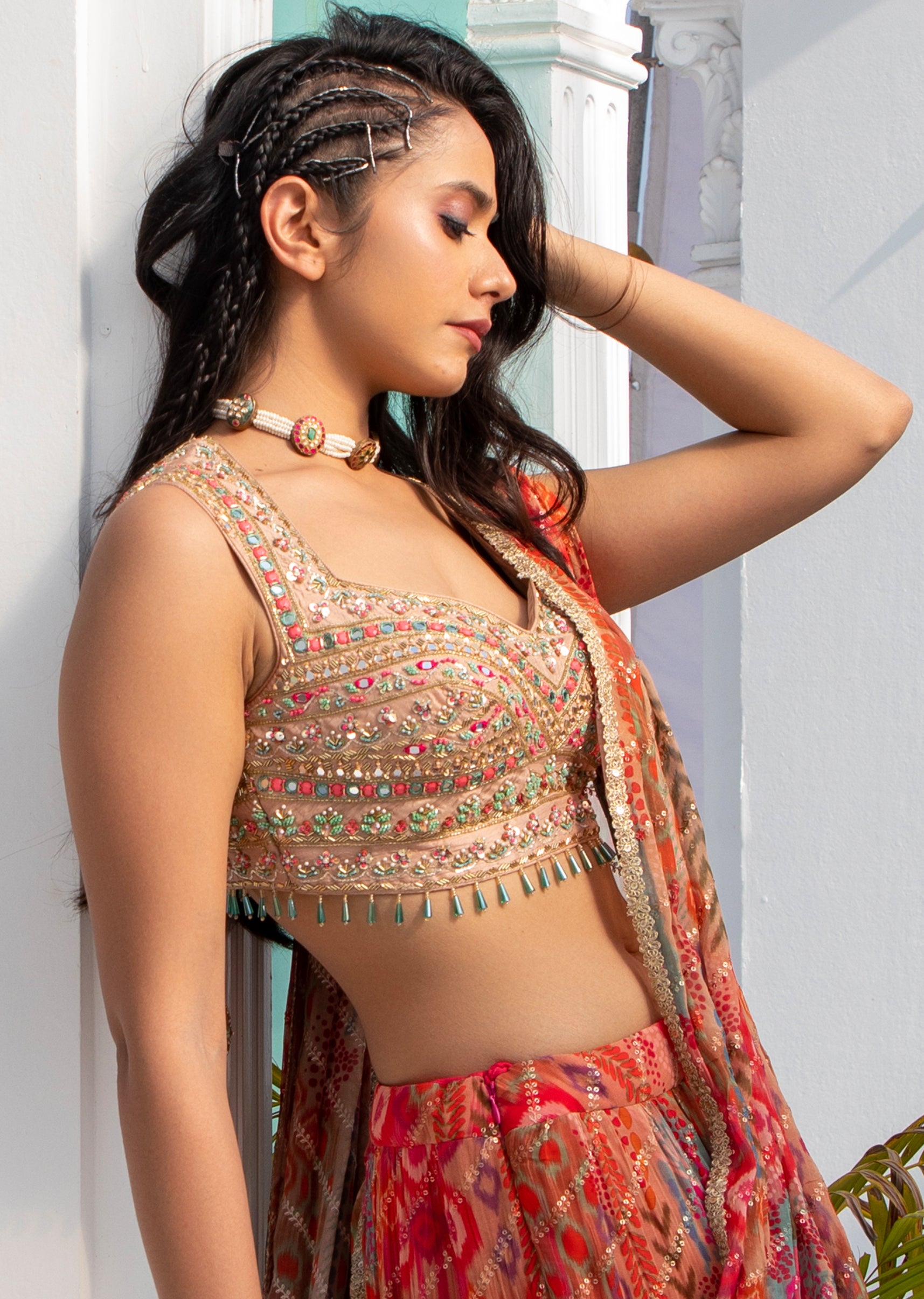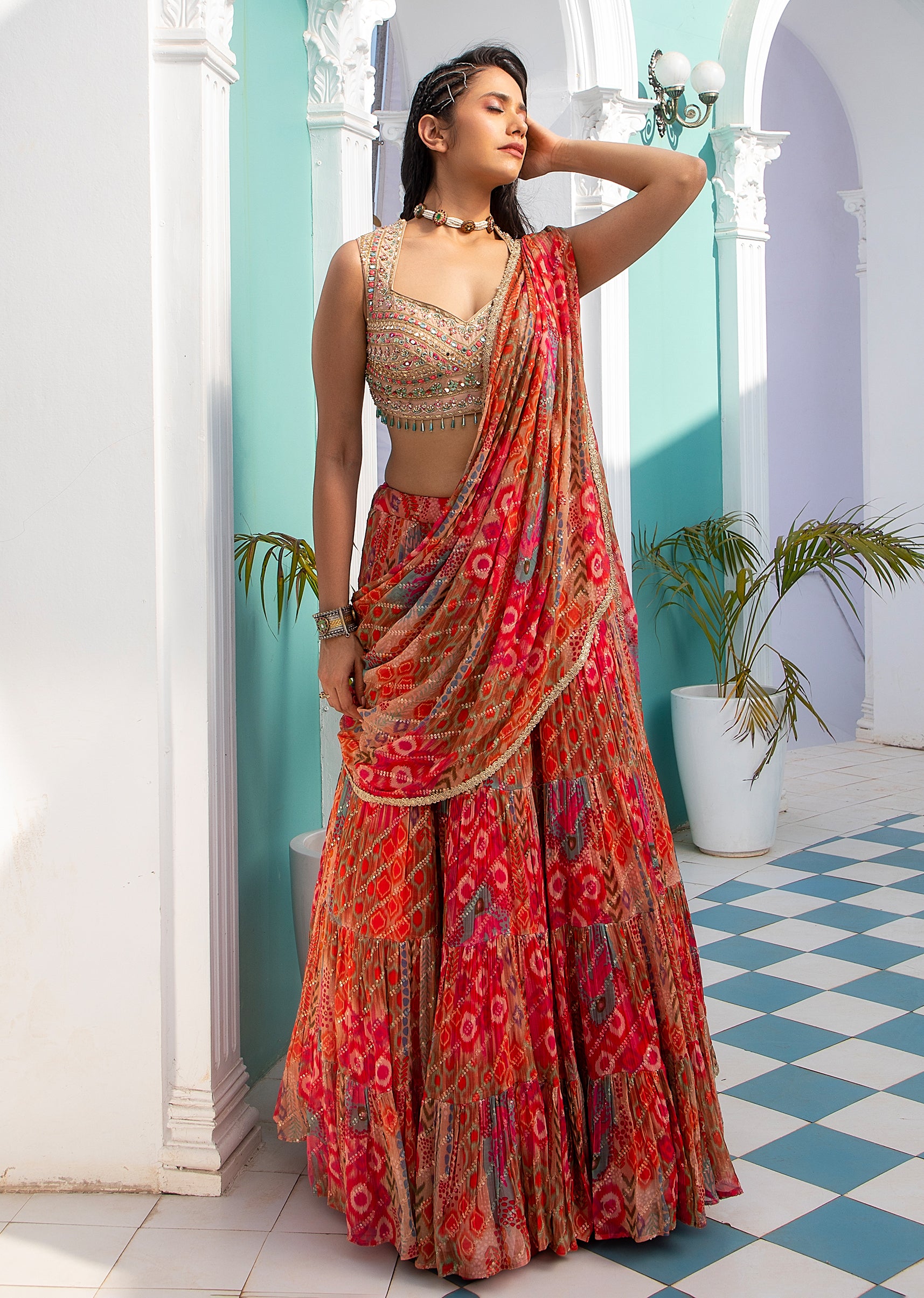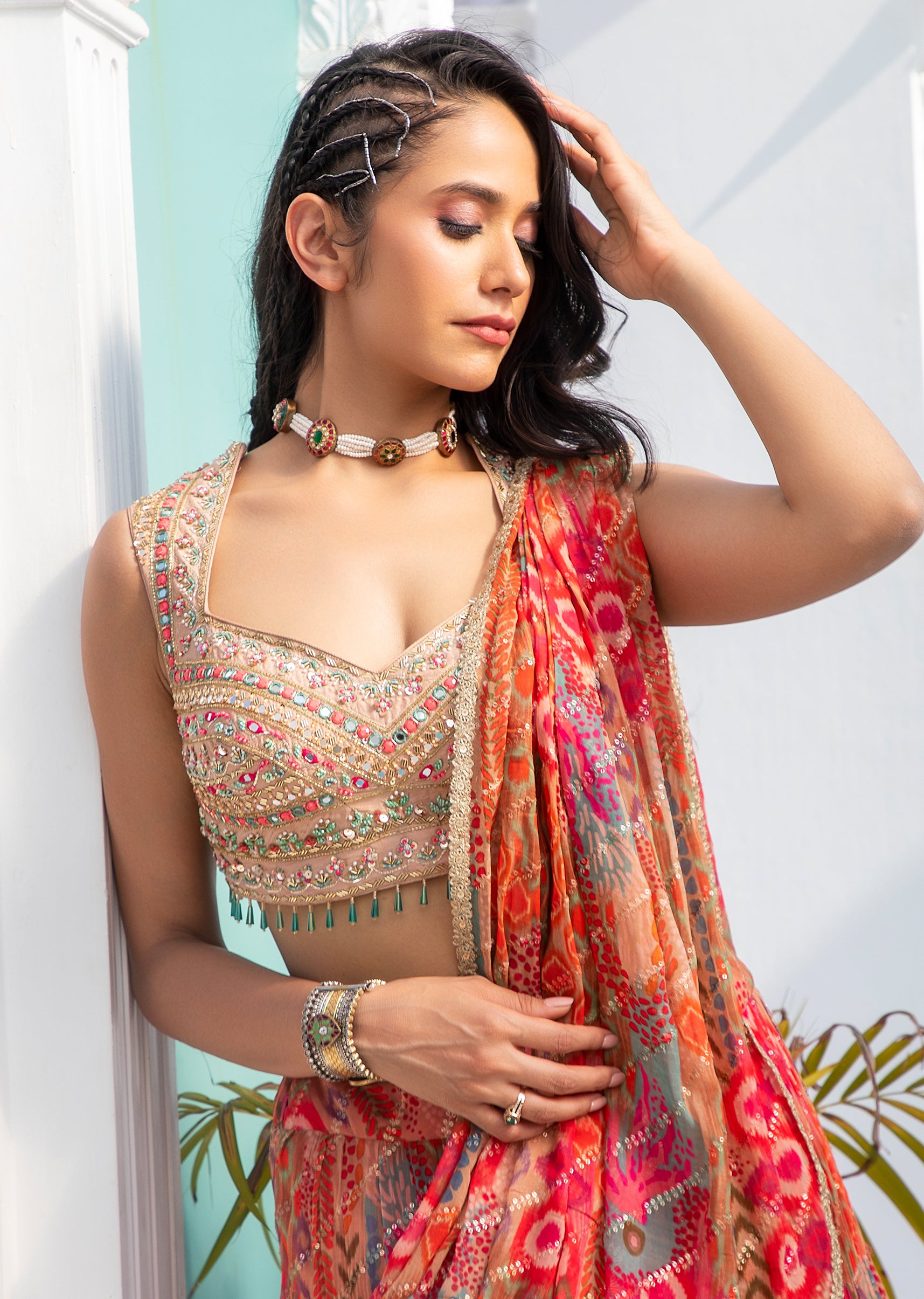 Beige choli with contrast work and a stitched printed skirt saree creates a contemporary and fashion-forward look.