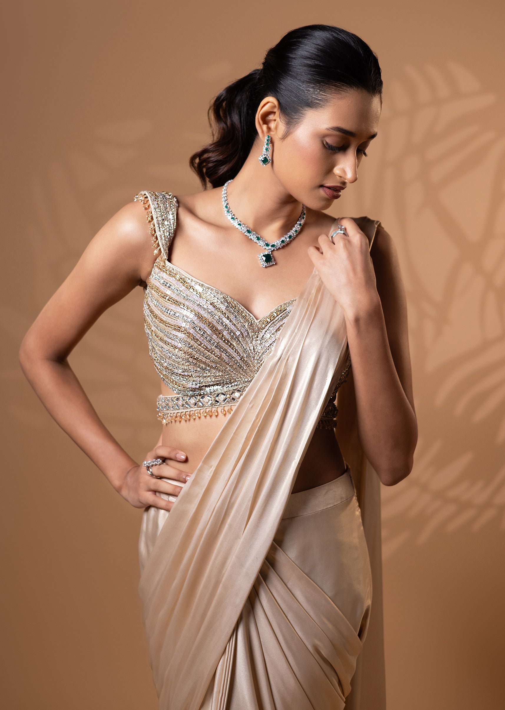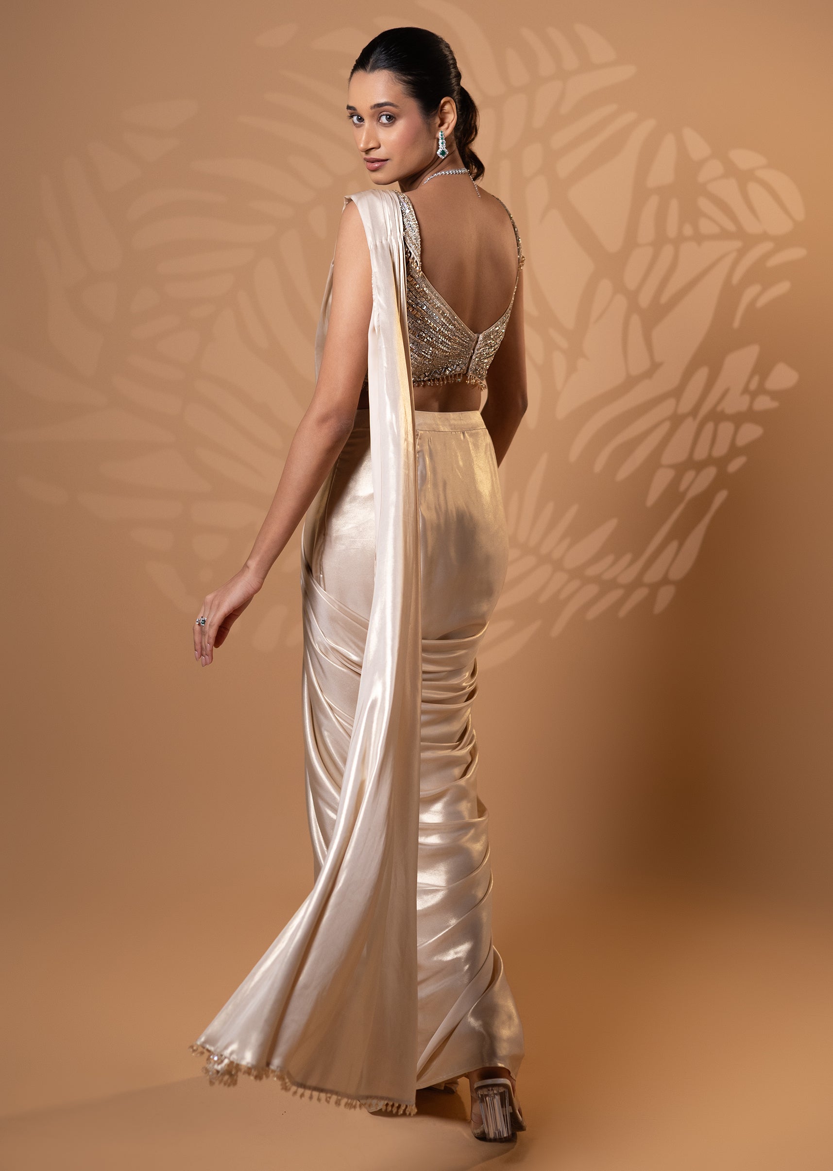 Pre-draped saree set in champagne with a structured drape and intricately embellished blouse. A modern silhouette crafted for bridesmaids to shine at cocktail nights or wedding receptions