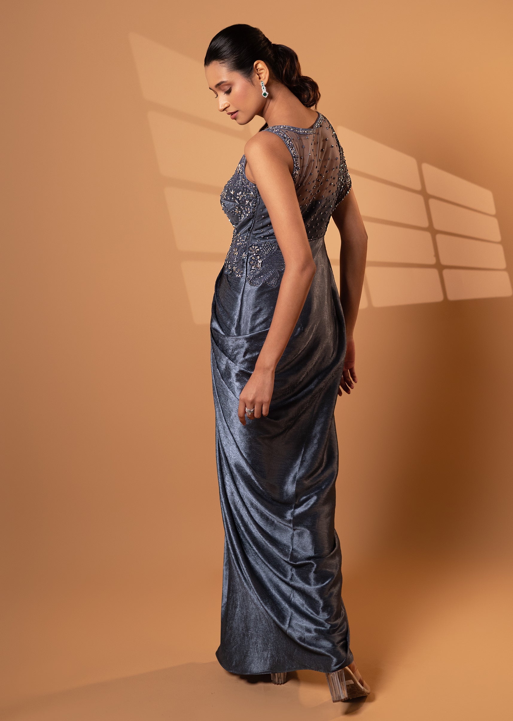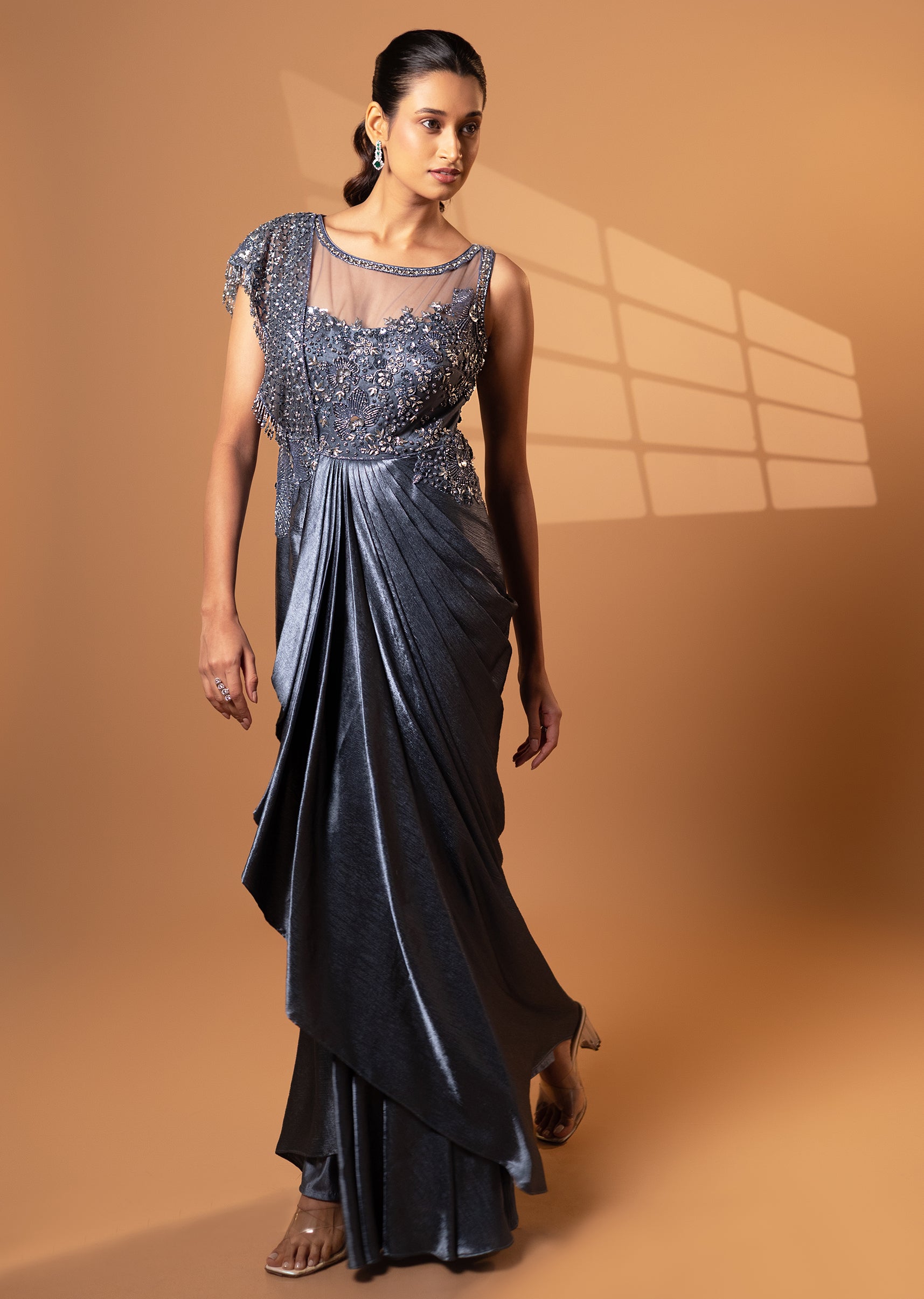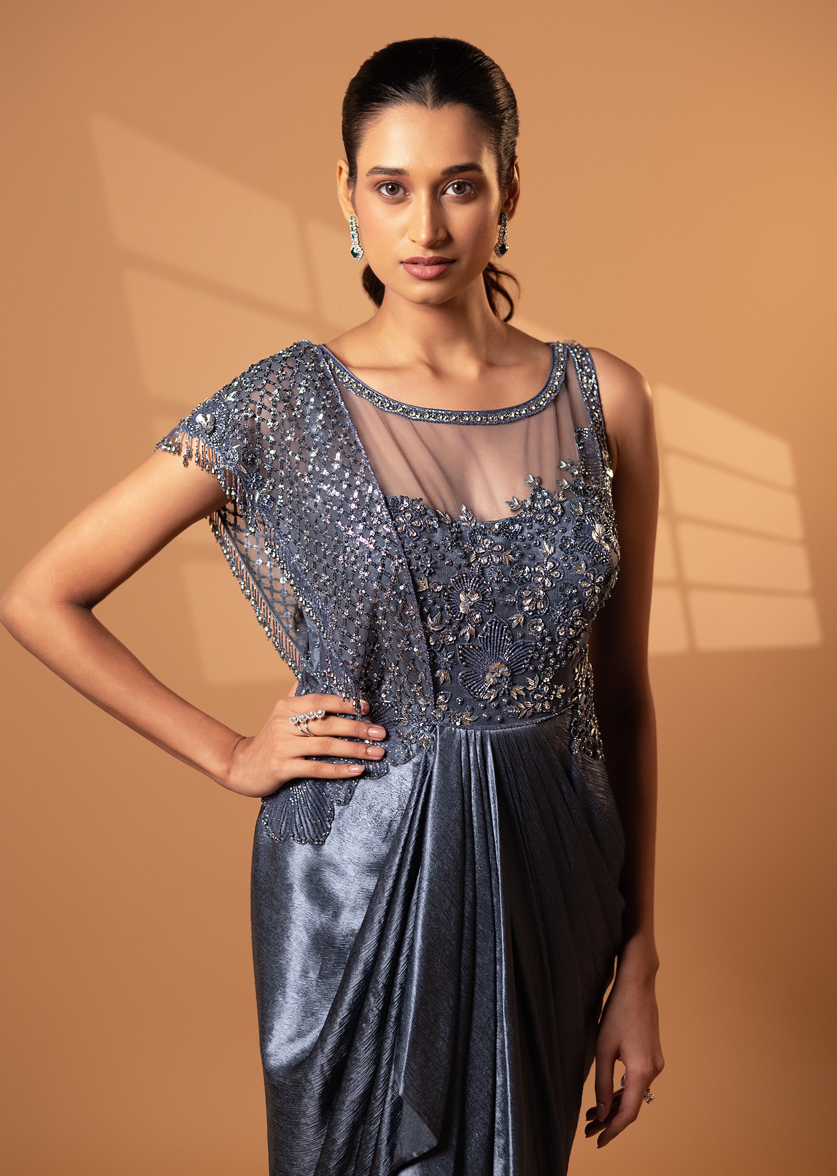 Pre-draped gown in charcoal grey featuring a beaded bodice with attached cape sleeves and fluid pleats. A perfect pick for bridesmaids attending cocktail nights or wedding receptions