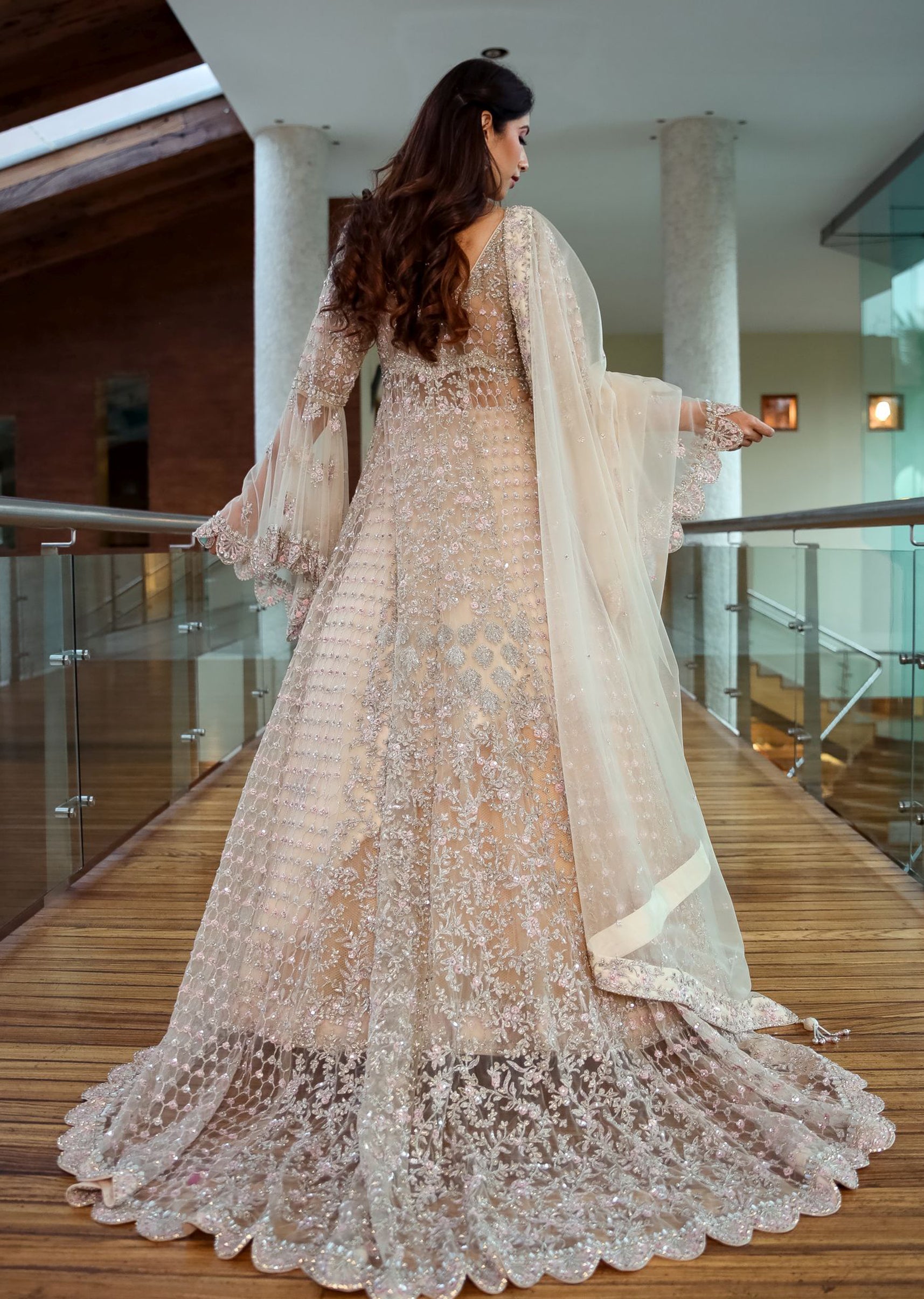 Blush cream net trail anarkali with flared sleeves and net dupatta embroidered all over with intricate mughal garden motifs in zari, sequins and resham; paired with a blush cream net lehenga with embroidered buttis and border.