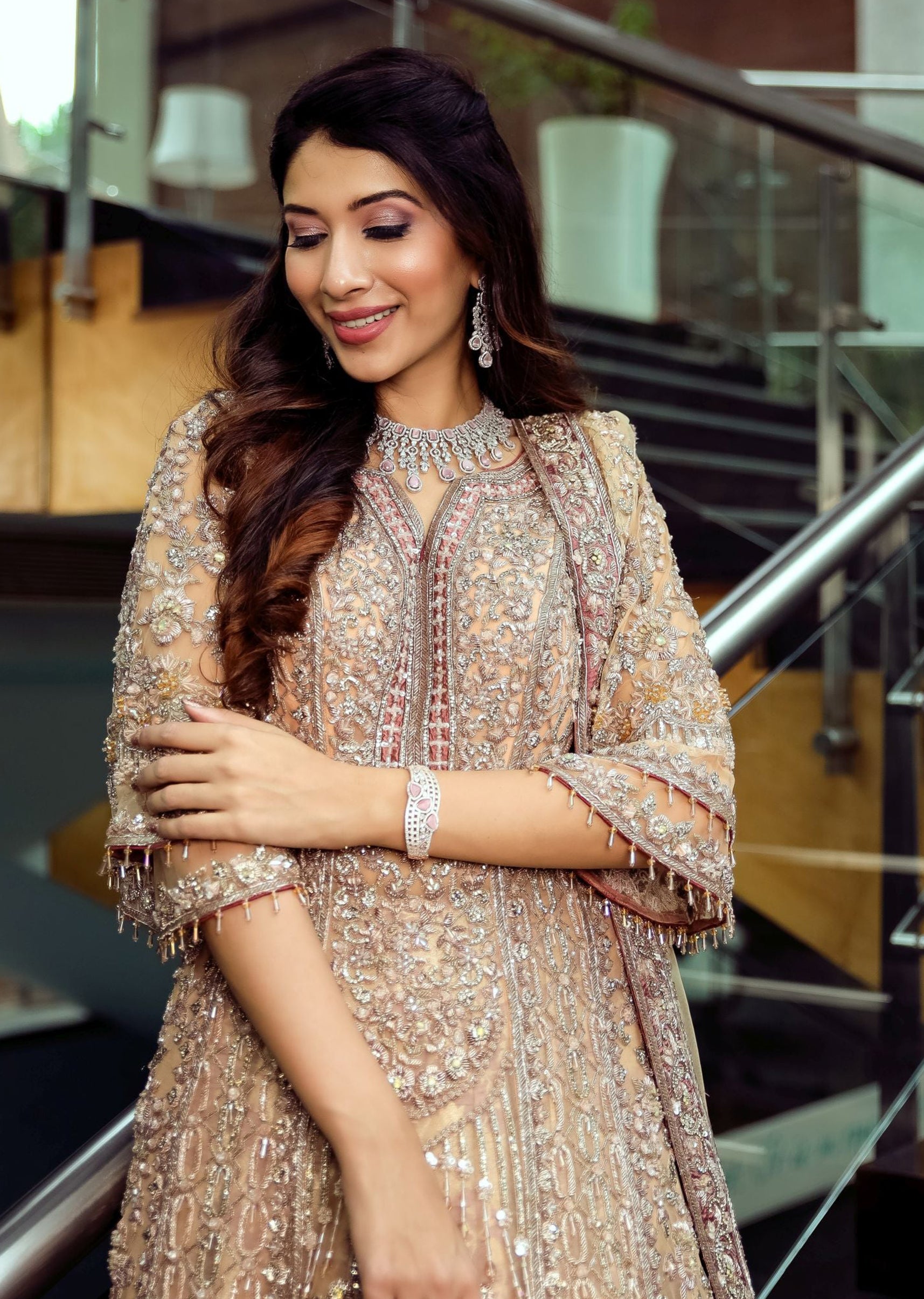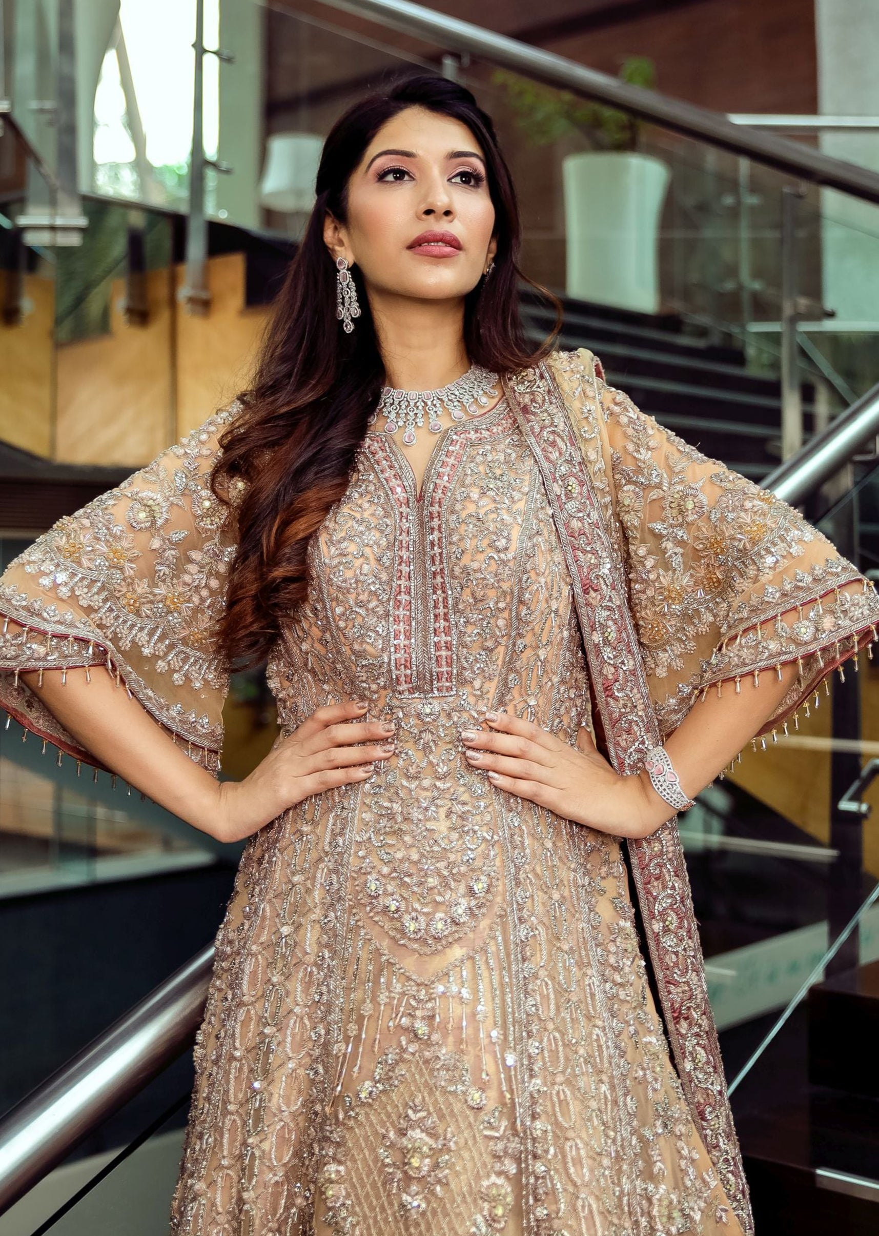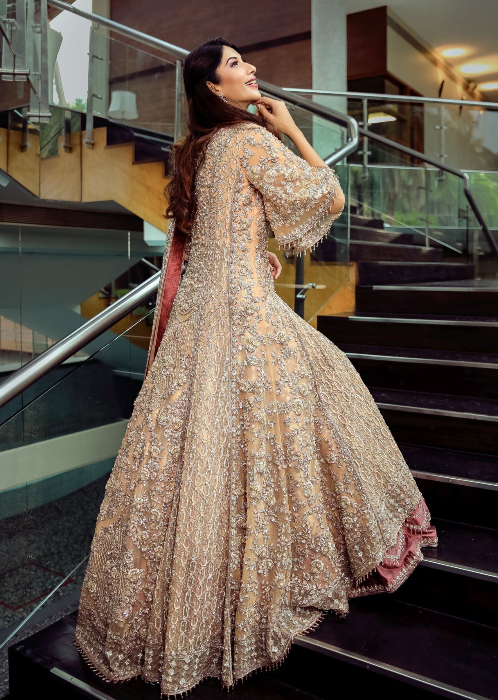 Sunset peach net trail anarkali and dupatta embroidered with floral jaal motifs in zardozi, crystals, sequins and beads; paired with a mauve pink silk brocade lehenga with a scallop border embroidered in zardozi and crystals.