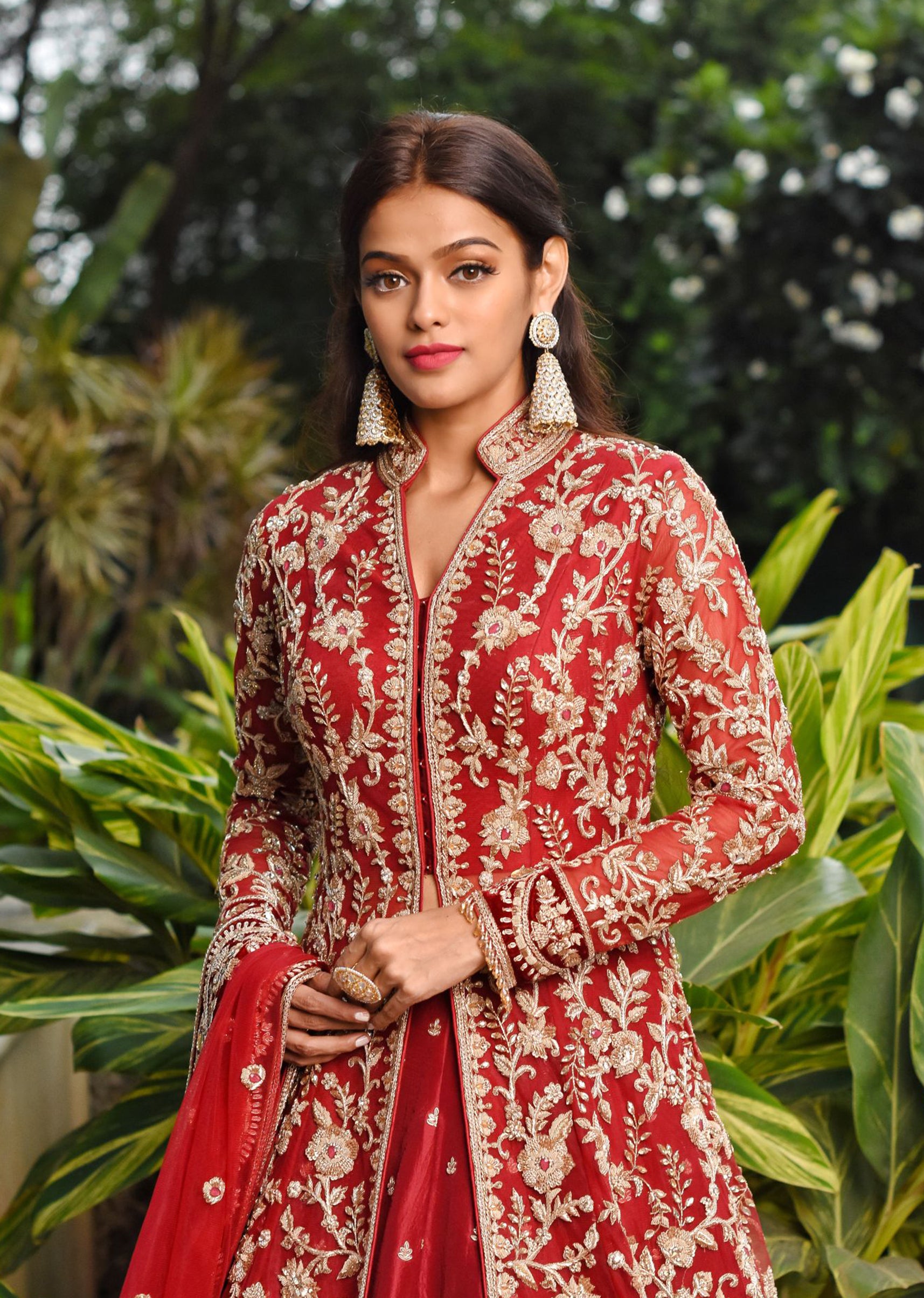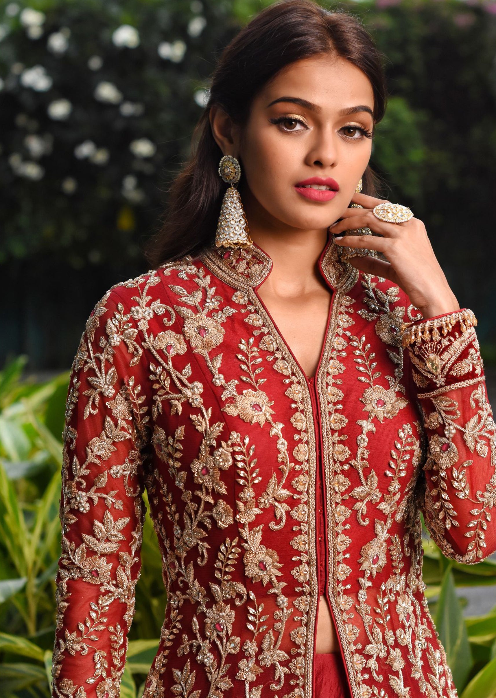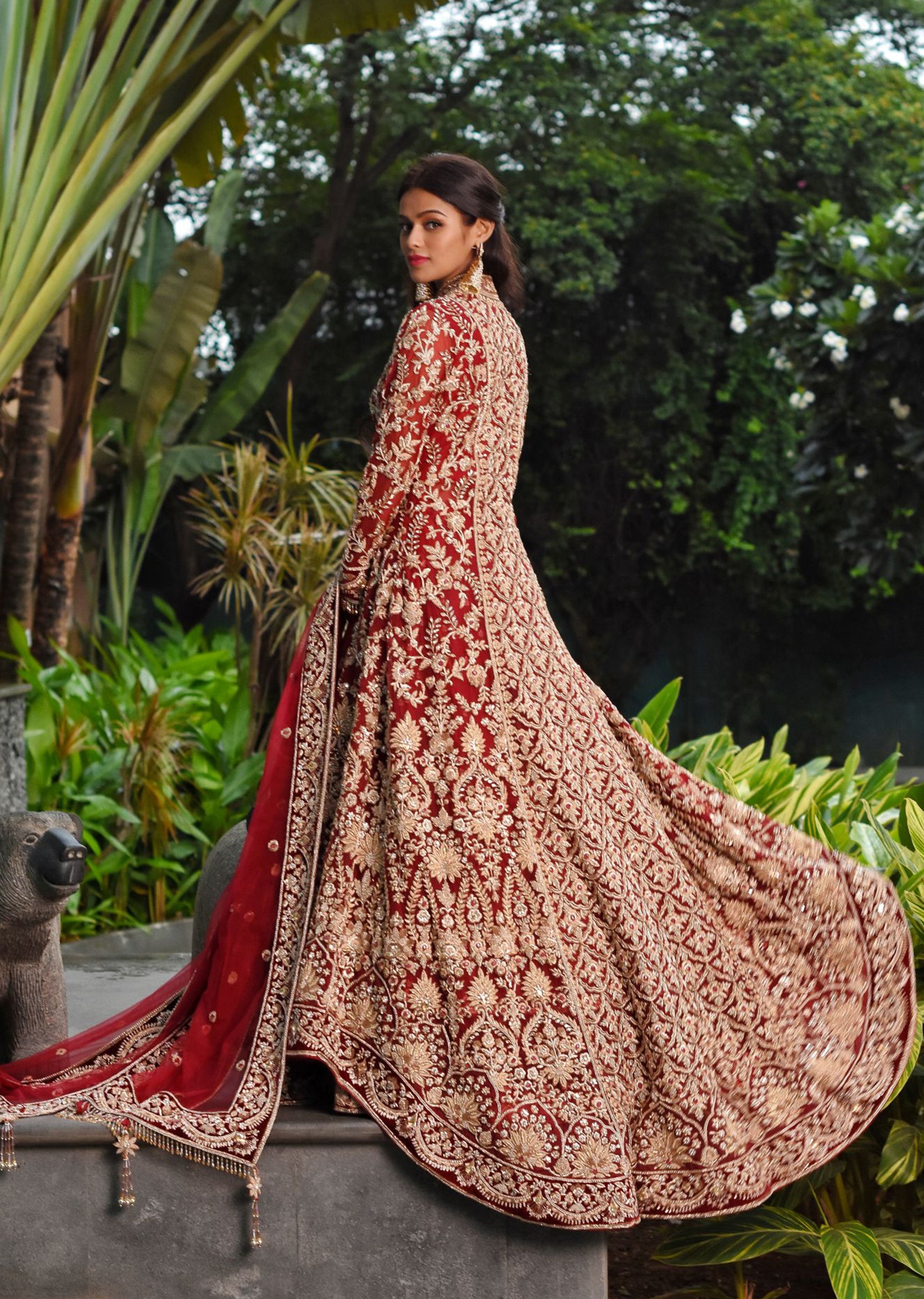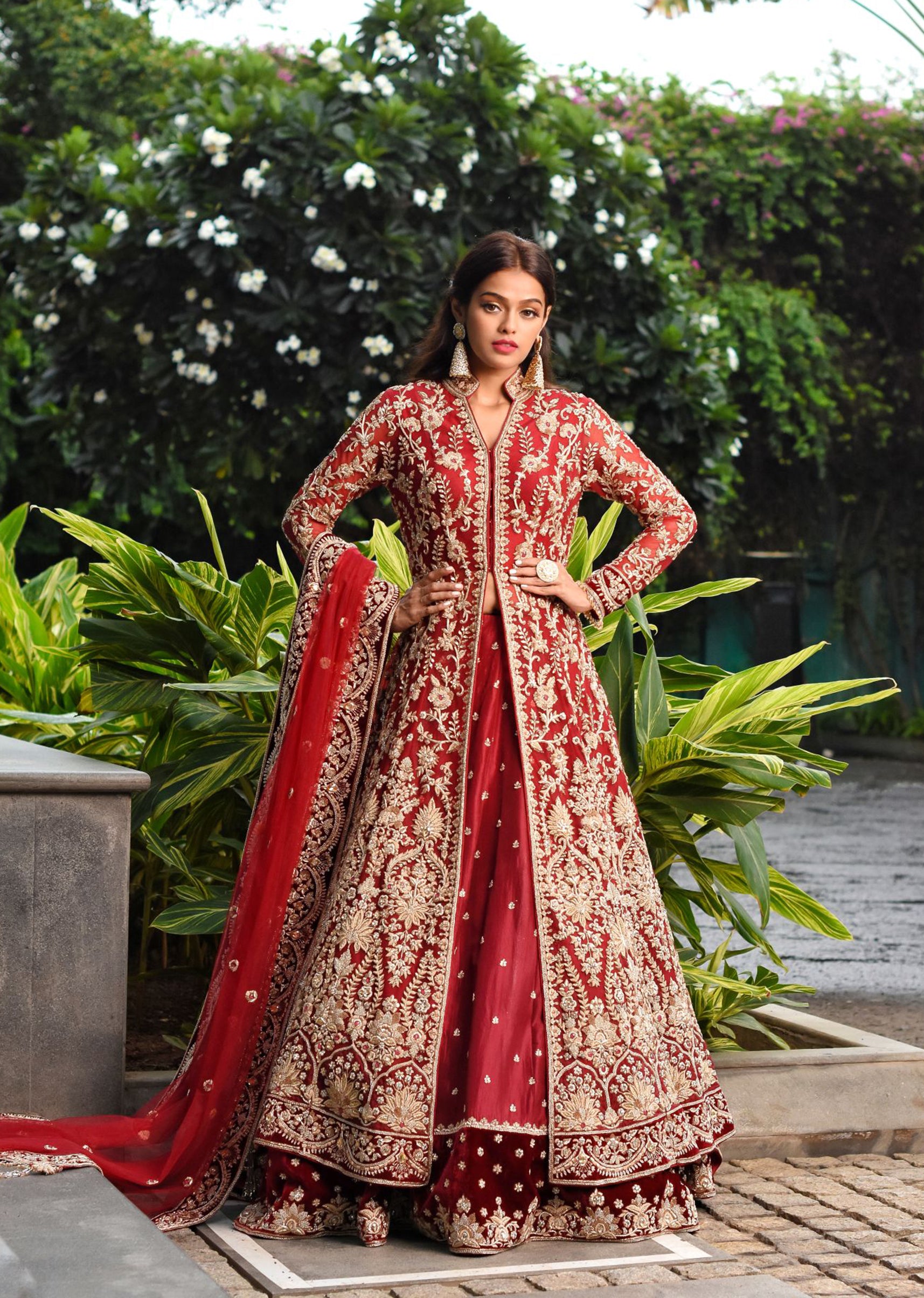 Maroon red net jacket style kurta and net dupatta embroidered in zardozi and crystals paired with a maroon silk lehenga highlighted with an embroidered velvet border and buttis.