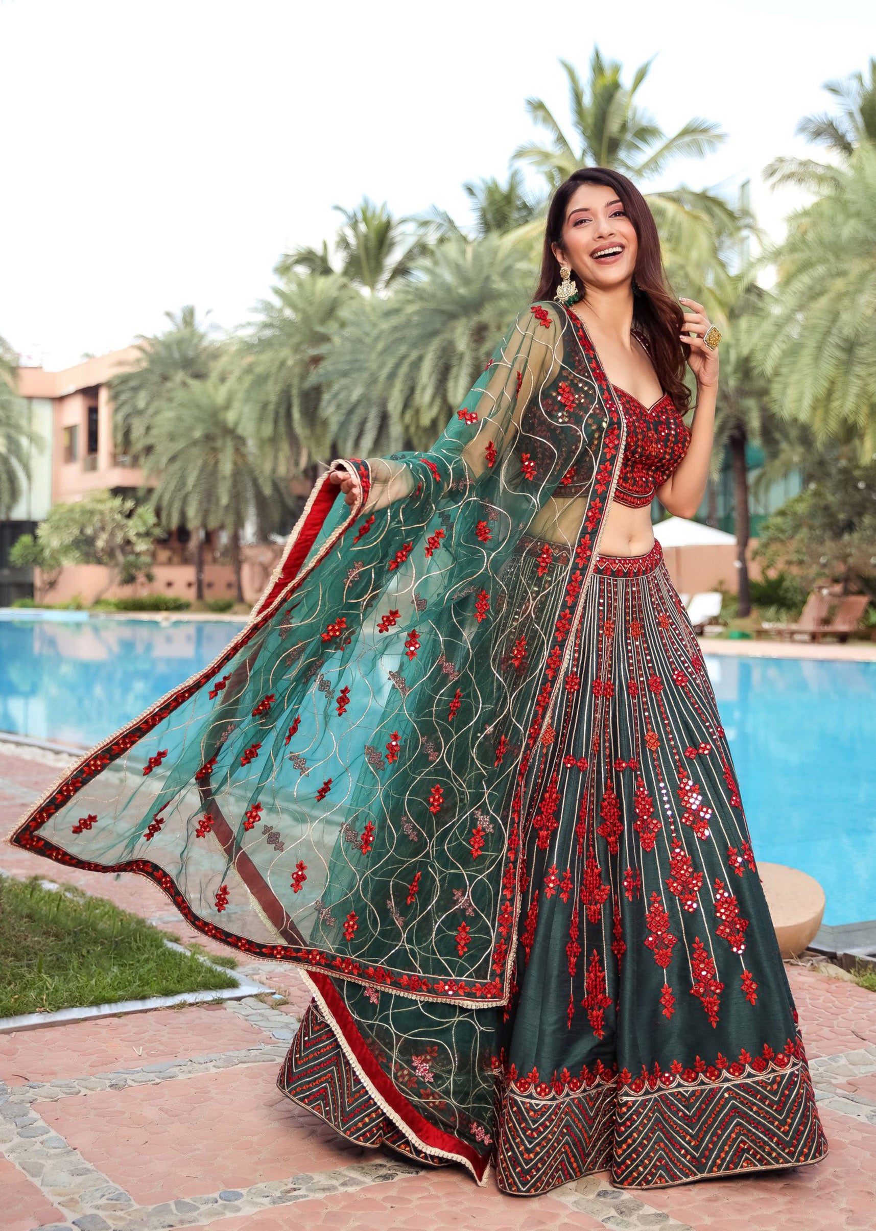 Deep forest green silk lehenga choli embroidered in maroon resham mirrorwork with a deep green net dupatta embroidered with gota ribbon and red resham mirrorwork.