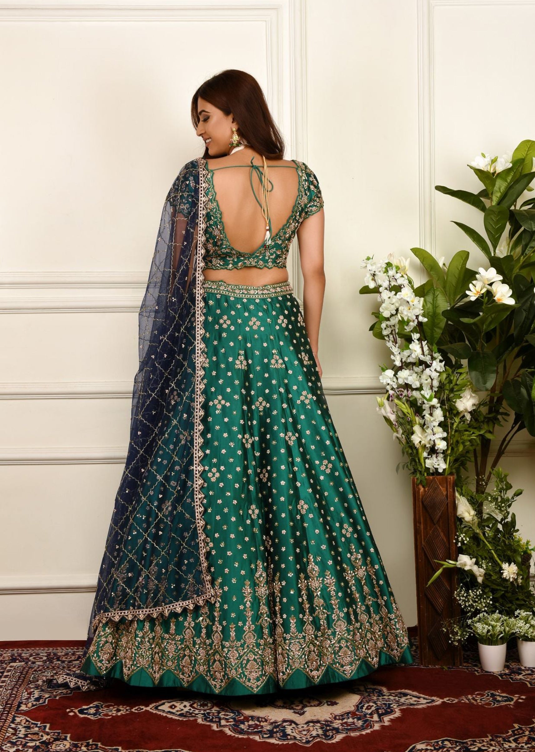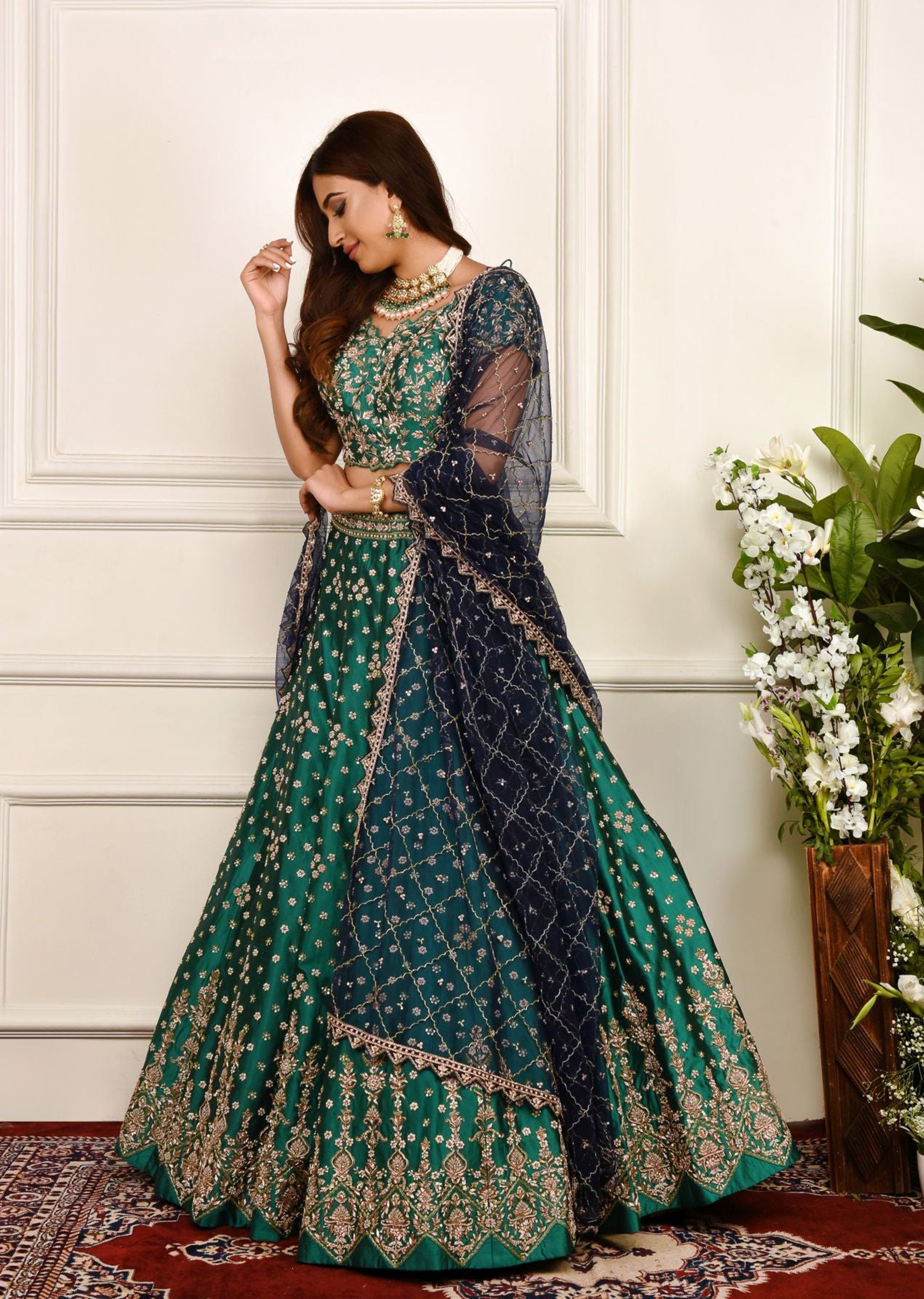 Deep green silk lehenga choli embroidered in floral zardozi with a navy blue net dupatta embroidered with lattice motifs in zardozi.
