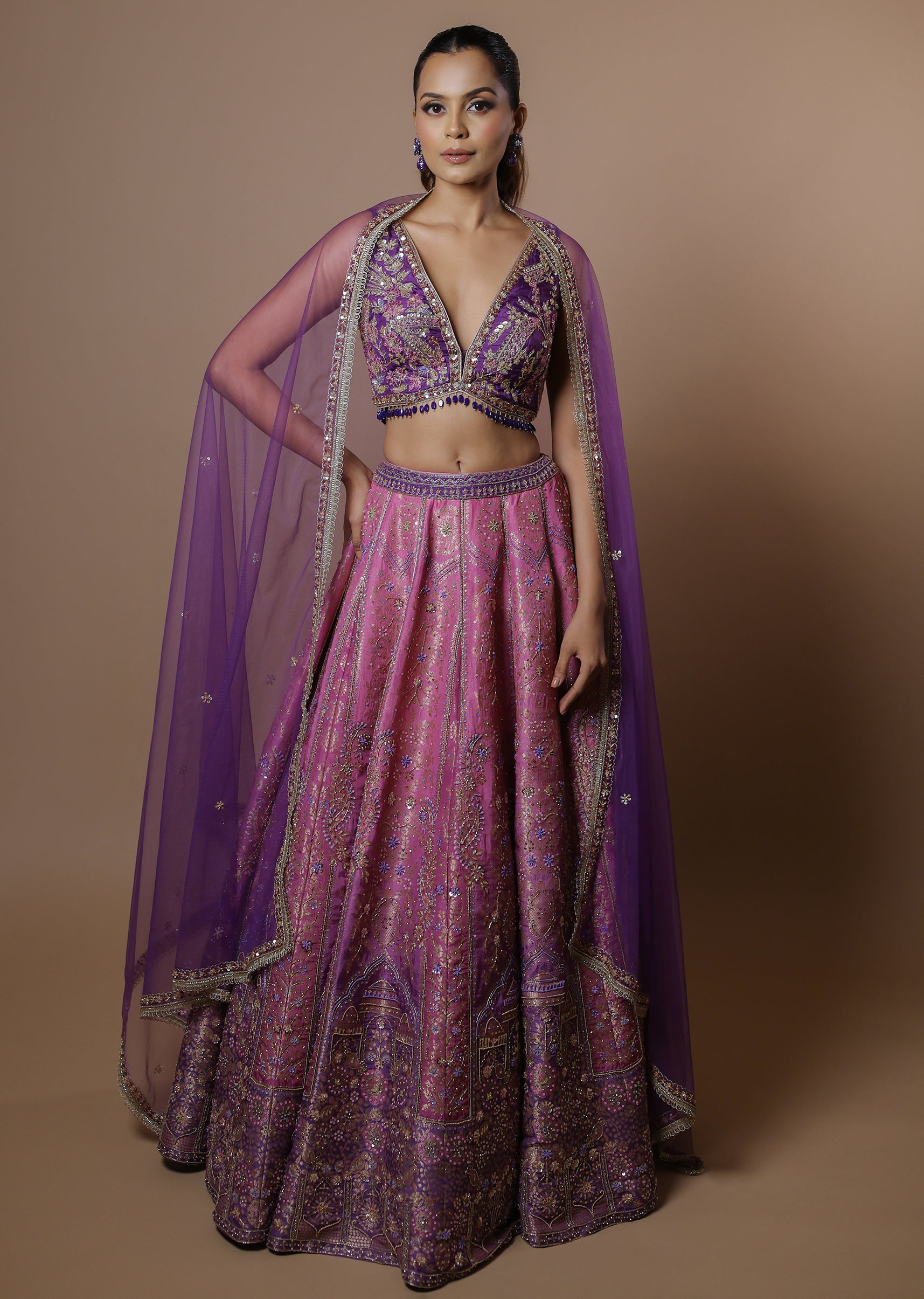 lavender-pink ombré lehenga featuring intricate zari, sequin, and bead embroidery paired with a hand-embroidered crystal blouse and matching net dupatta with border detailing
