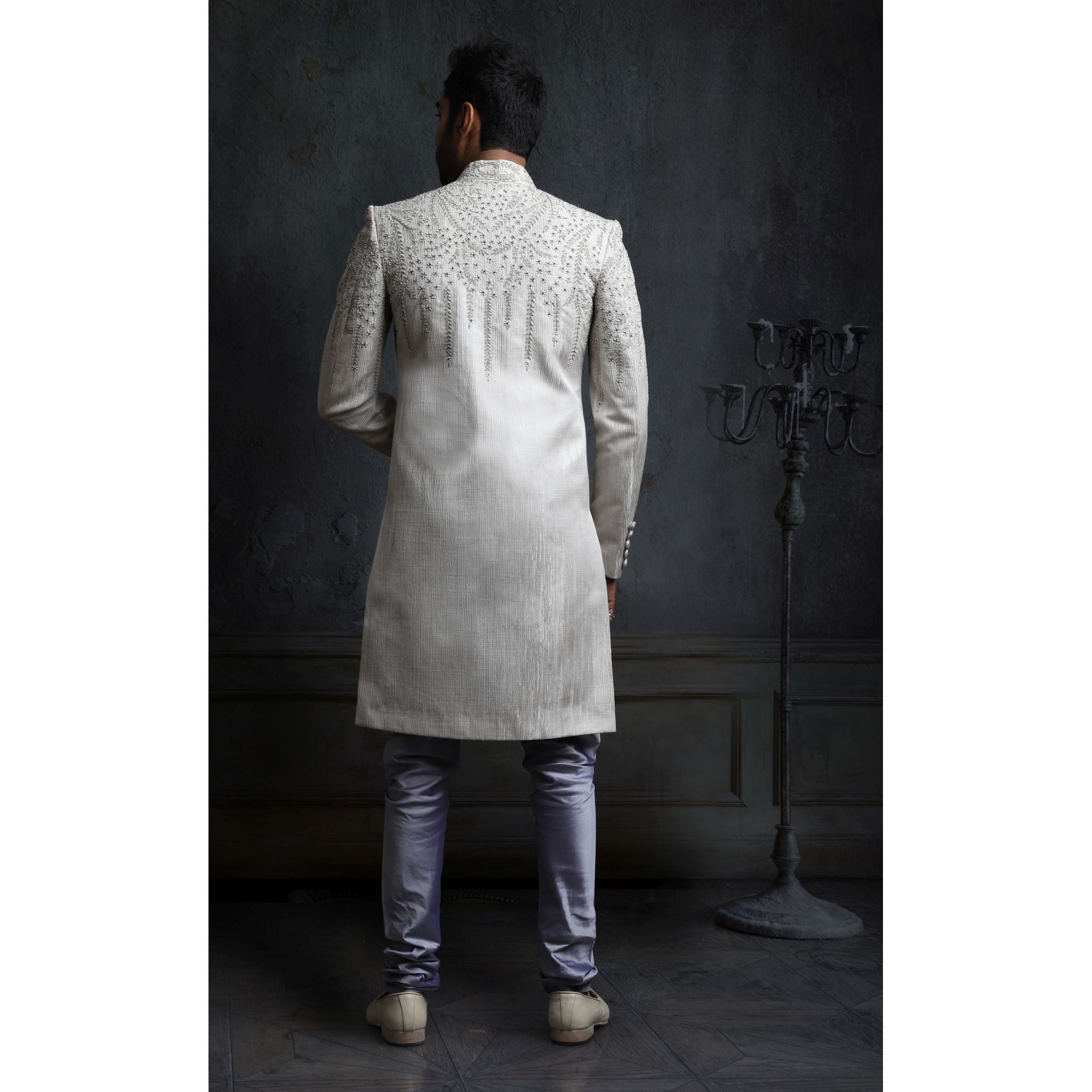 Ivory pleating textured silk sherwani with intricate asymmetrical floral embroidery in self resham and grey-silver zari highlights, paired with a grey-silver silk churidar.