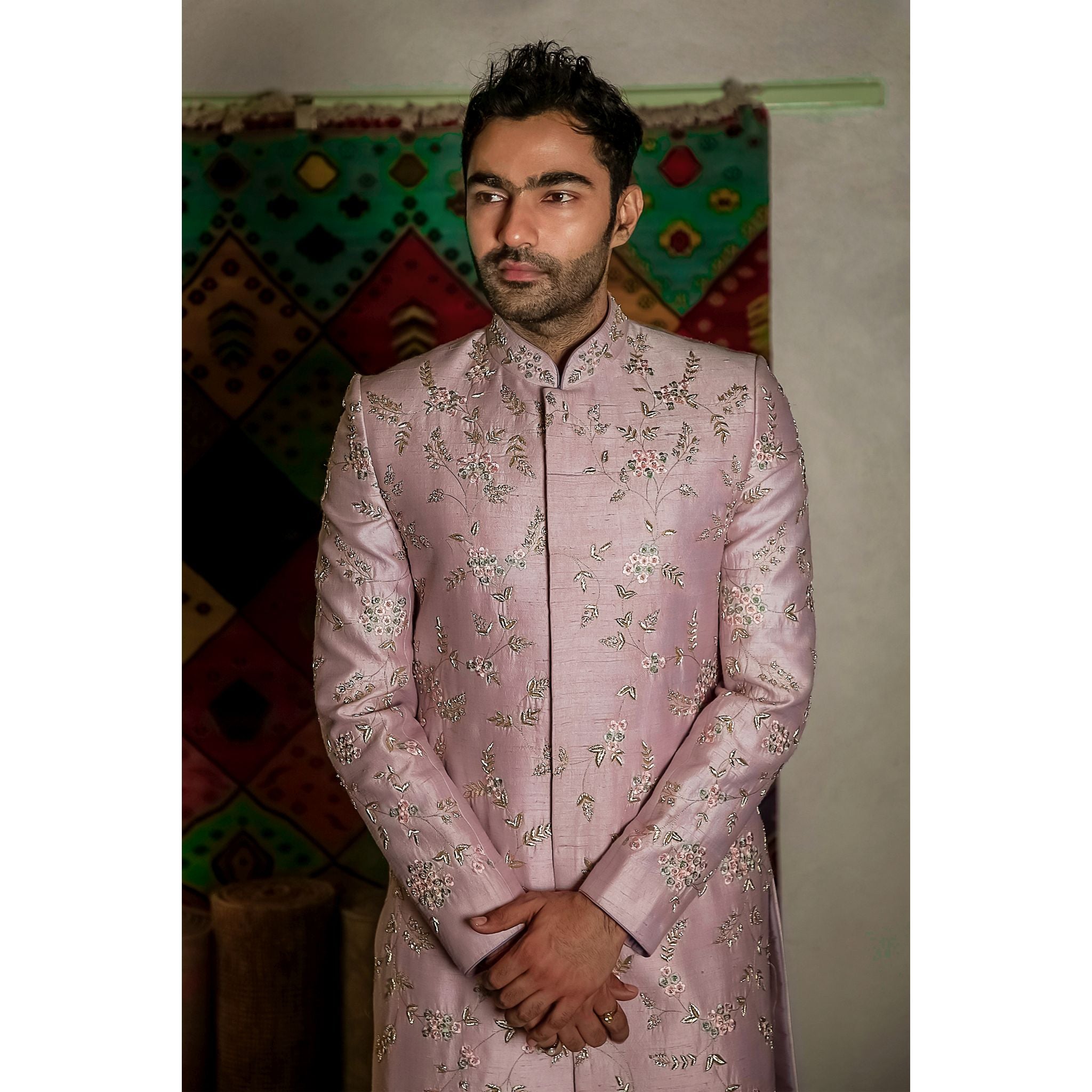 Lavender resham and zari embroidered raw silk sherwani with beige silk churidar
