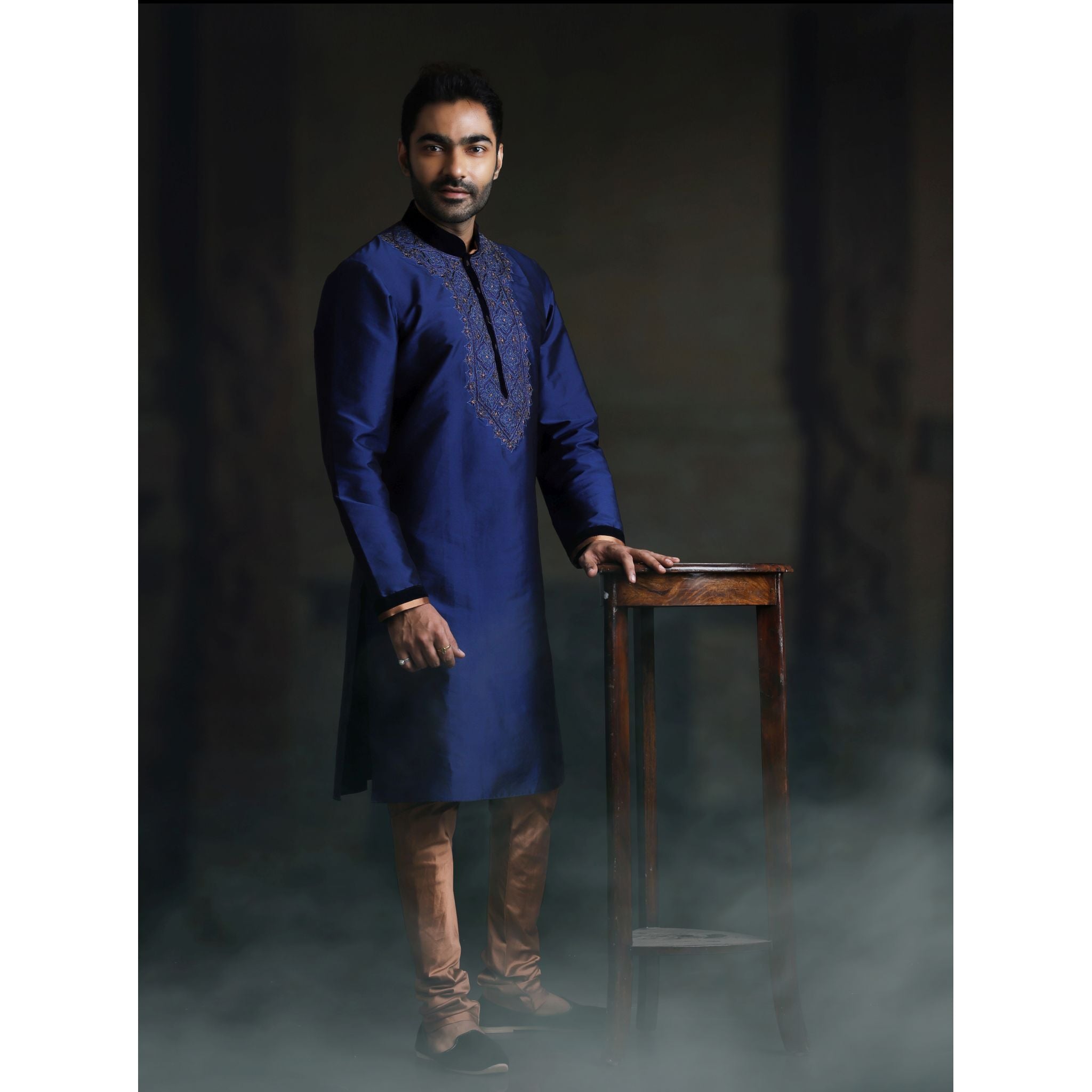 Deep ink blue silk kurta with resham embroidery at neckline and velvet detailing paired with a beige silk churidar.
