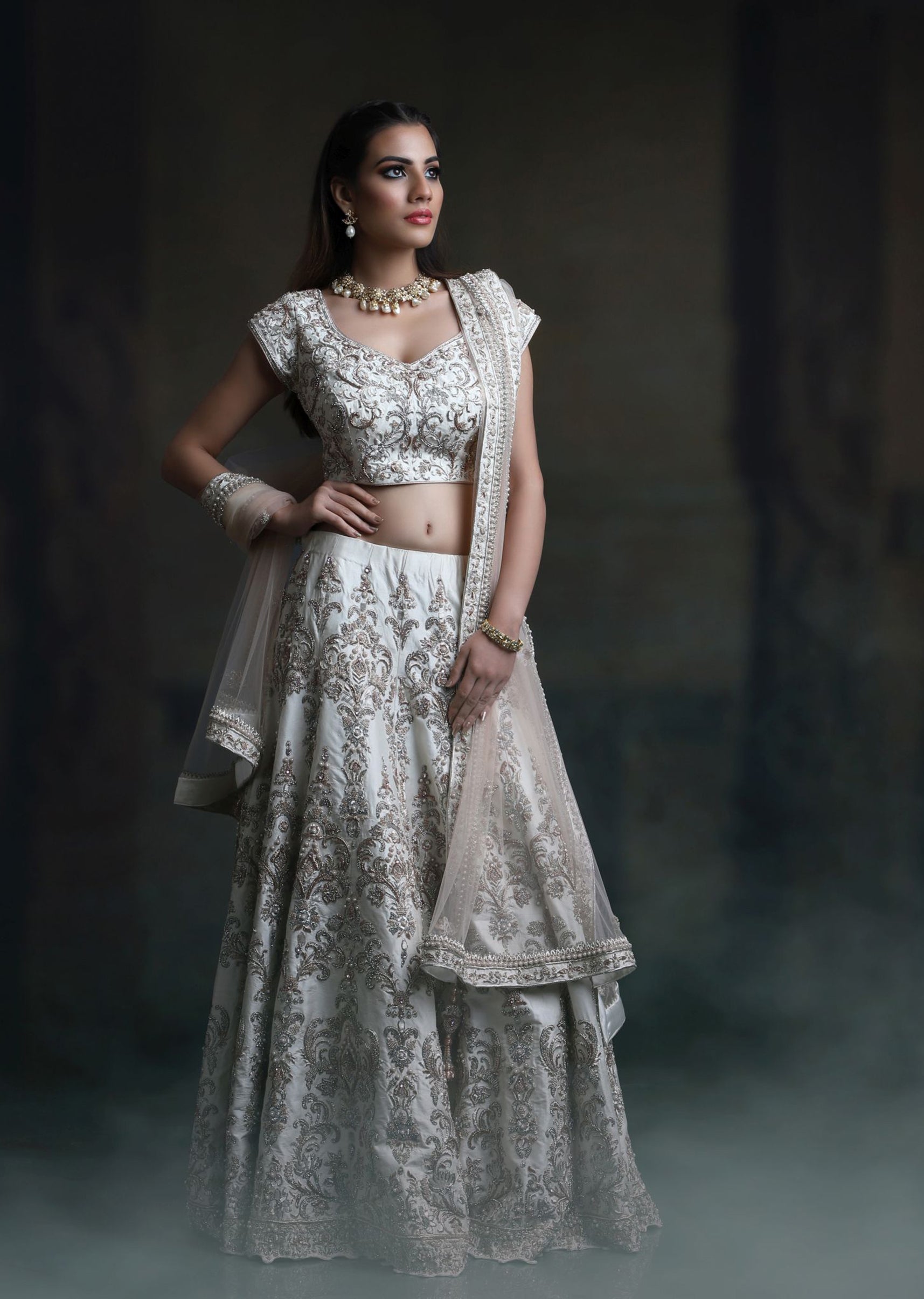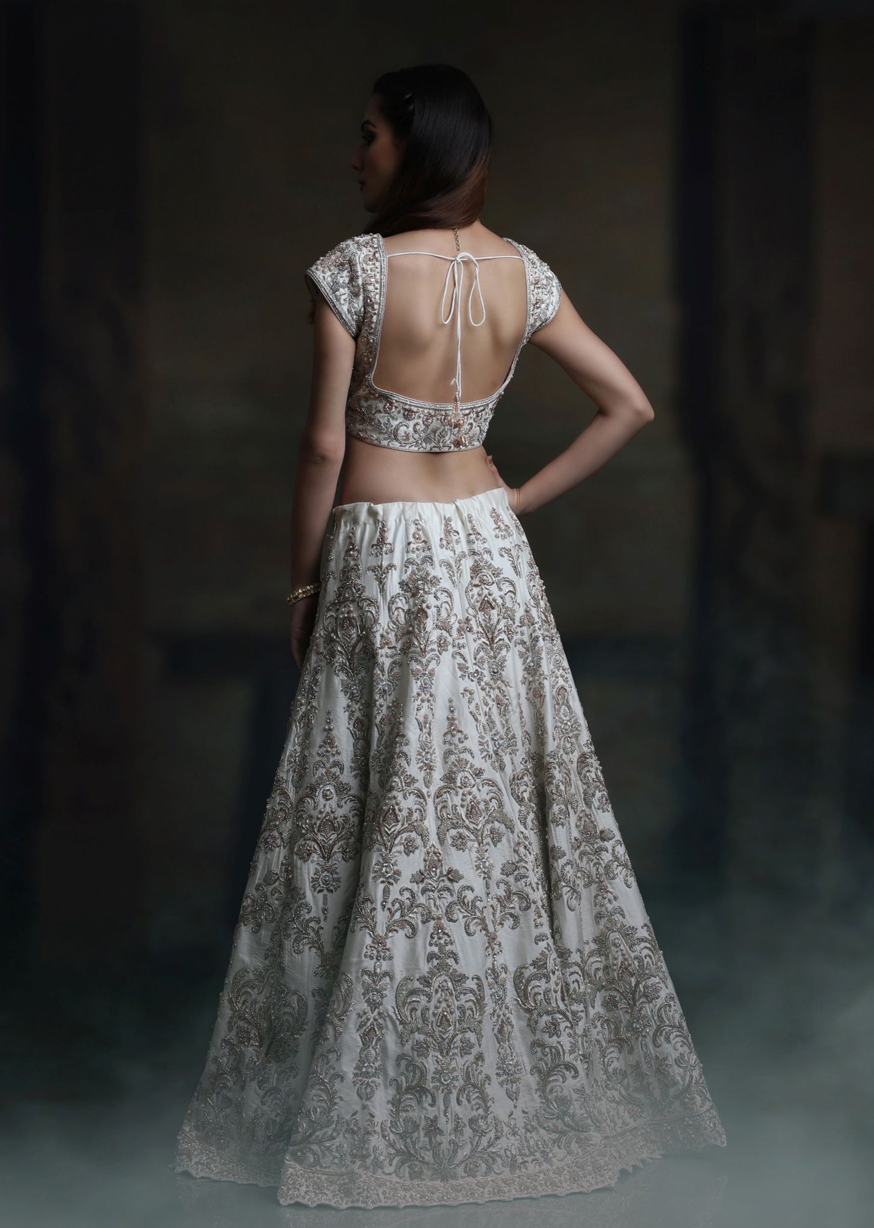 Ivory silk lehenga choli with antique art nouveau designed gold silver embroidery in zardozi, resham and pearls, paired with an ivory net dupatta.