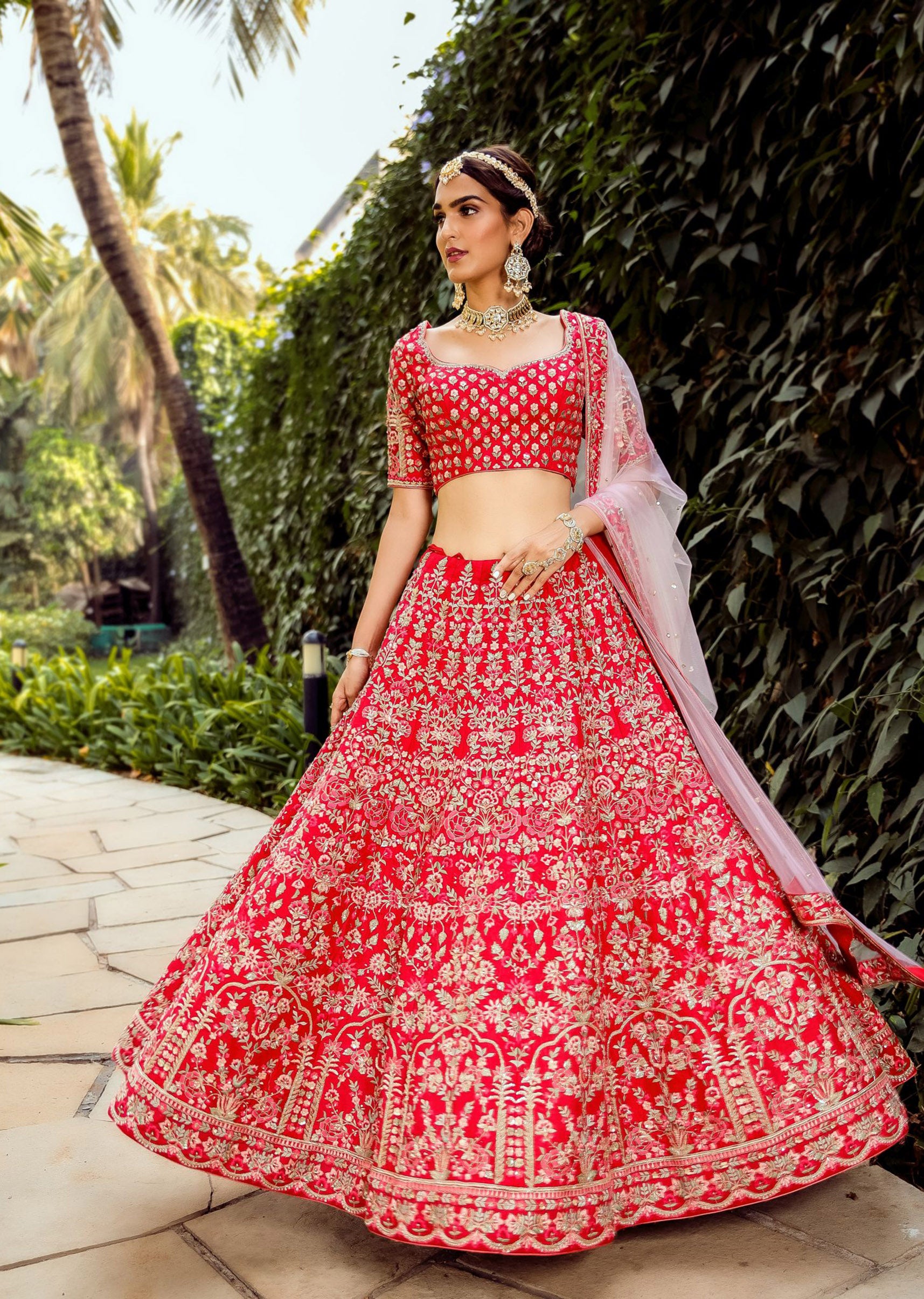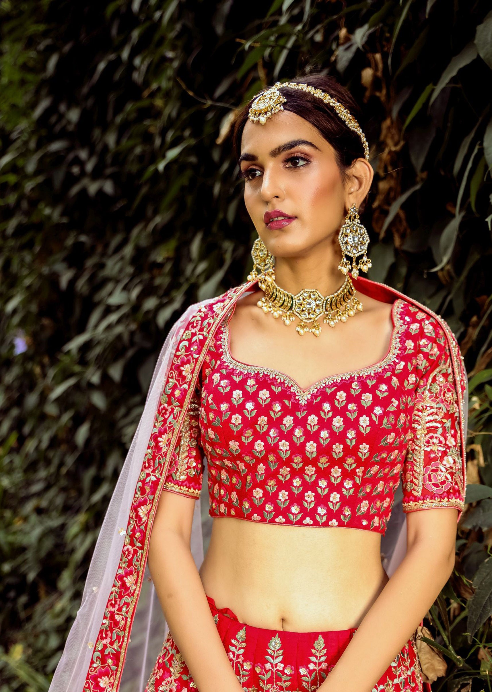 Scarlet red silk lehenga choli with archaic floral mughal jaal motifs embroidered in resham and sequins; paired with a blush pink net dupatta with embroidered borders and buttis.