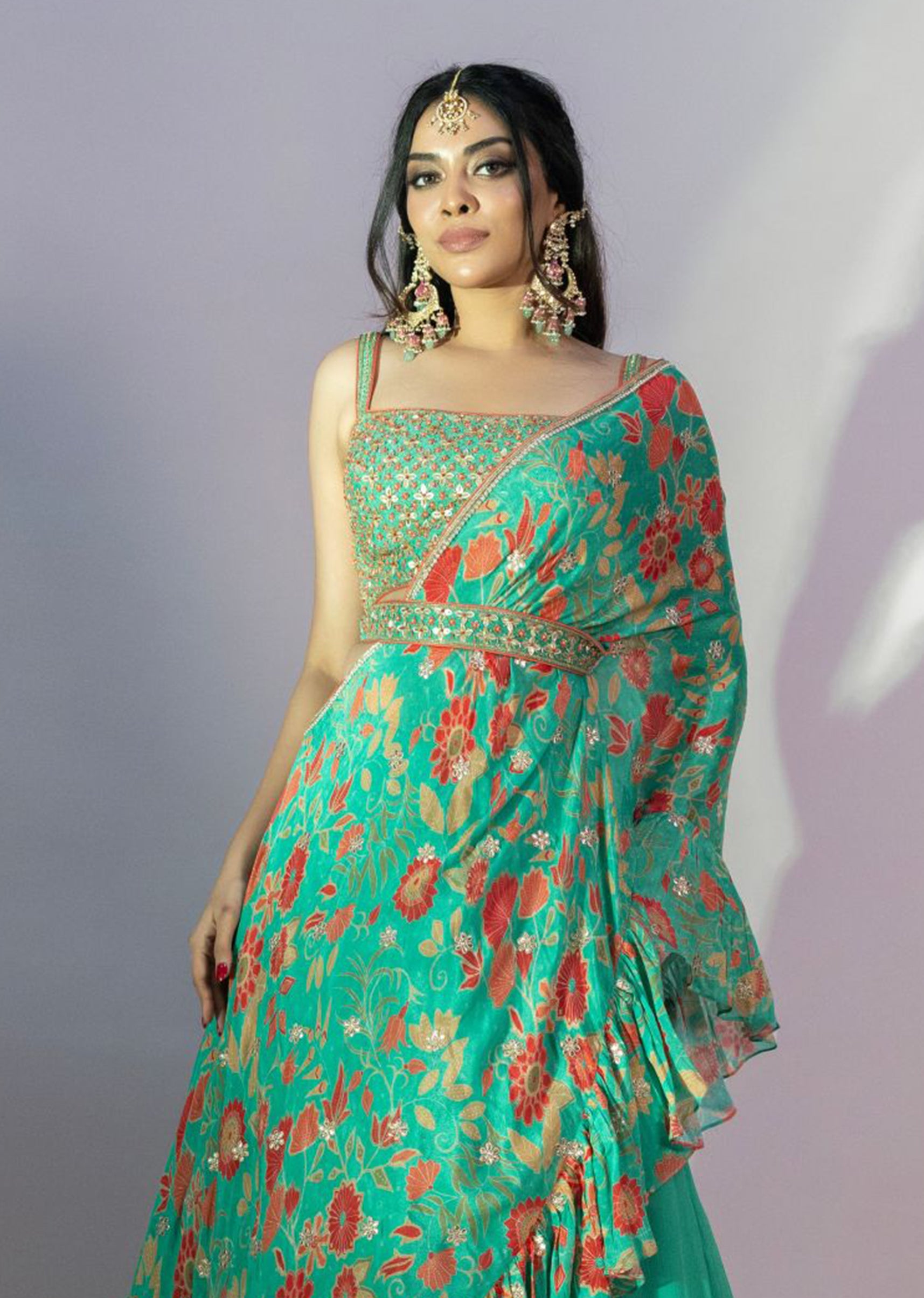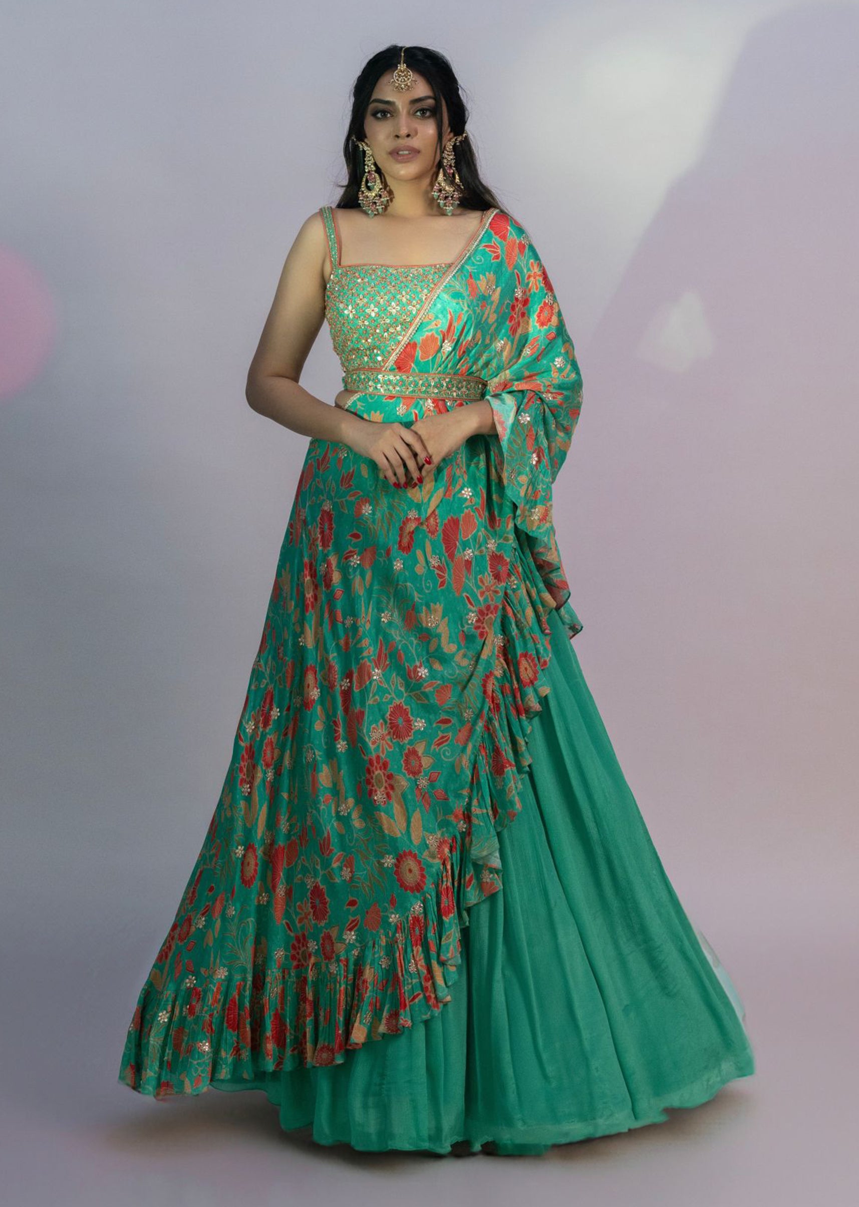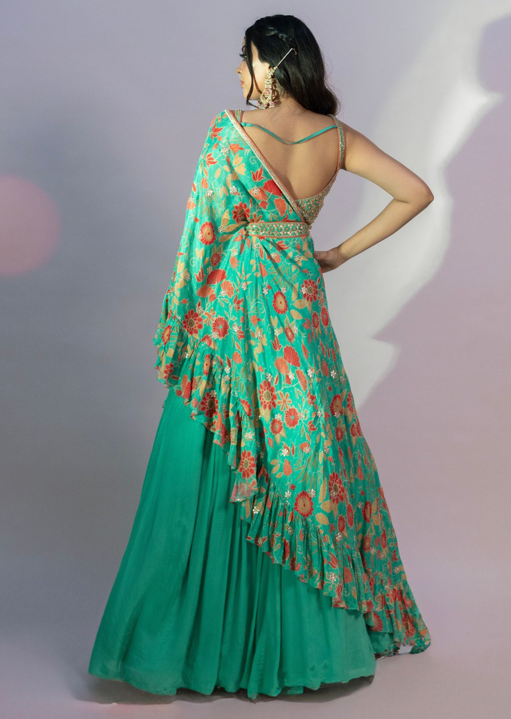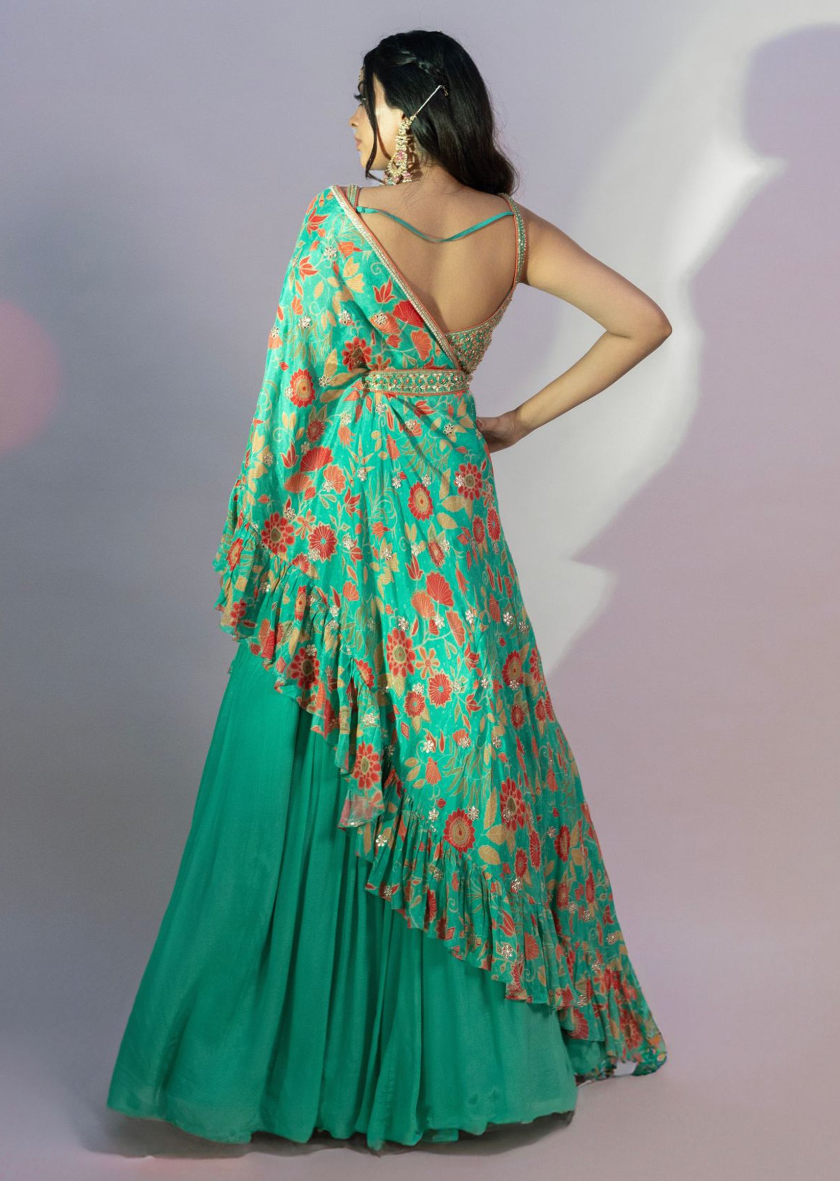 One Shoulder See Green Printed Drape With Embroidery Belt And Choli With Ruffle Skirt