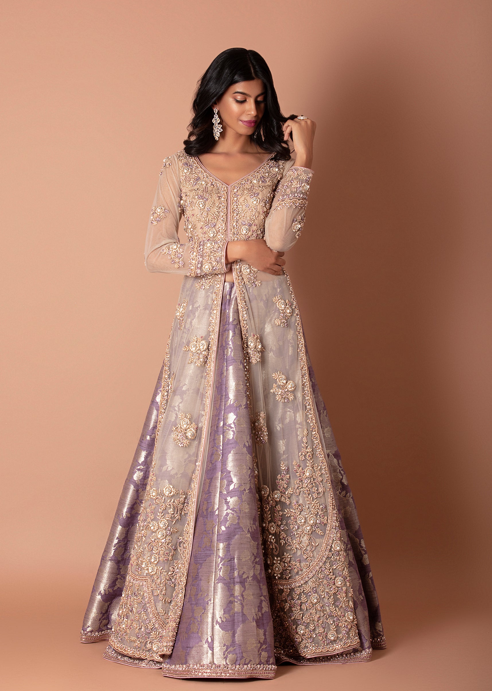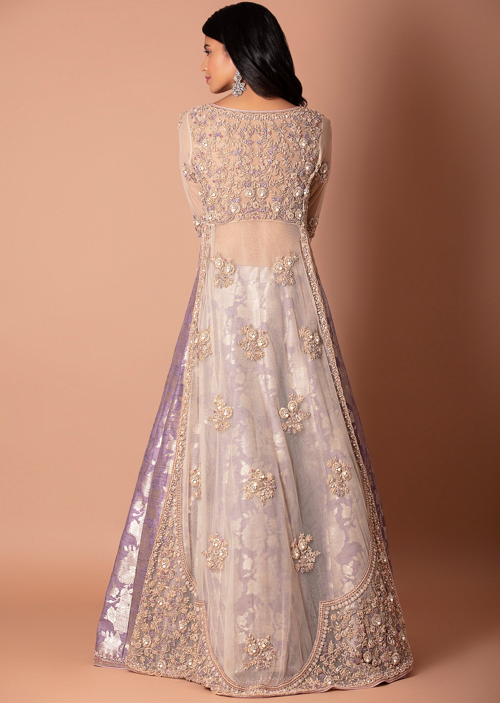 Blush net front open long kurta and blush sequinned net dupatta embroidered with floral bouquet buttis in self zardozi, beads and sequins; with a lilac silk brocade lehenga.