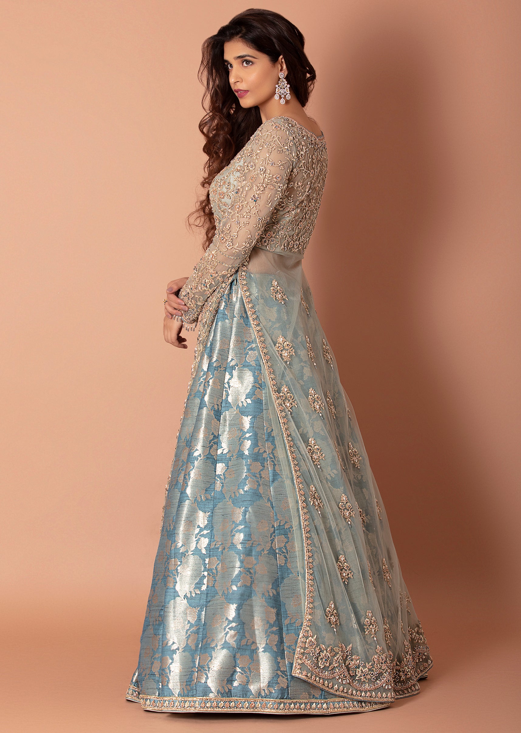 Pale blue net straight-cut kurta with scalloped neckline all-over embroidered in blush resham, self zardozi and crystals paired with a dusky blue silk brocade lehenga and blush pink net dupatta.