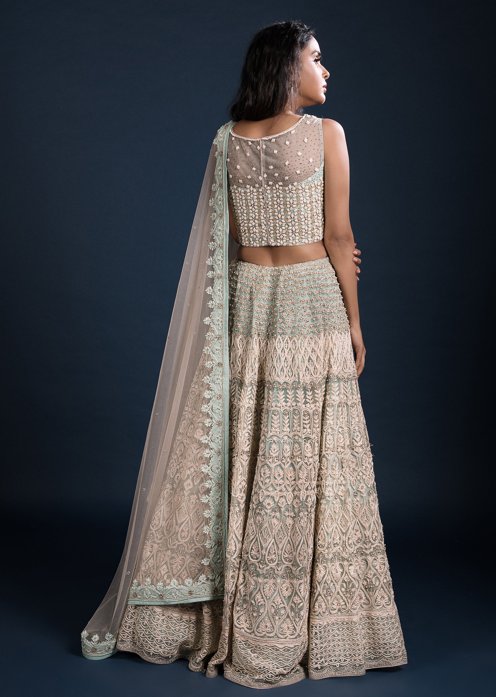 Pastel sky blue net lehenga choli with abstract geometric design in cream gold resham, sequins and beads emroidery; and a blush net bordered dupatta.