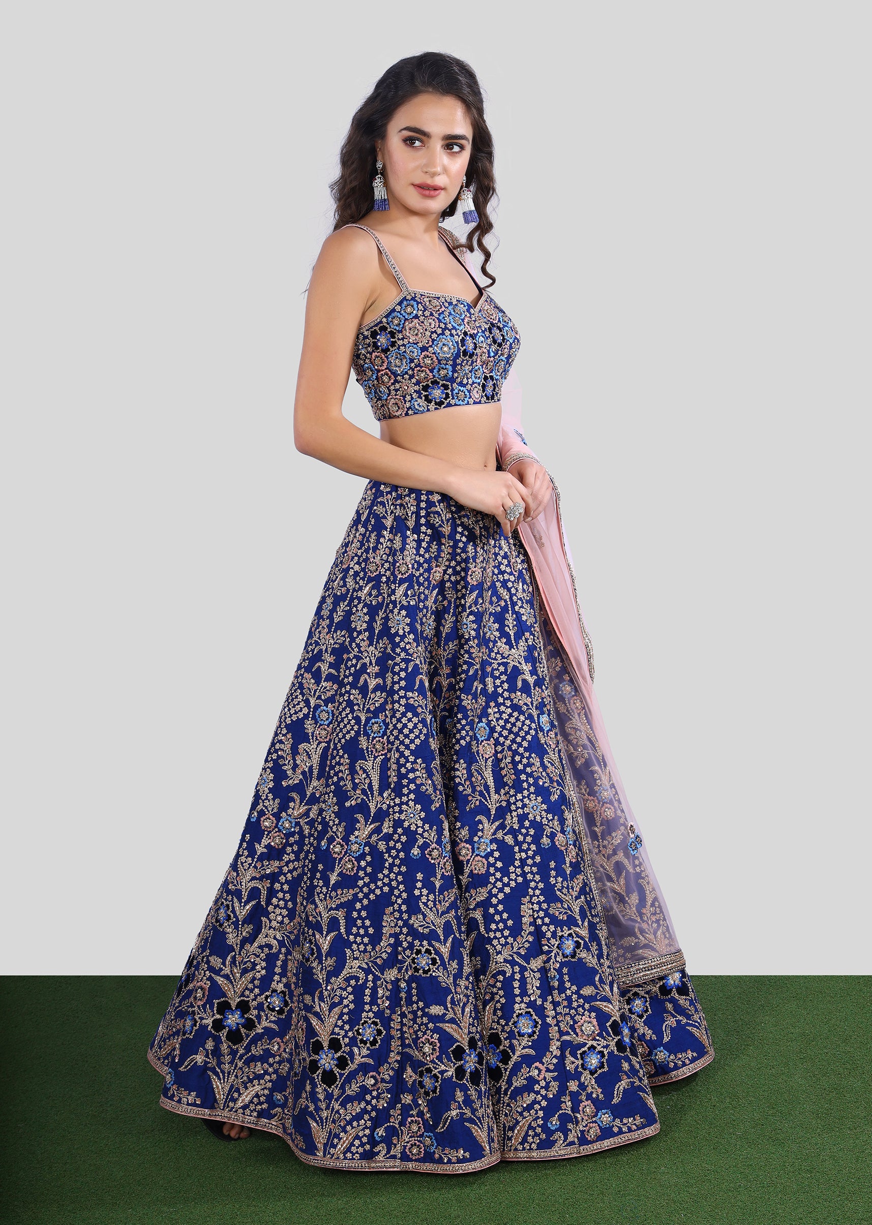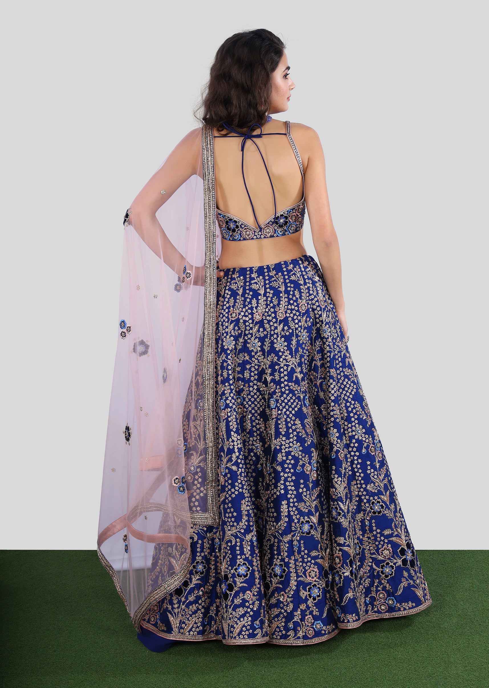 Royal blue raw silk lehenga and choli with blush pink net dupatta embroidered in jaal bageecha motifs in zari, resham and sequins.