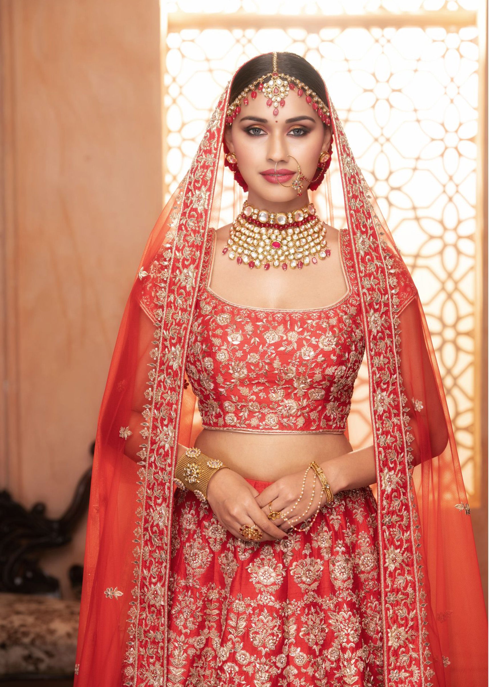 Deep red raw silk lehenga choli with honeycomb mughal motifs embroidered in zardozi and crystals paired with a red net embroidered dupatta.