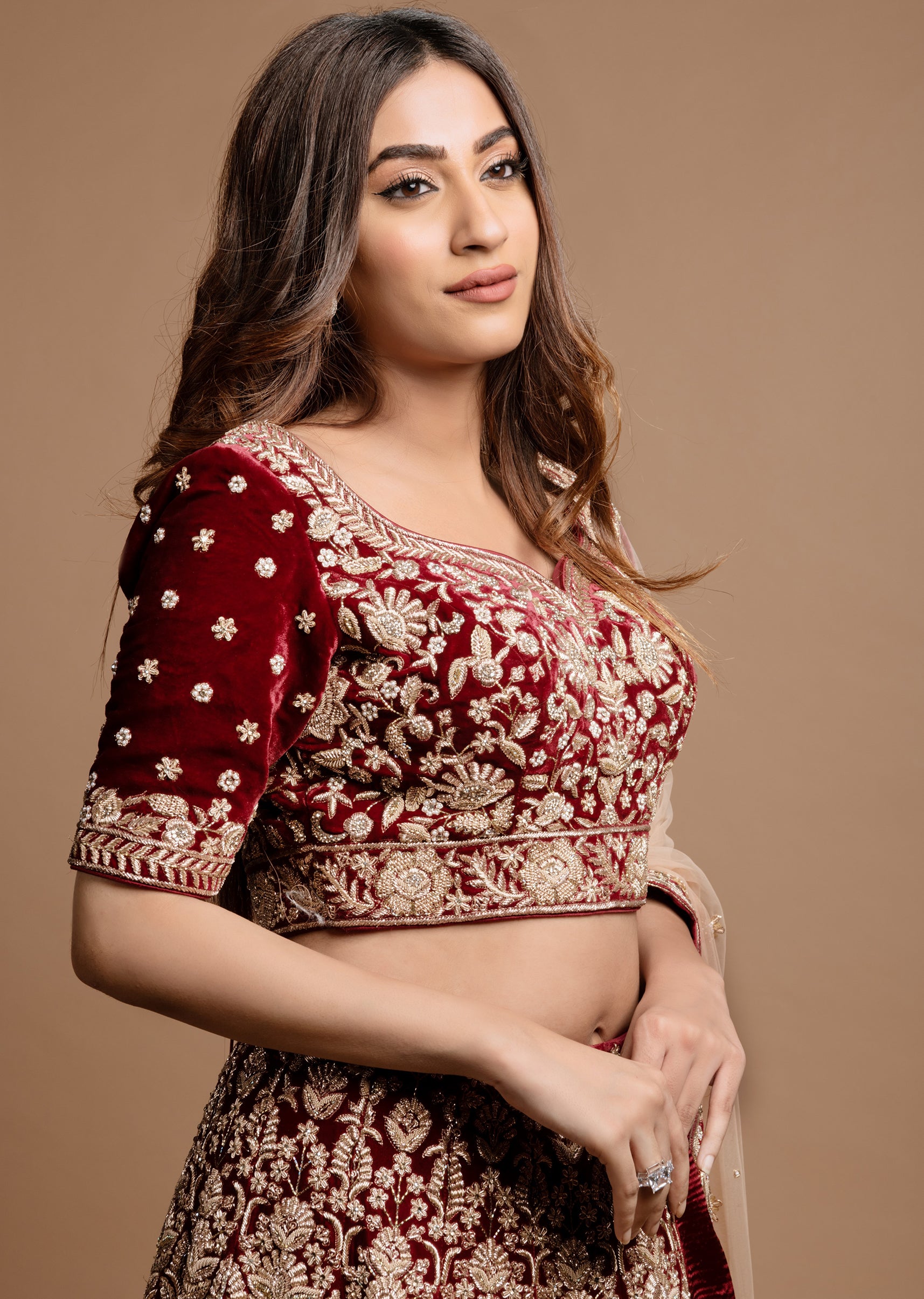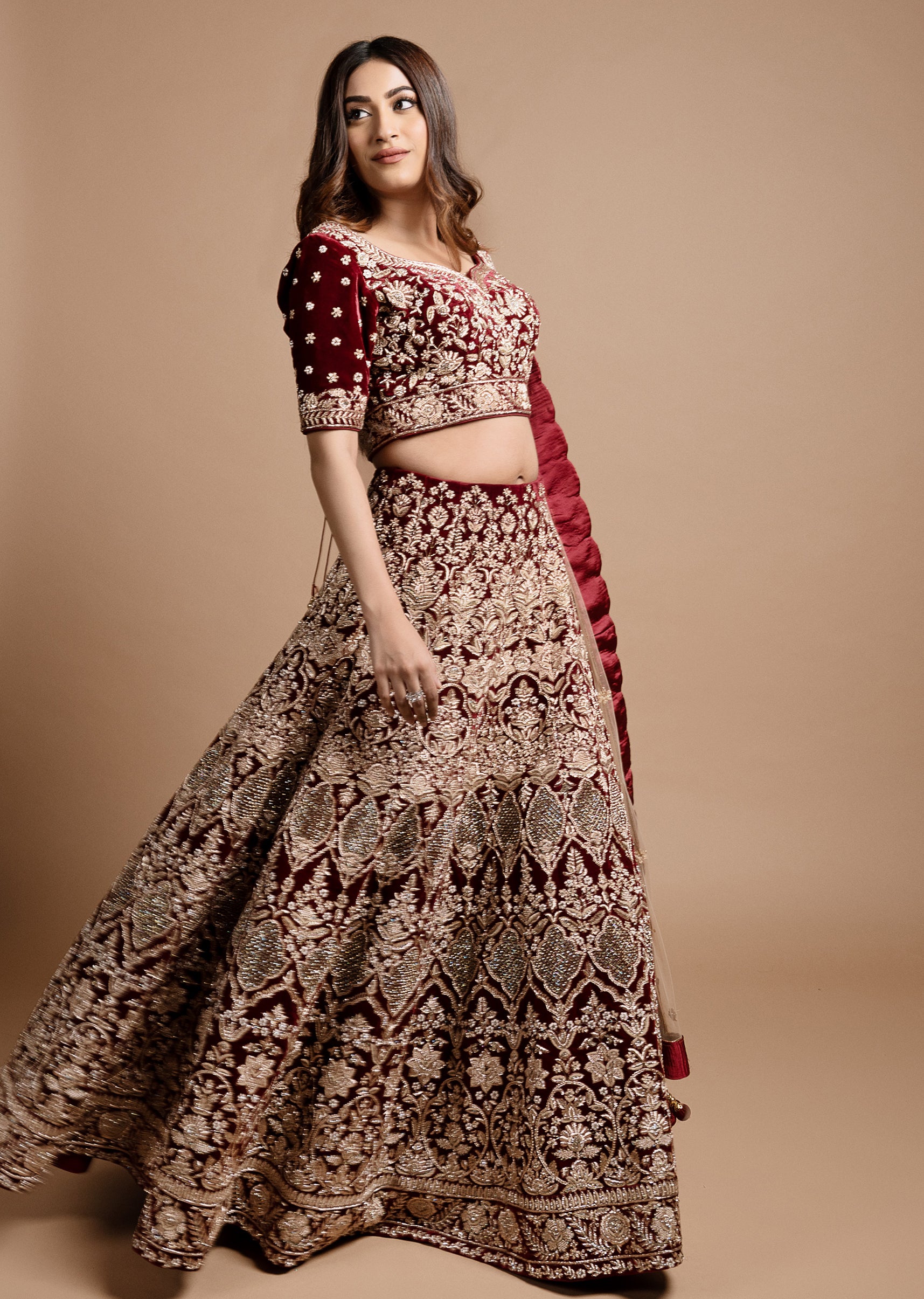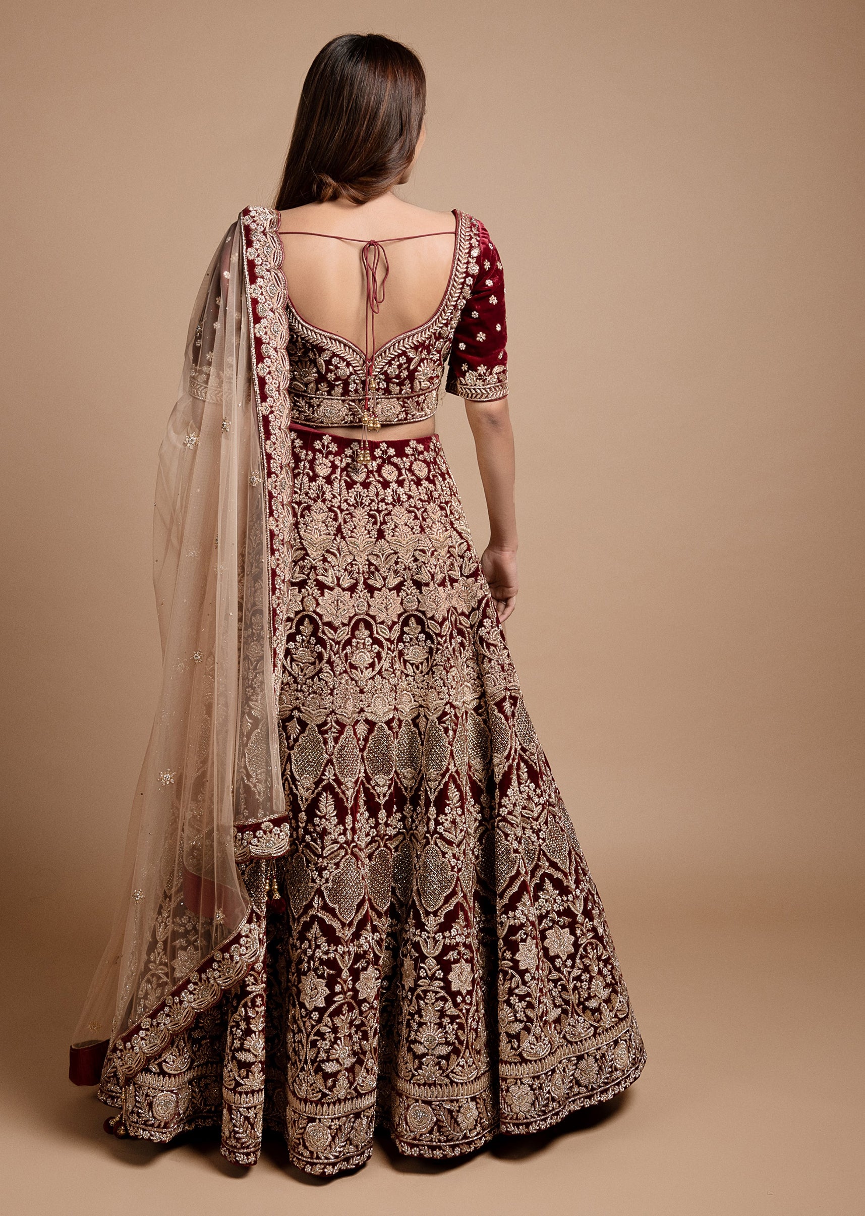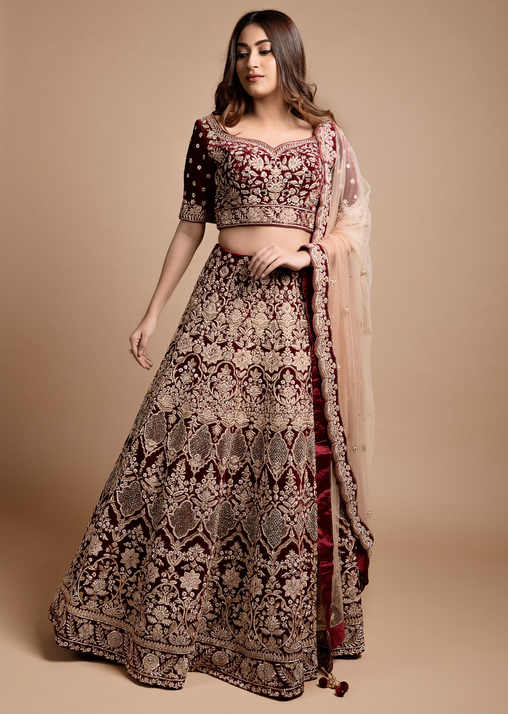 Maroon velvet lehenga choli with persian carpet inspired archaic motifs embroidered in intricate gold zardozi; paired with a blush peach net dupatta with an embroidered velvet scallop border and zardozi buttis.