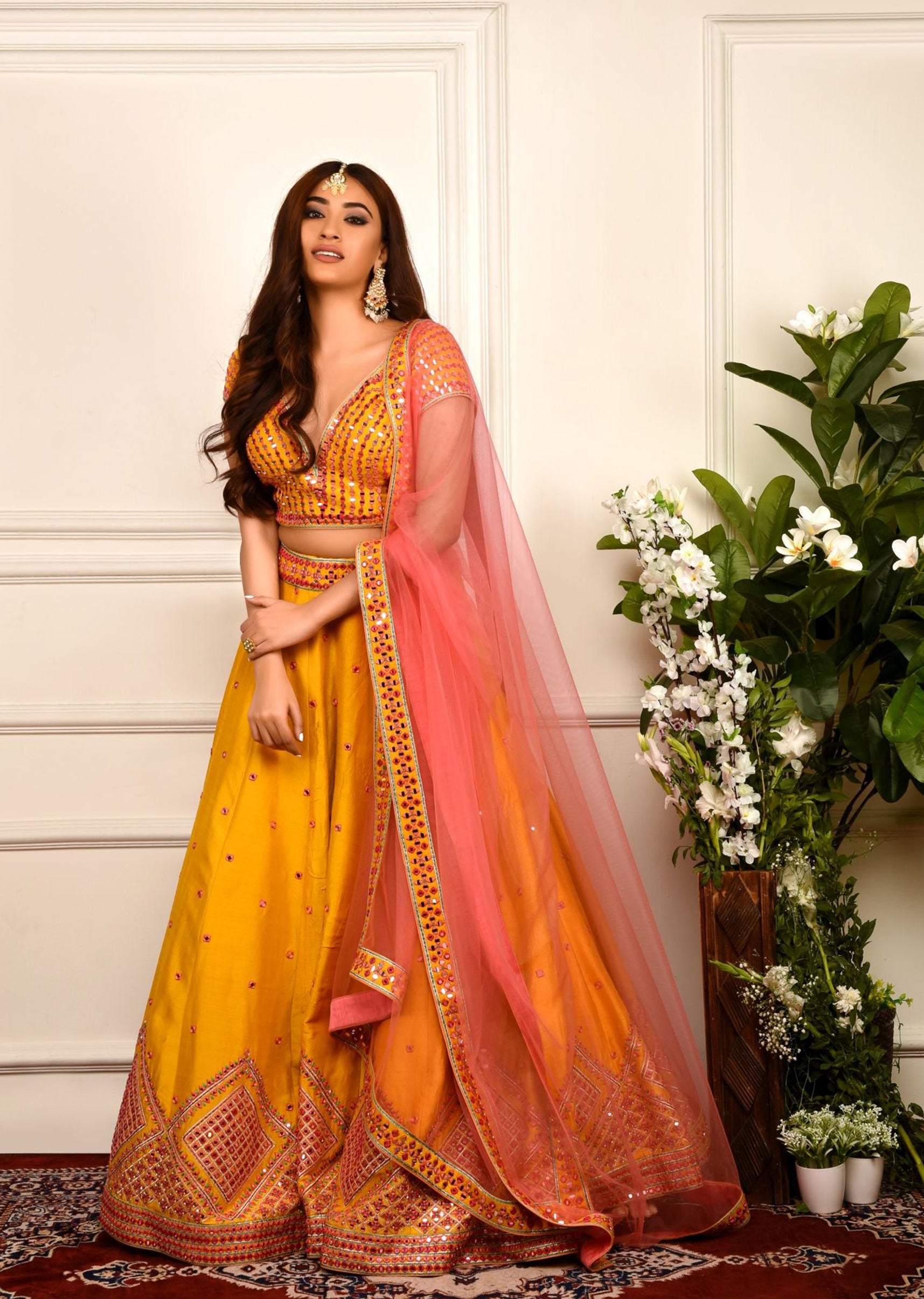 Mustard yellow silk lehenga choli with coral pink resham mirrorwork embroidery in abstract geometric motifs paired with a coral pink net dupatta.
