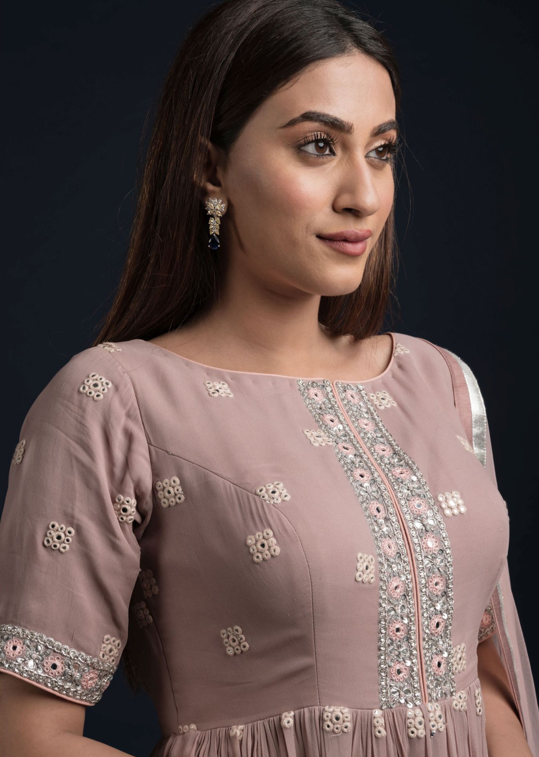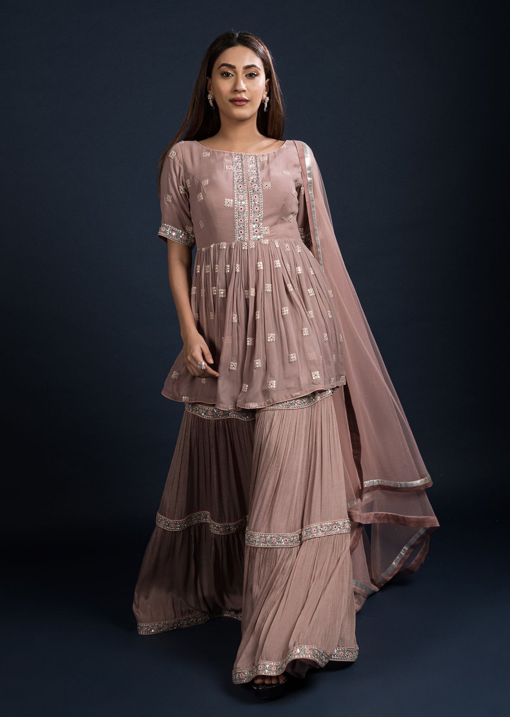 Mauve georgette peplum kurta and chiffon sharara embroidered with blush pink resham and mirrorwork; paired with a blush pink net dupatta.