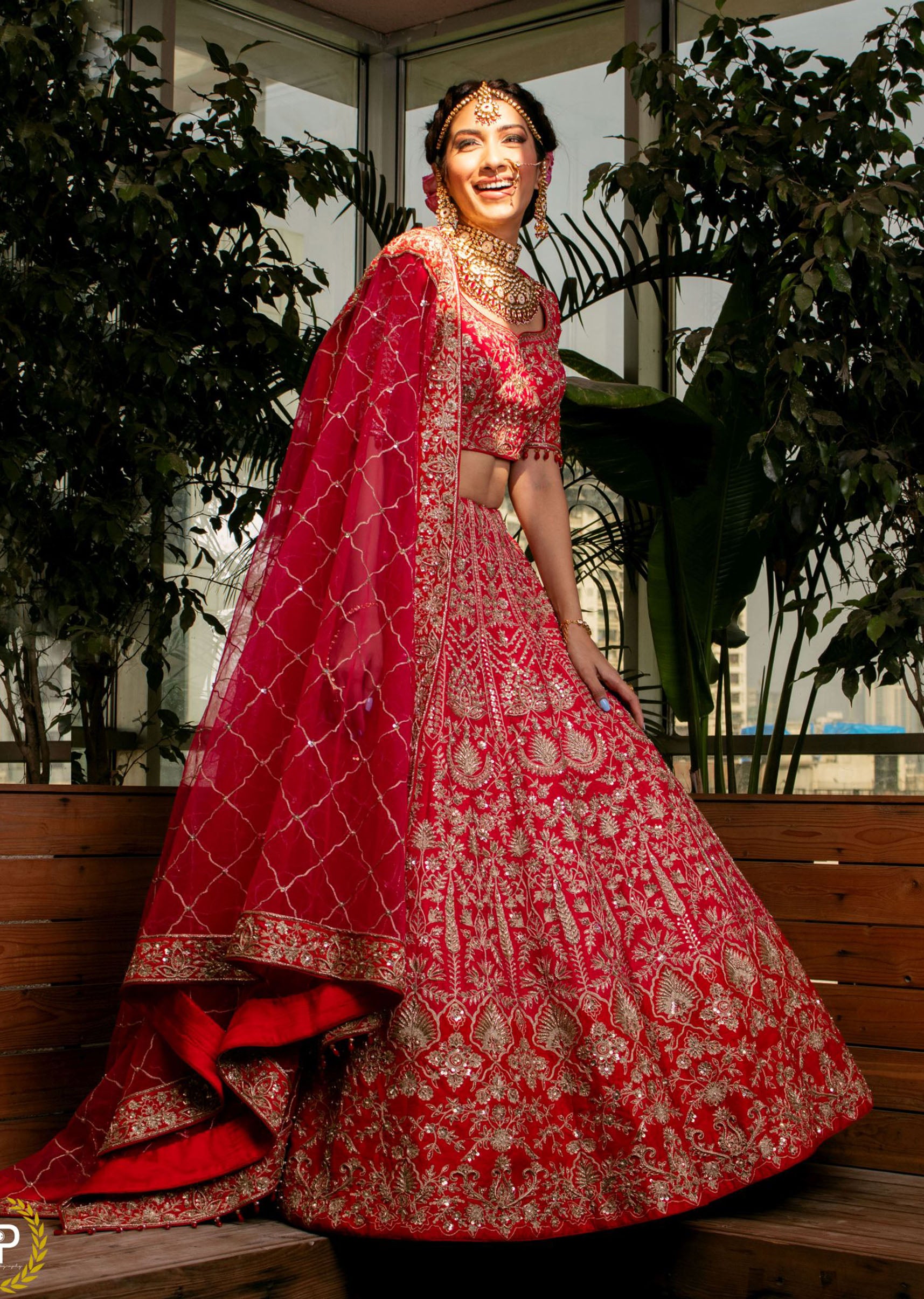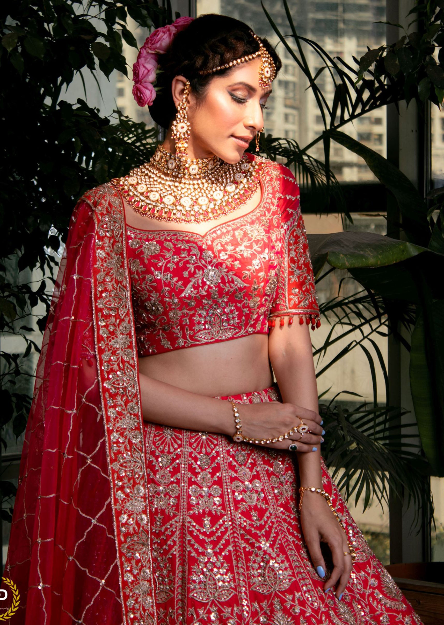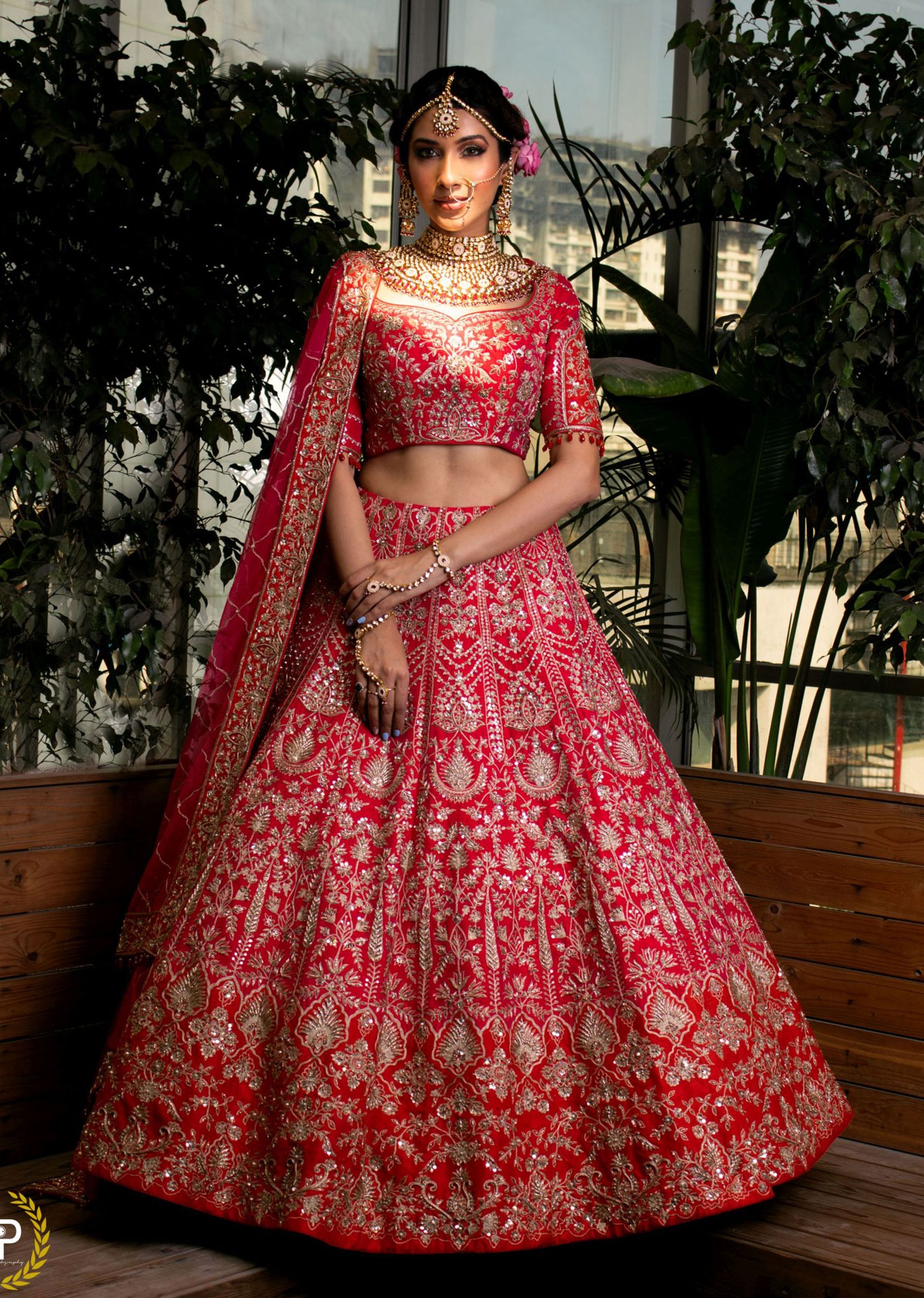 Cerise pink and crimson red silk lehenga choli embroidered with abstract floral motifs in sequins, pearls, dori and zardozi; paired with a pink net dupatta embroidered in dori, pearls and zardozi.