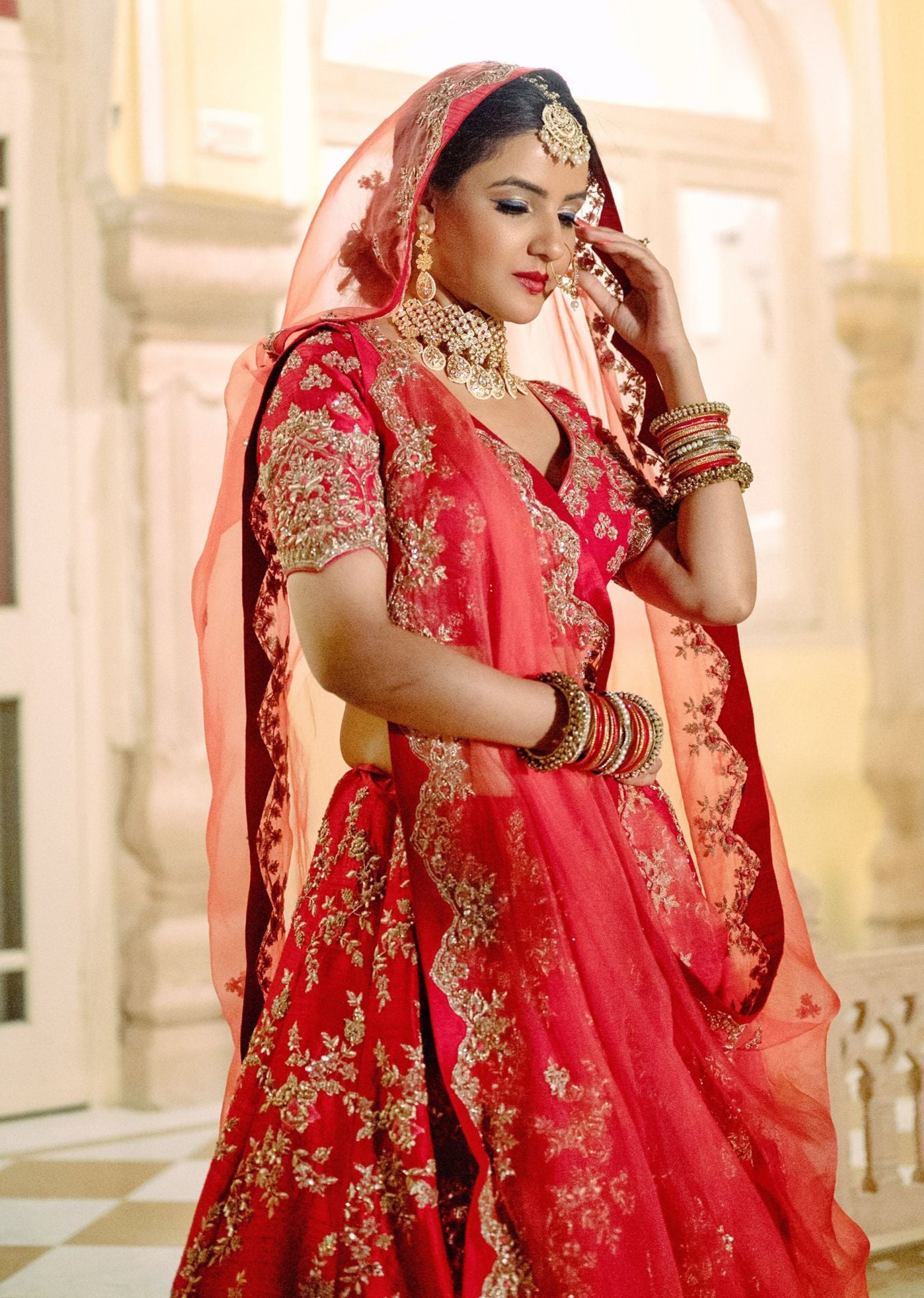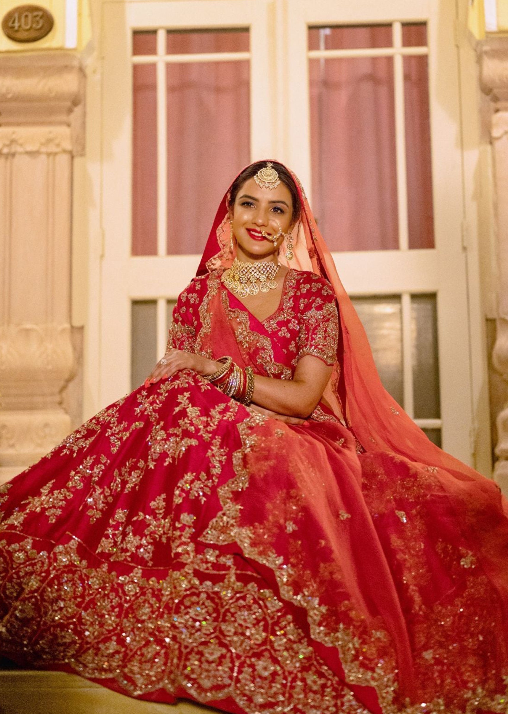 Classic red silk lehenga choli embroidered with intricate blossoming motifs in zardozi and sequins; paired with a red organza embroidered dupatta.
