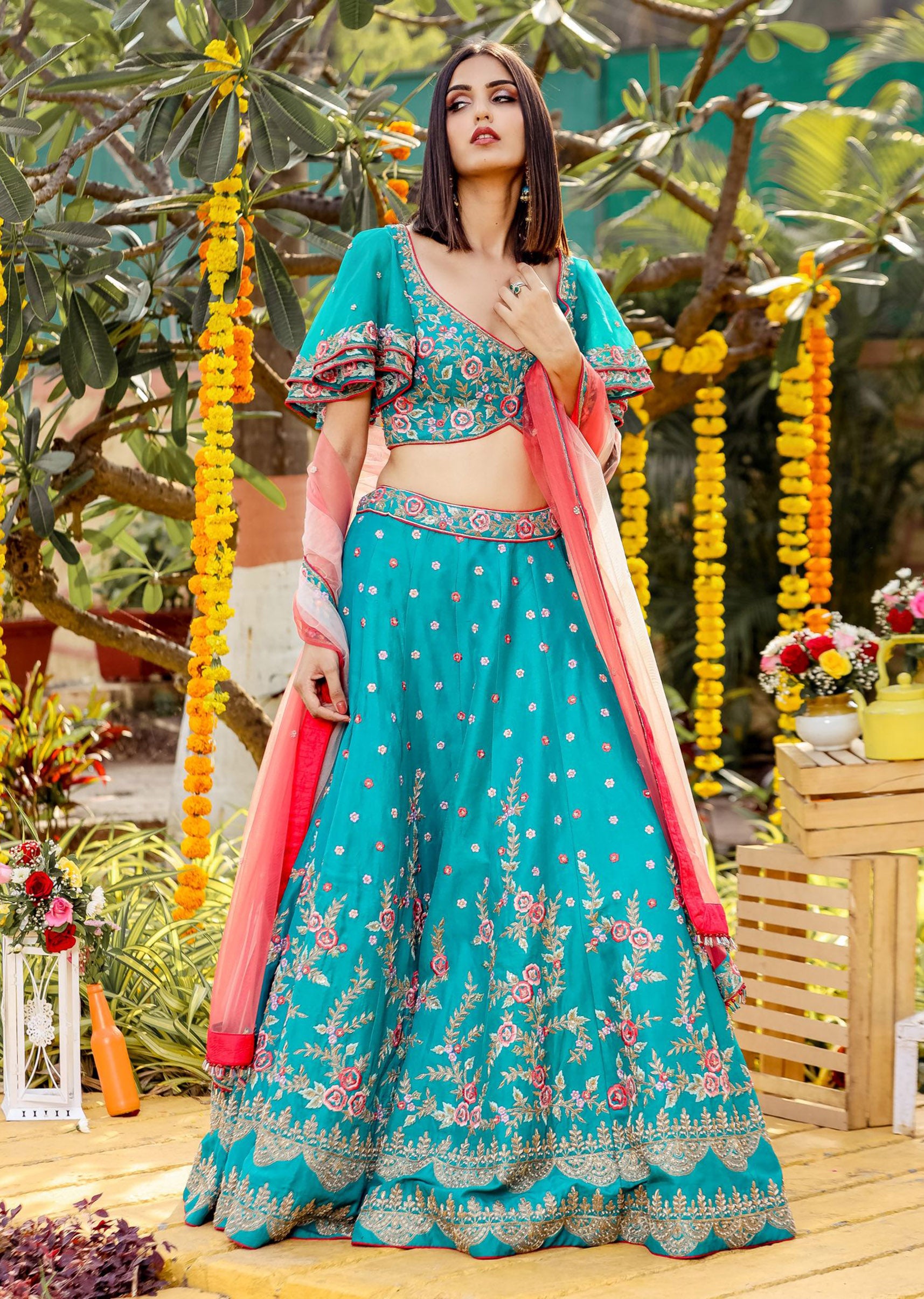 Teal green silk lehenga choli with georgette bell sleeves embroidered in multicolored resham and zardozi; paired with an ombre pink coral net dupatta.