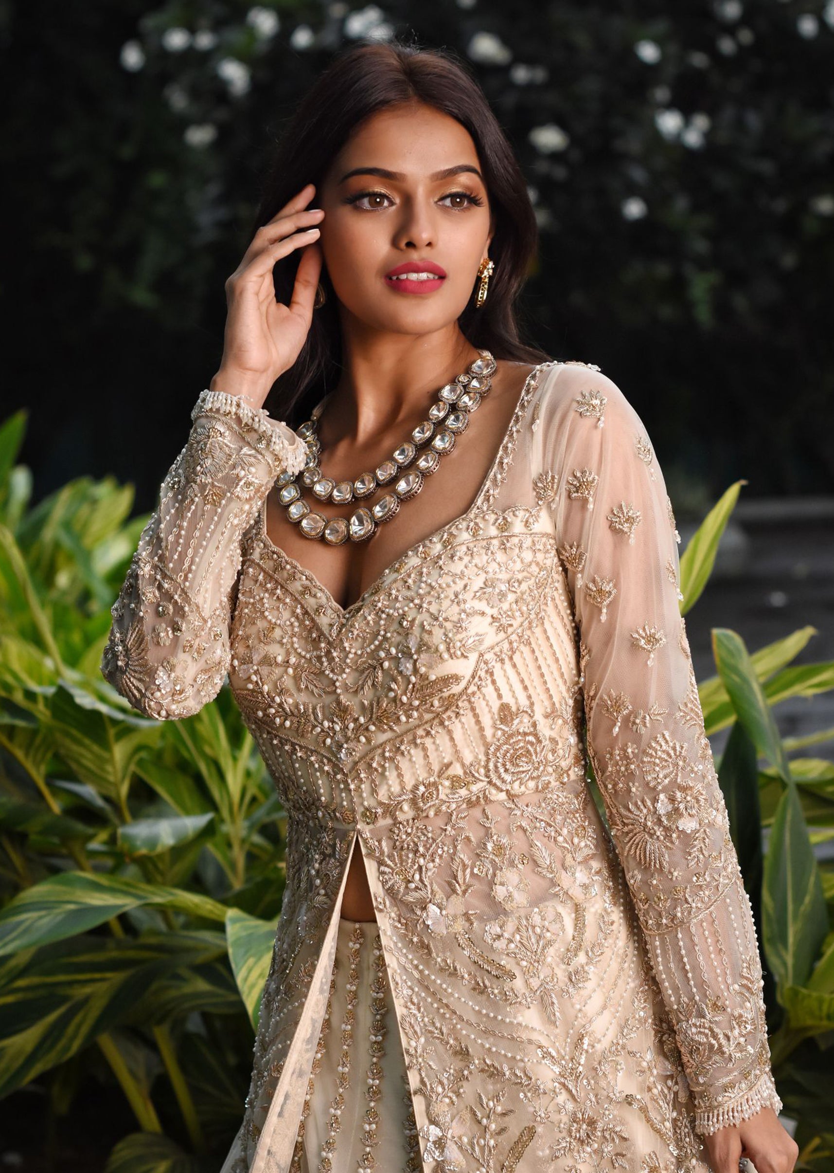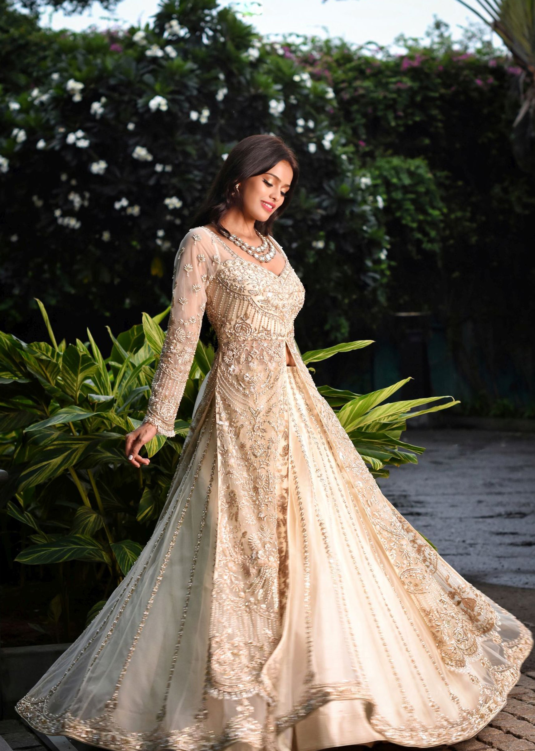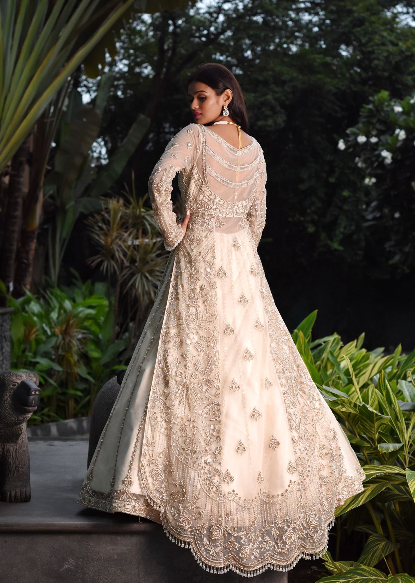 Ivory net anarkali, lehenga, dupatta with floral mughal motifs in light gold zardozi, pearls and sequins.