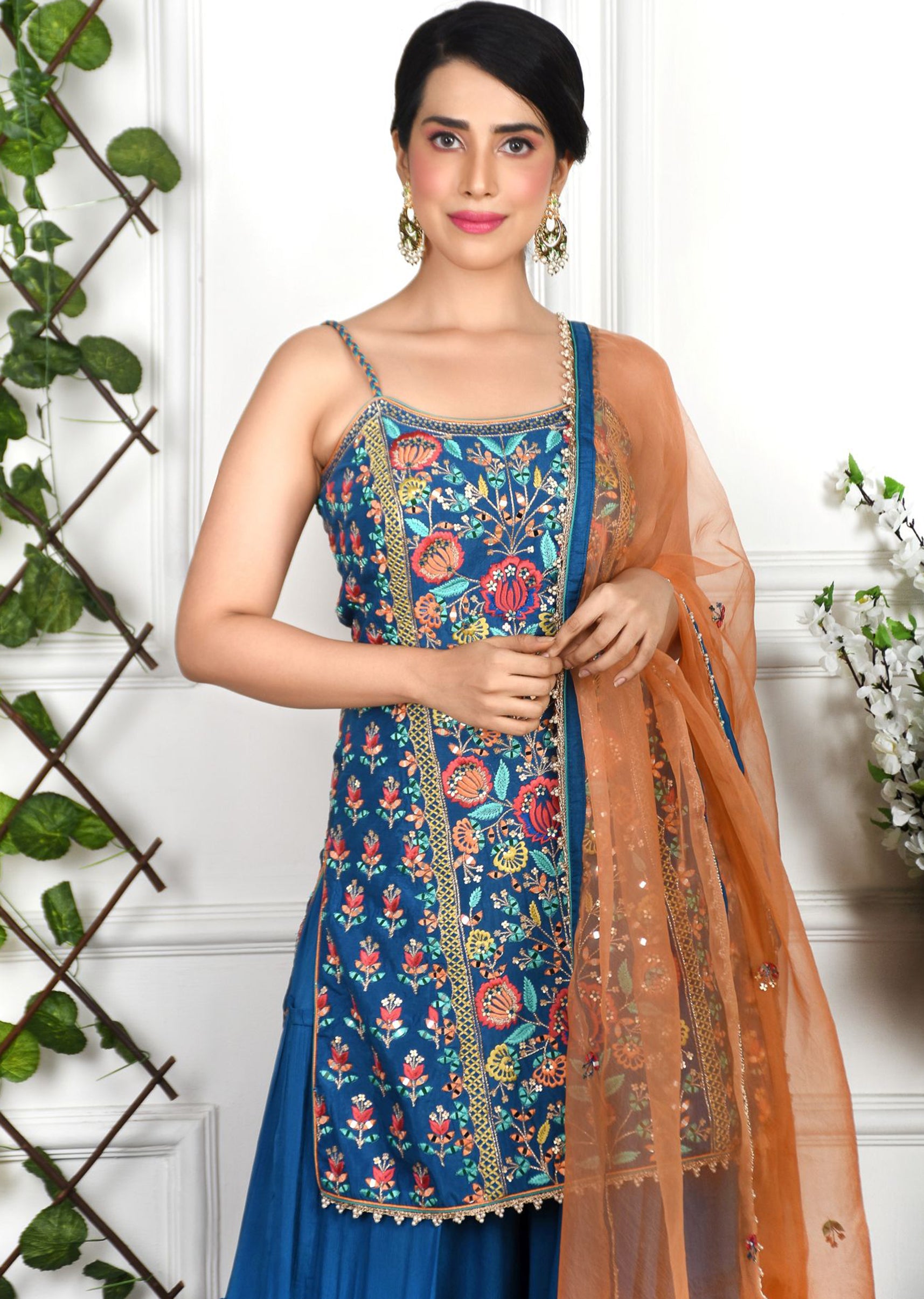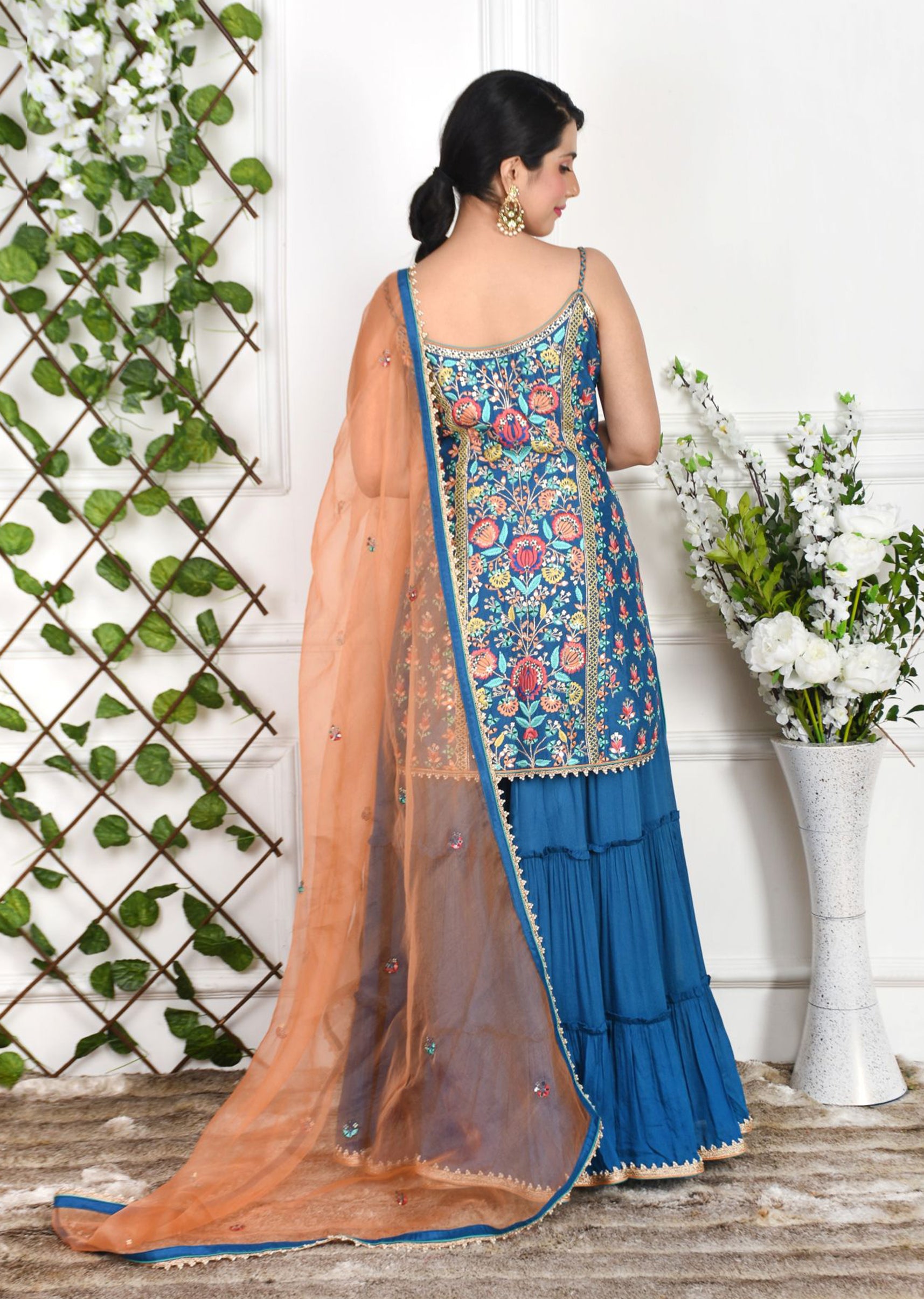 Royal blue silk kurta embroidered in multicolor resham mirrorwork, royal blue chiffon tiered sharara and peach organza dupatta with embroidered buttis.