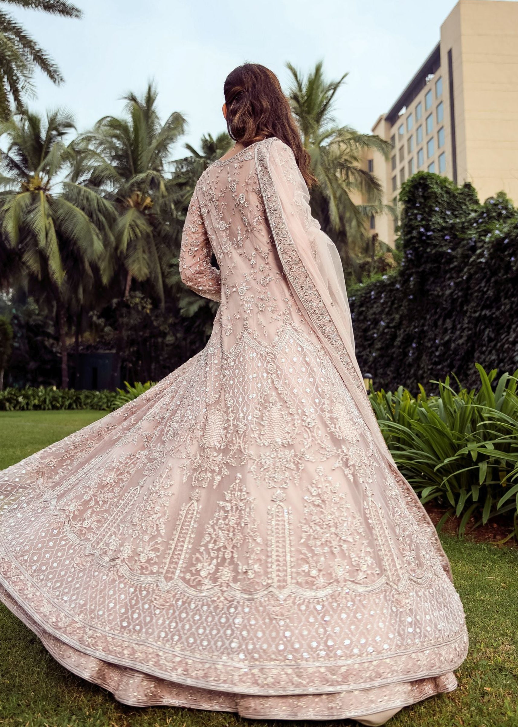 Blush rose silk anarkali with a blush rose net jacket and dupatta embroidered with archaic lattice and mughal floral motifs in rose gold and self zardozi.