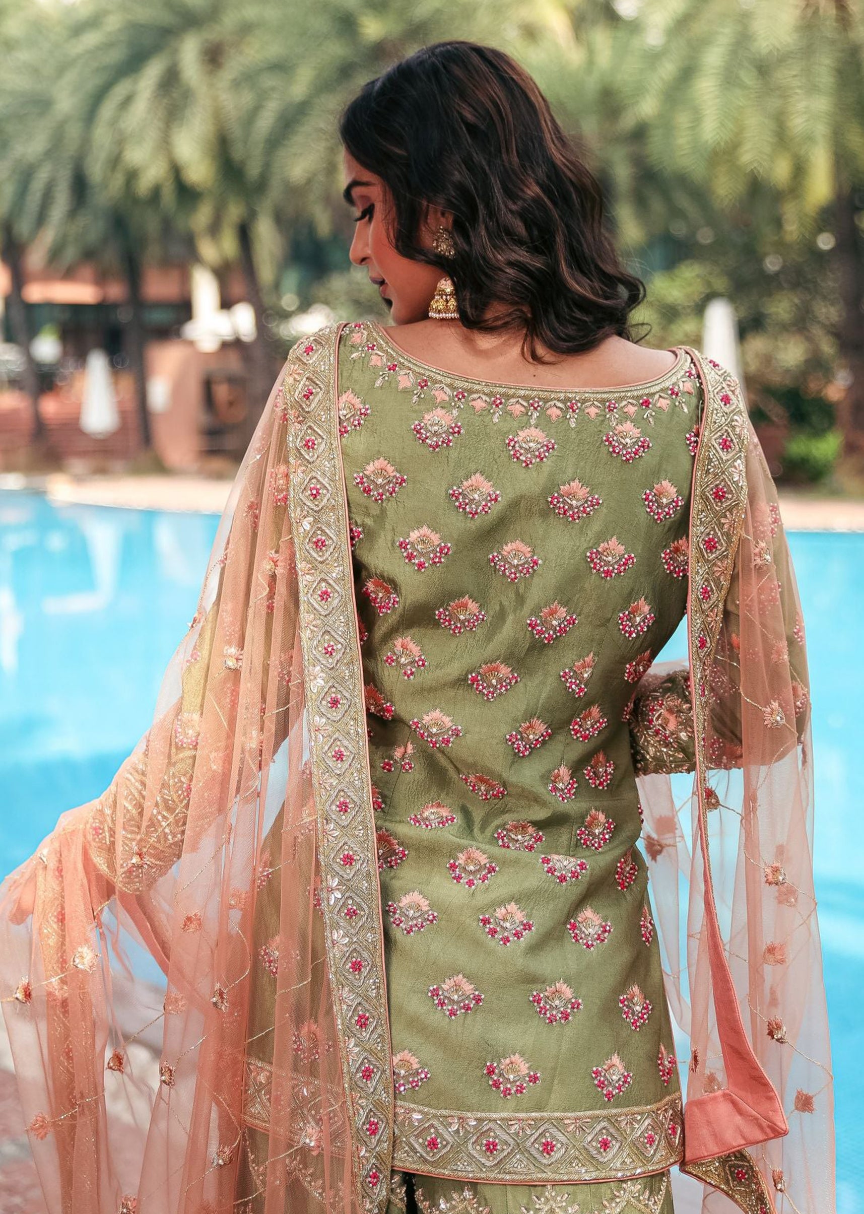 Olive green silk kurta and sharara embroidered in intricate buttis with resham, zardozi and pearls; paired with a peach net dupatta embroidered with zardozi and resham buttis.