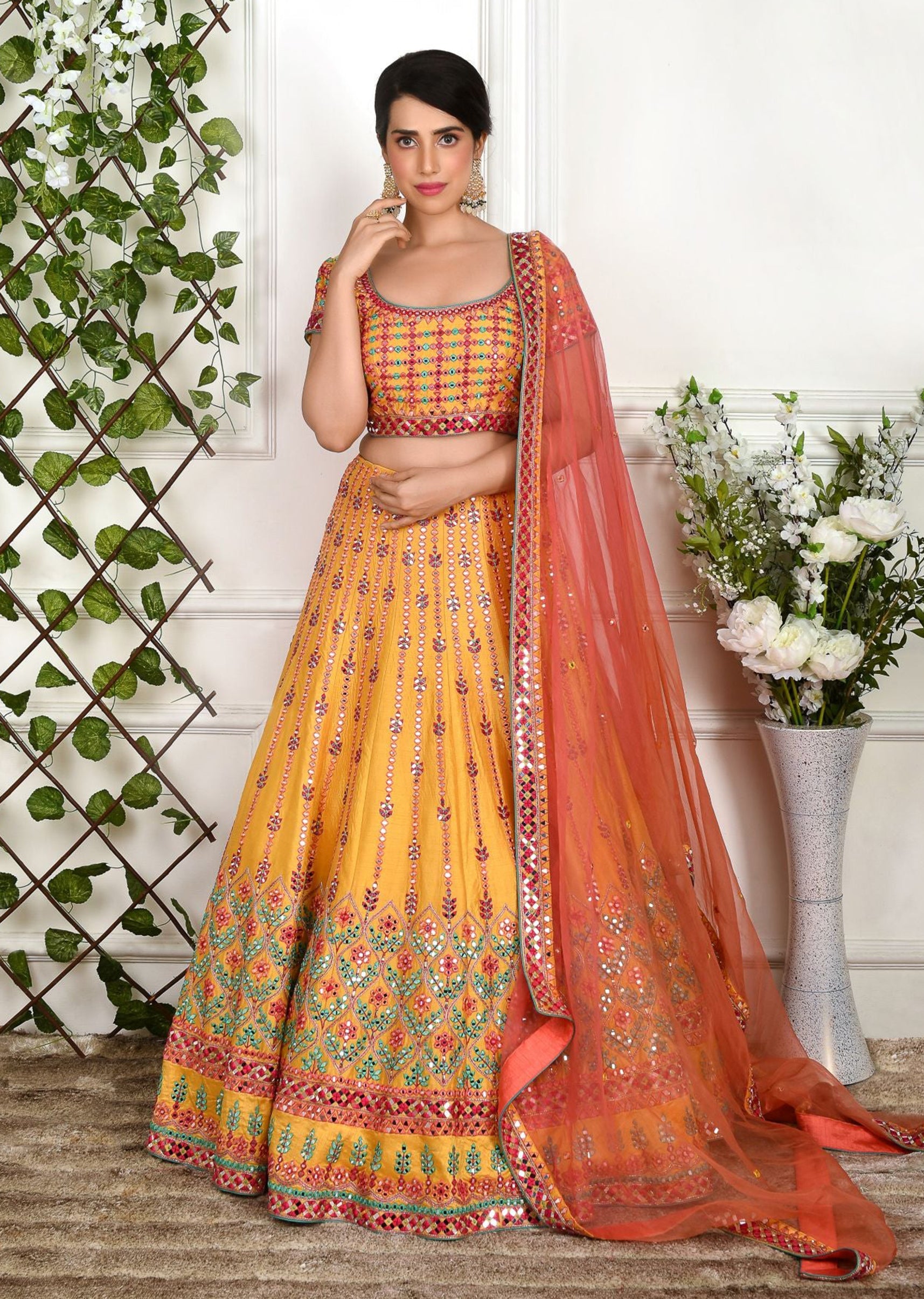 Mustard yellow silk lehenga choli with resham and mirrorwork with a coral pink organza dupatta with mirrorwork borders and buttis.