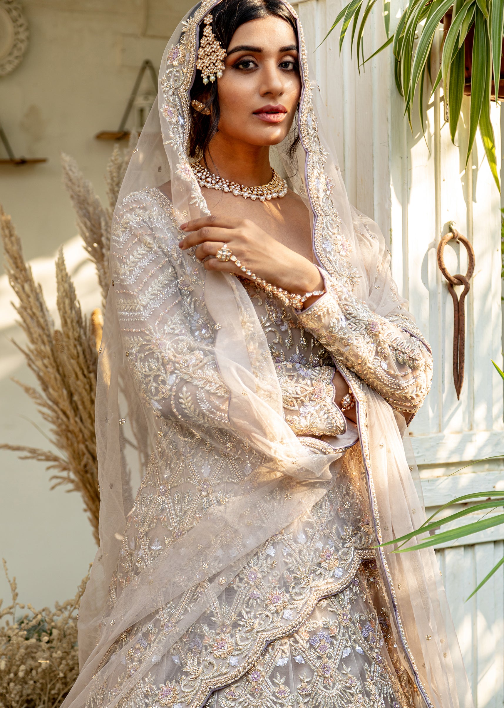 Ash lavender net anarkali embroidered with persian carpet motifs in zardozi, sequins, crystals and beads; paired with an ash lavender organza embroidered dupatta.