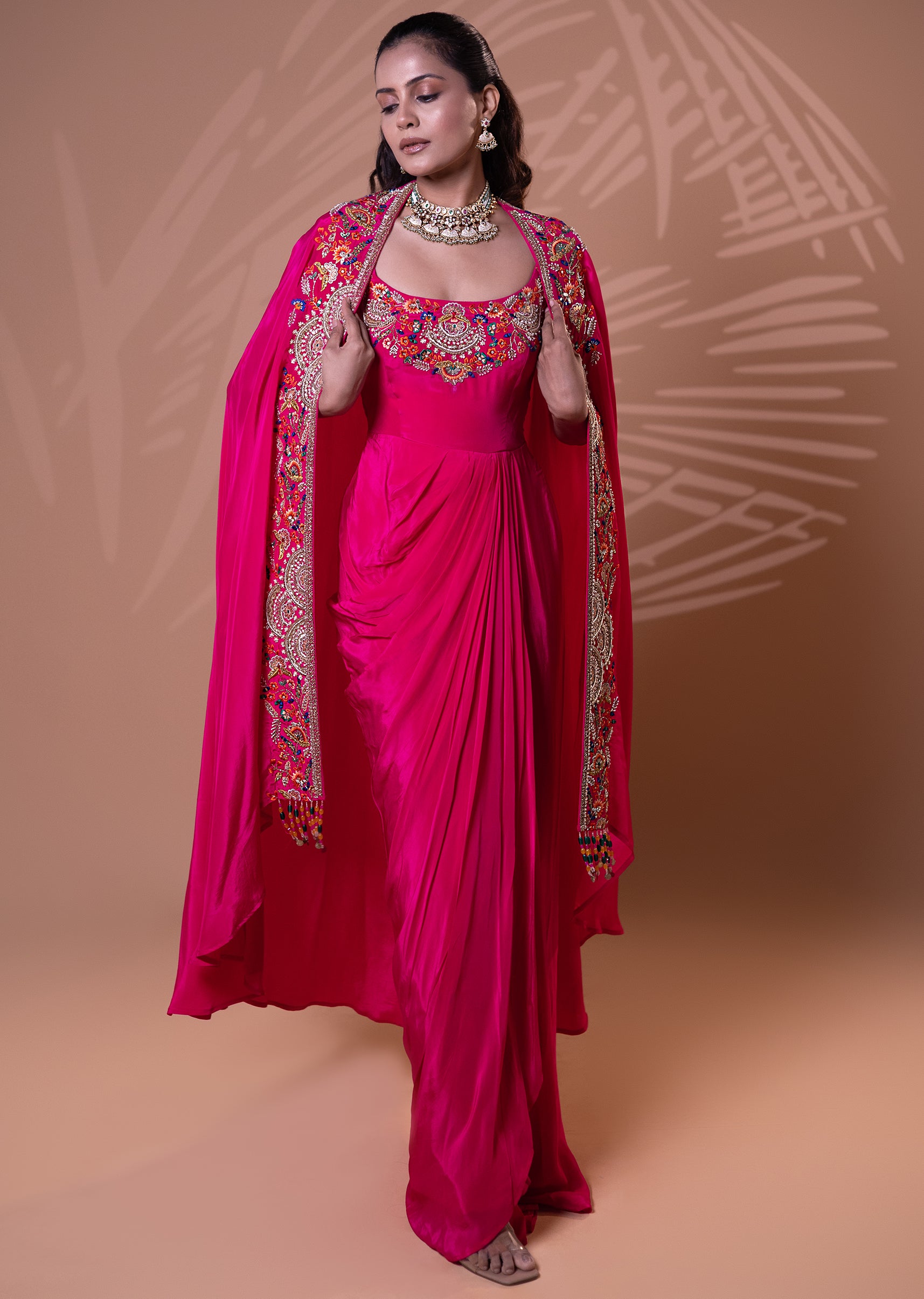 Rani pink gown with intricate embroidery on the bodice, paired with a statement cape featuring detailed gold work