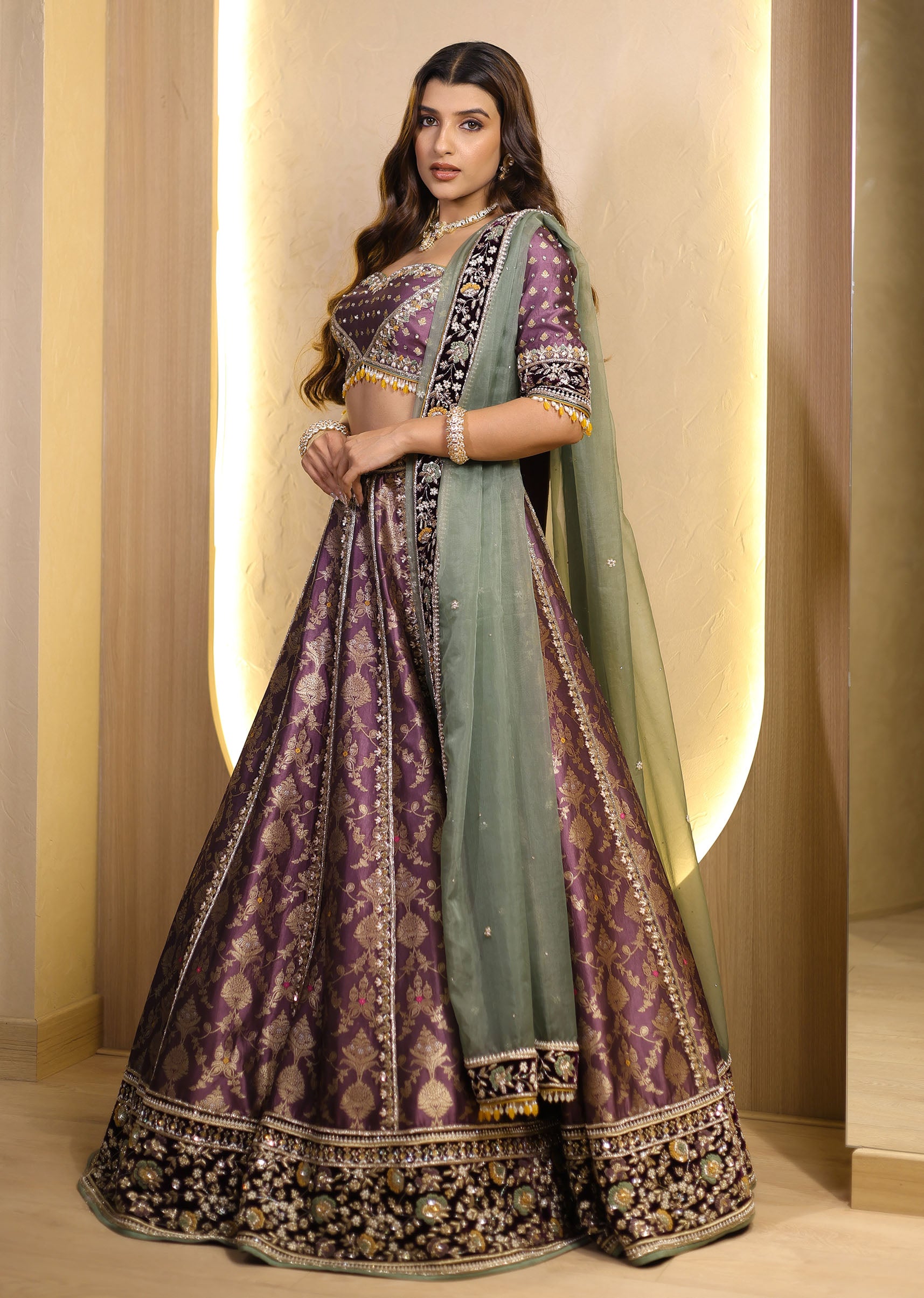 Aabha is a graceful blend of tradition and elegance. Crafted in a rich purple base with intricate zari and resham embroidery, this lehenga exudes understated grandeur. The sage green dupatta, detailed with an ornate embroidered border, adds a soft contrast, making it a perfect choice for intimate celebrations and special occasions.