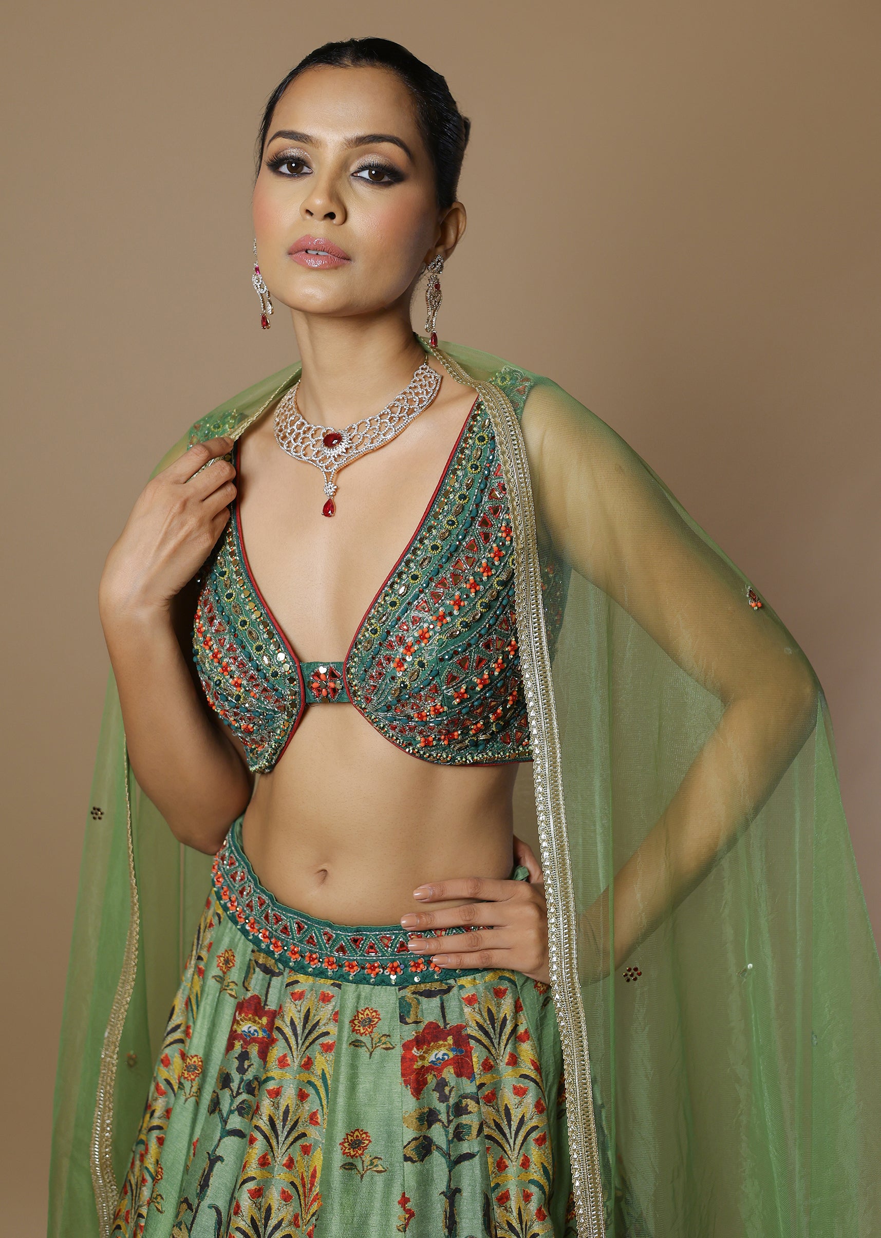 Sage green lehenga featuring multicolour floral print detailing paired with a contrasting dark green mirror work blouse