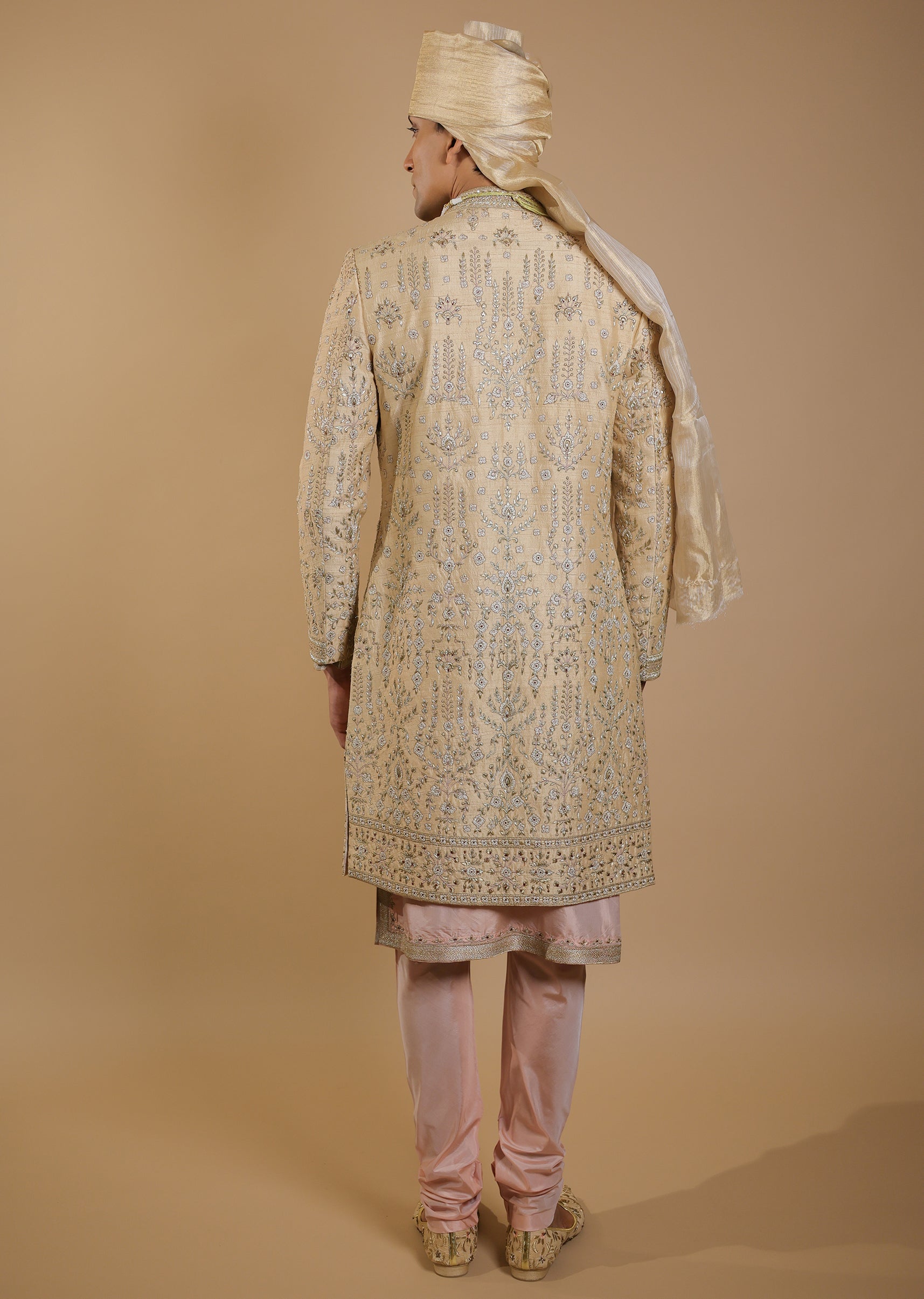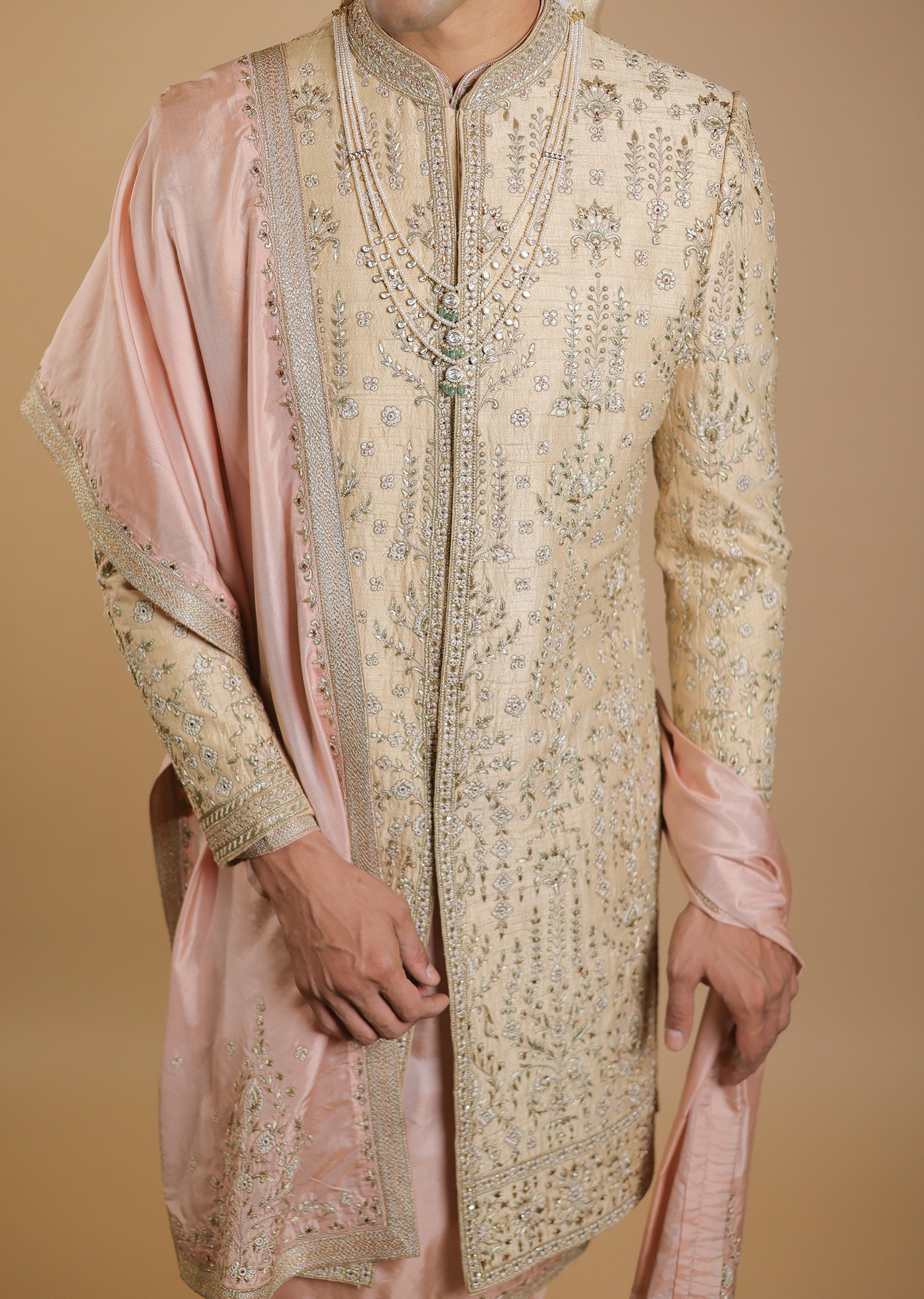 gold raw silk hand work & machine work peach kurta & dupatta sherwani trousers