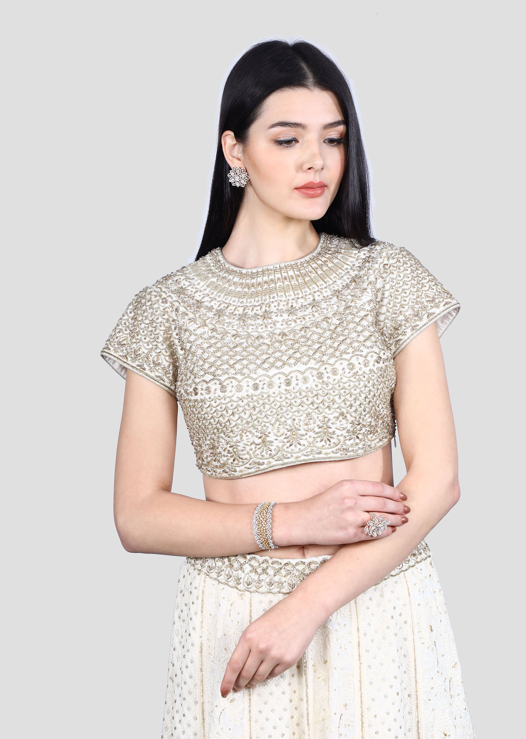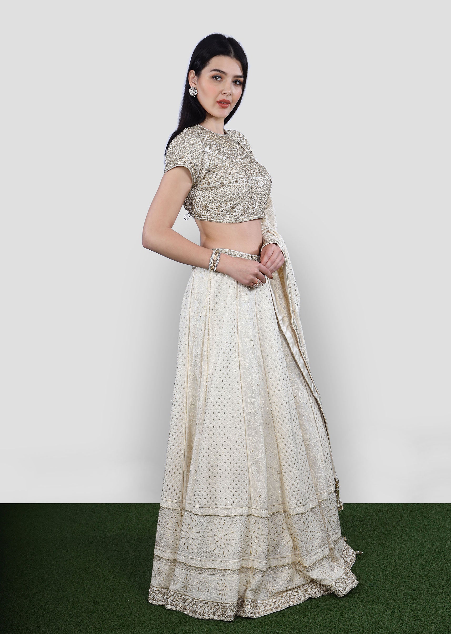 Intricate ivory chikankari lehenga and dupatta with an ivory light gold zardozi embroidered choli