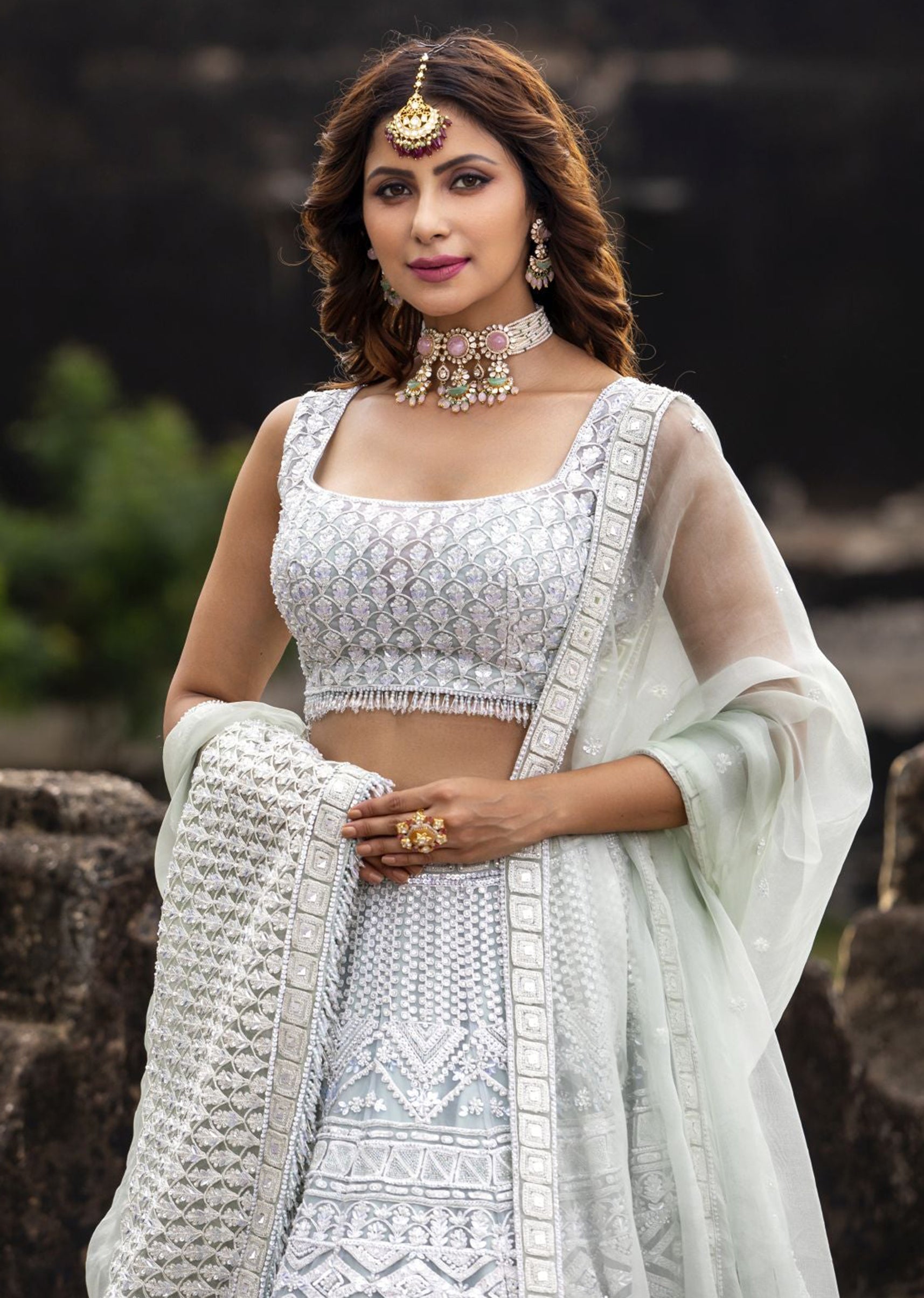 Pista green Lehenga choli with off white dori work and sequin embroidery along with a net dupatta.