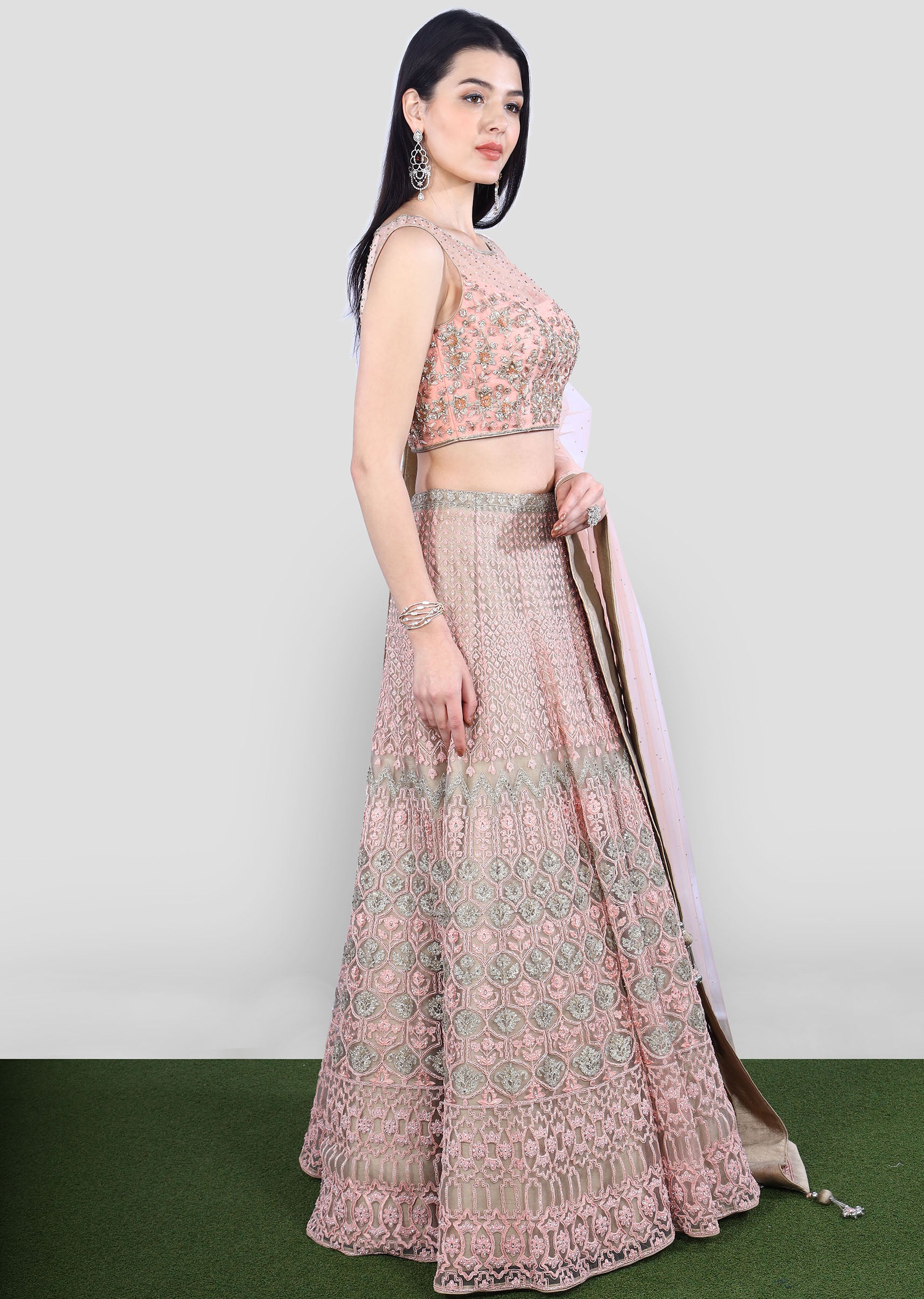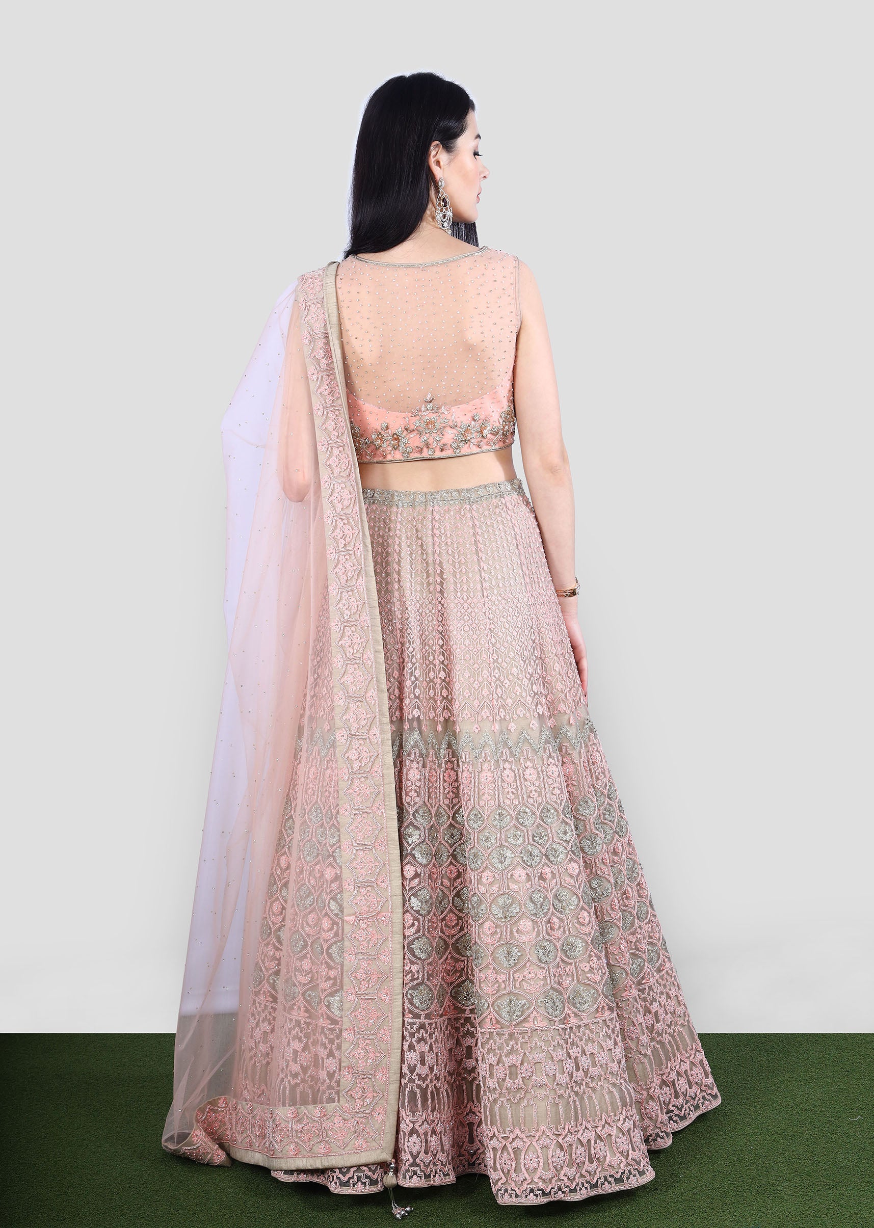 Peach multicolor pastel resham embroidered net lehenga, choli and dupatta