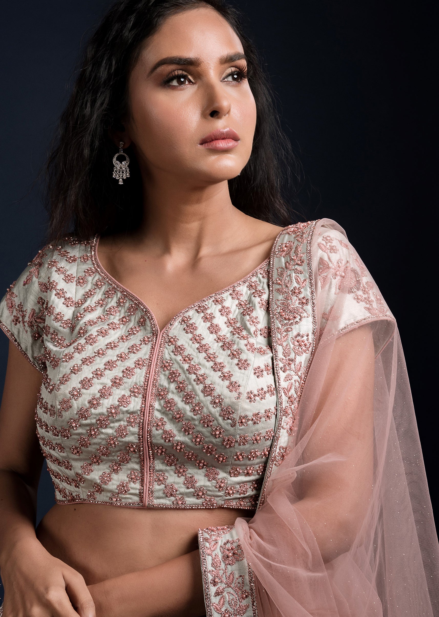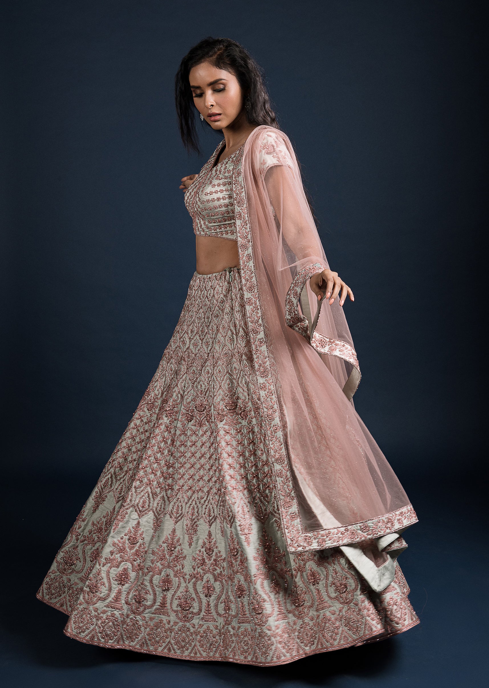 Ice blue grey raw silk lehenga choli with all over floral designs rust pink zardozi embroidery; paired with a rouge pink bordered net dupatta.