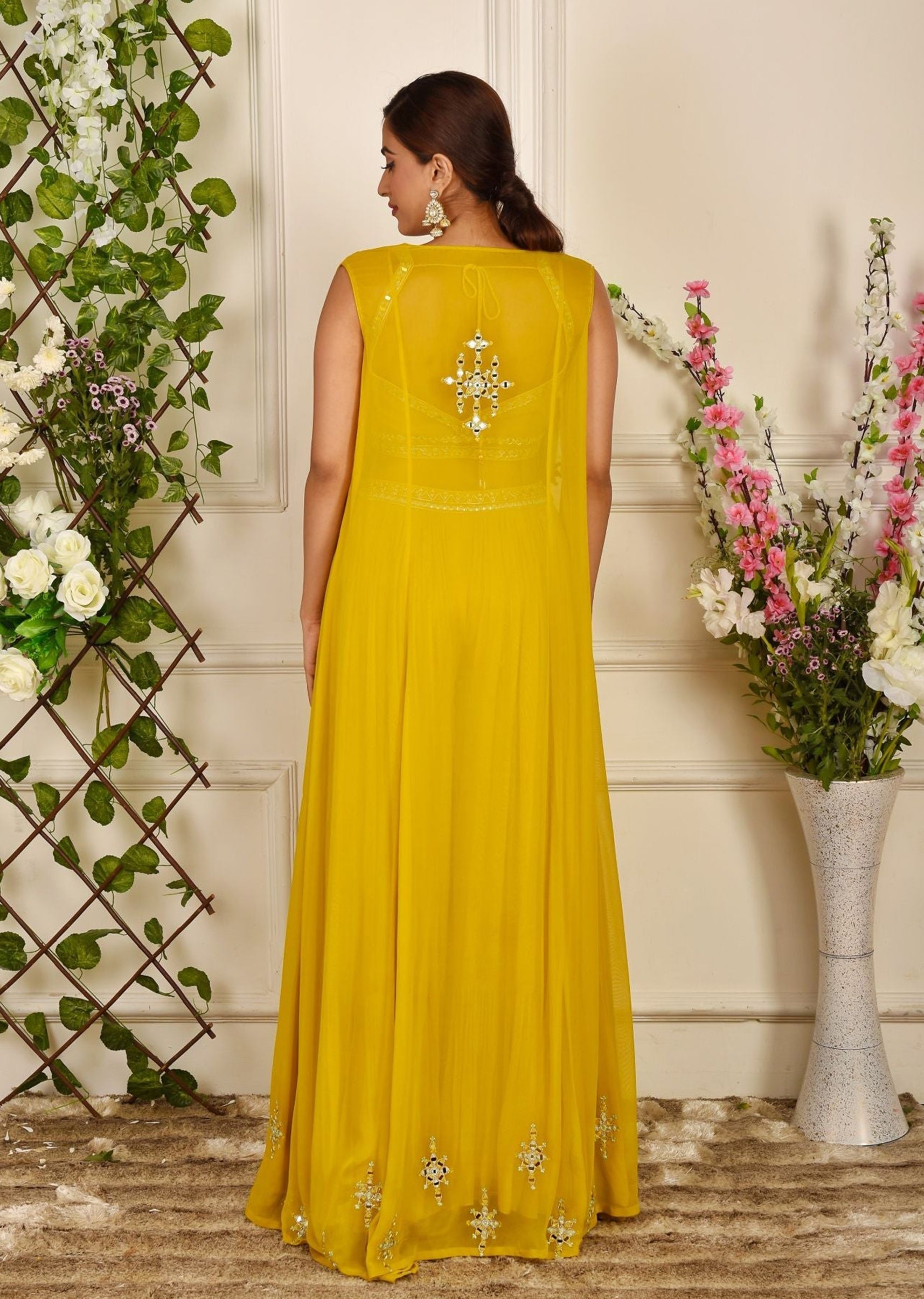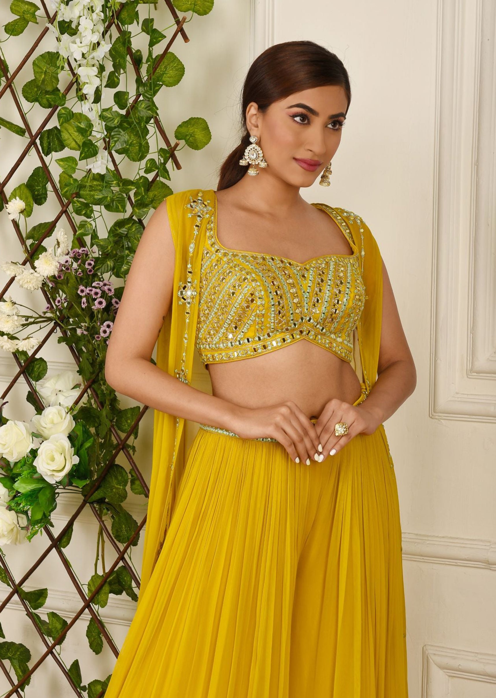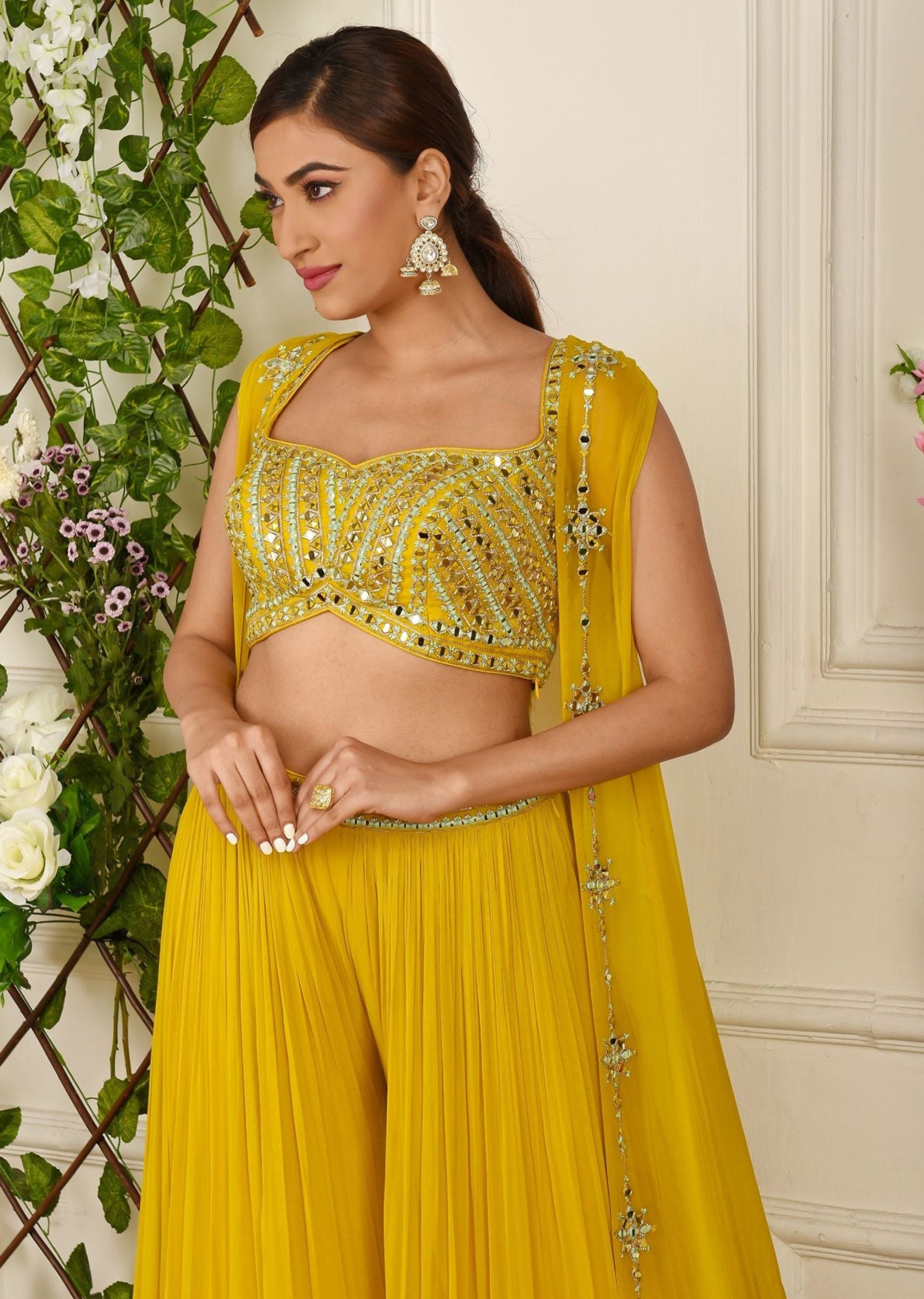 Haldi yellow georgette palazzo sharara, choli and jacket embroidered in mirrorwork.